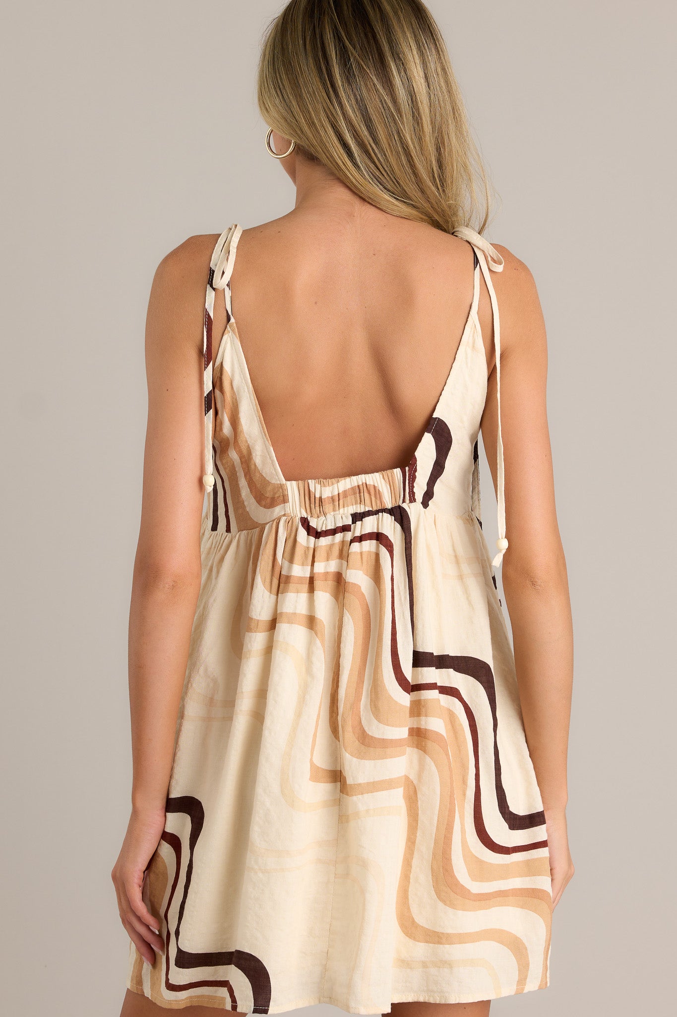Stay cool and stylish in our Desert Mirage Beige Multi Print Mini Dress! This playful dress features a unique print, ensuring you stand out from the crowd. With its lightweight fabric, you can stay comfortable while turning heads. Perfect for any occasion, this dress adds a touch of fun to your wardrobe. This beige mini dress features a square neckline, thin self-tie straps, an elastic back insert, an abstract pattern, and a flowing silhouette.