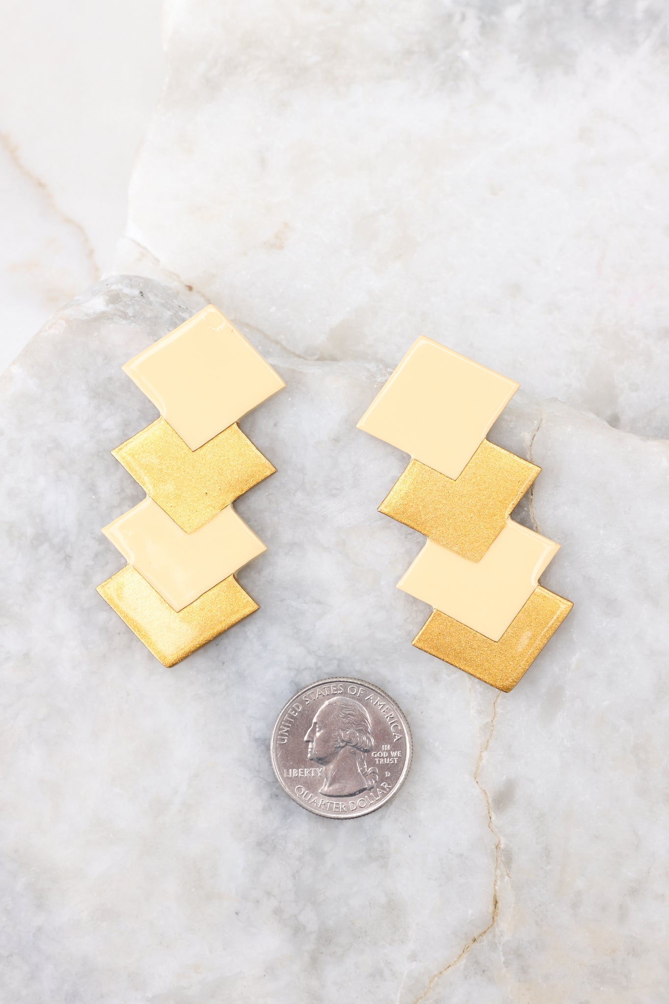Travel around the world with ease with the Different Time Zone Gold Earrings! Their gold and beige diamond-shaped design make them glamorous yet subtle enough to wear any time of day. The perfect accessory for jet-setters and armchair travelers alike - you'll never be late for a global meetup again! Earrings feature gold & beige diamond shape layering and a secure post backing. Earrings measures 2.5" • Imported