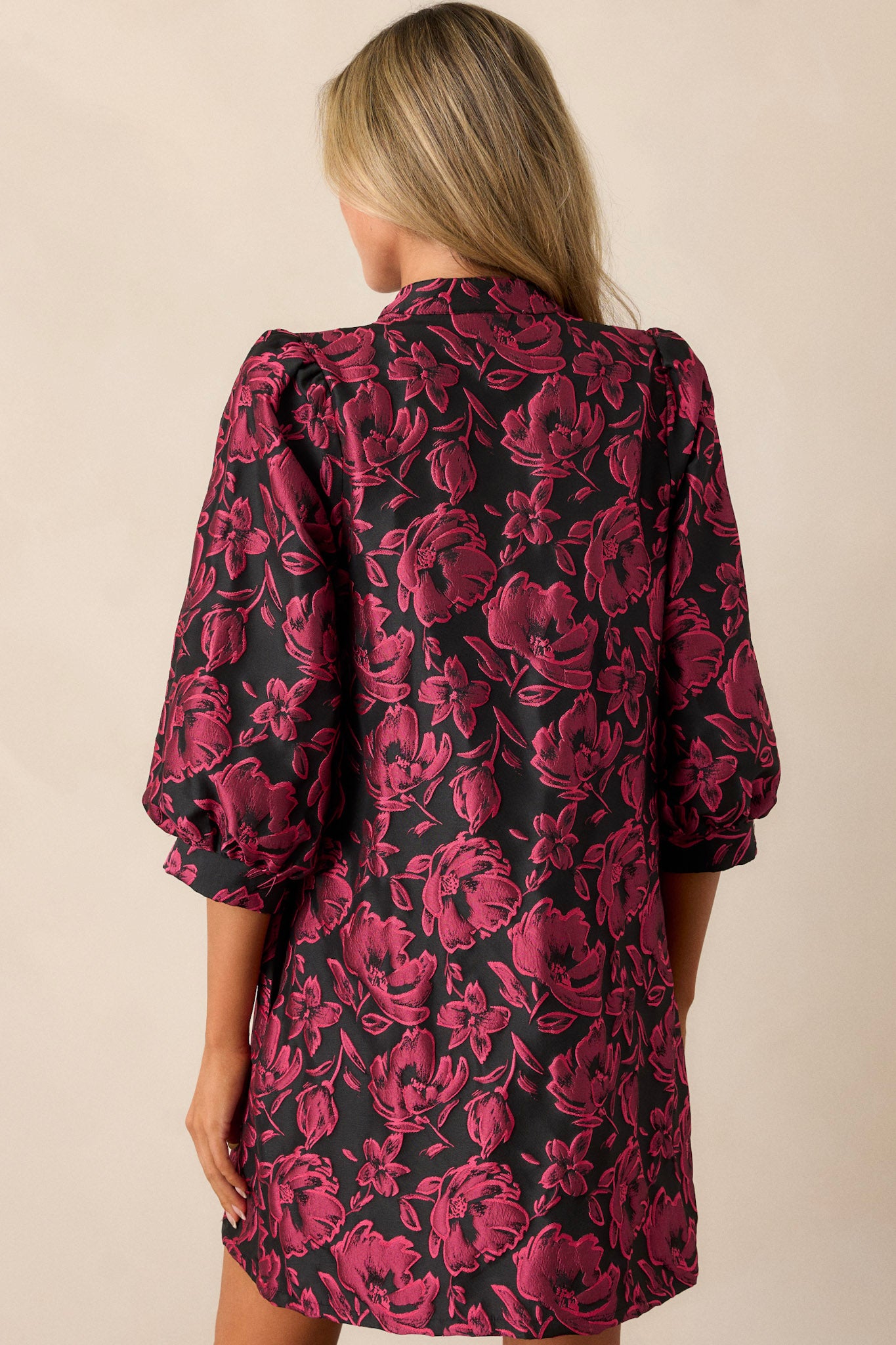Flaunt your style in our Divine Ways Dark Fuchsia Floral Jacquard Mini Dress. The intricate jacquard design adds depth to this mini dress, making it perfect for any occasion. Dress it up or down and stand out from the crowd with this unique piece. This dark fuchsia dress features a split v-neckline, 3/4 length balloon sleeves, a black and pink floral jacquard fabric, and a mini length.