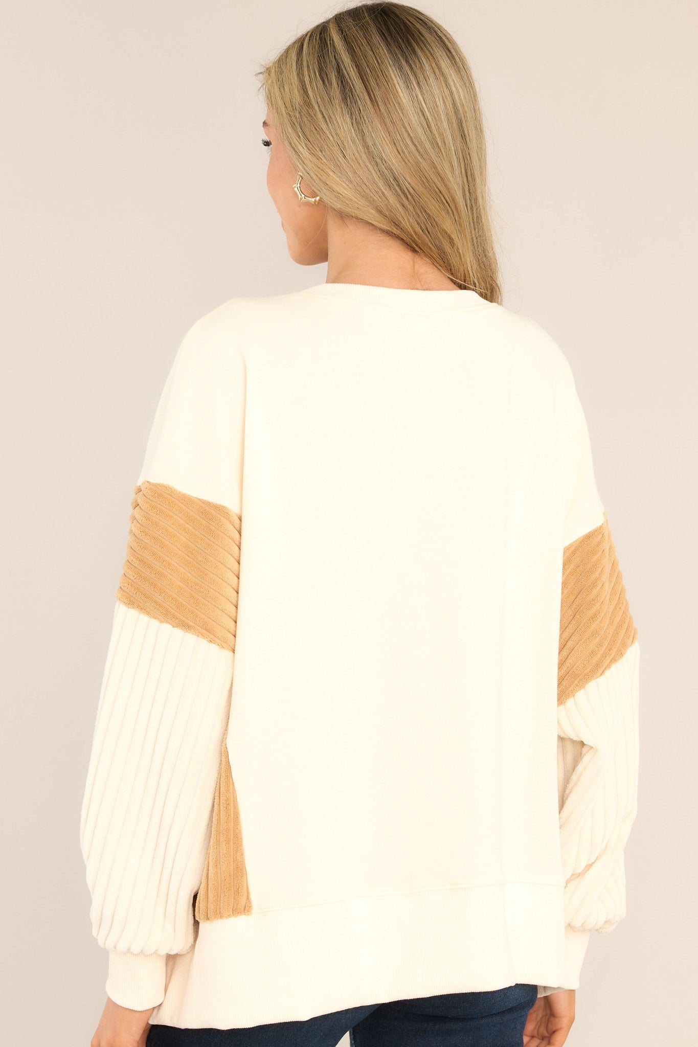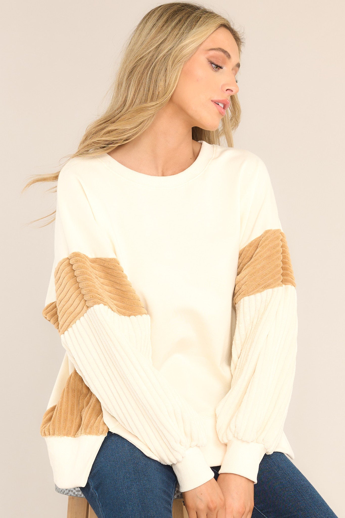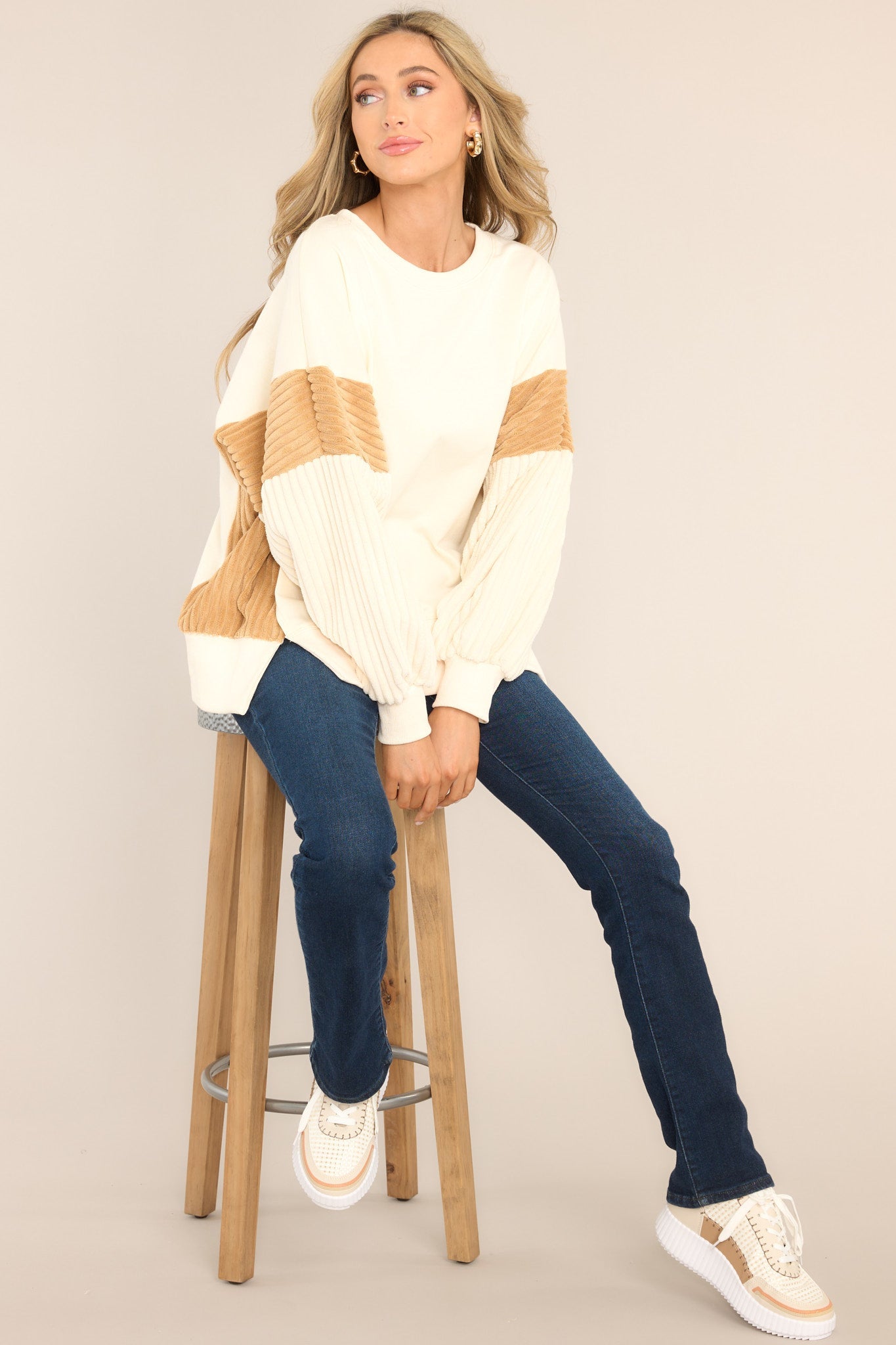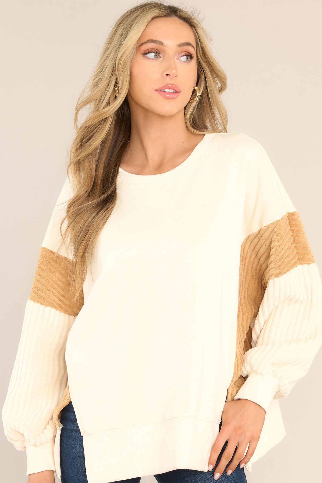 Dream big and stay cozy with our oversized ivory sweatshirt! Made with comfort in mind, this sweatshirt is perfect for lounging, running errands, or chasing your dreams. The relaxed fit and soft material will keep you feeling warm and stylish all day long. Go ahead, dream big in style. This sweatshirt features a ribbed crew neckline, soft & textured detailing on the sleeves and sides, and a split hemline.