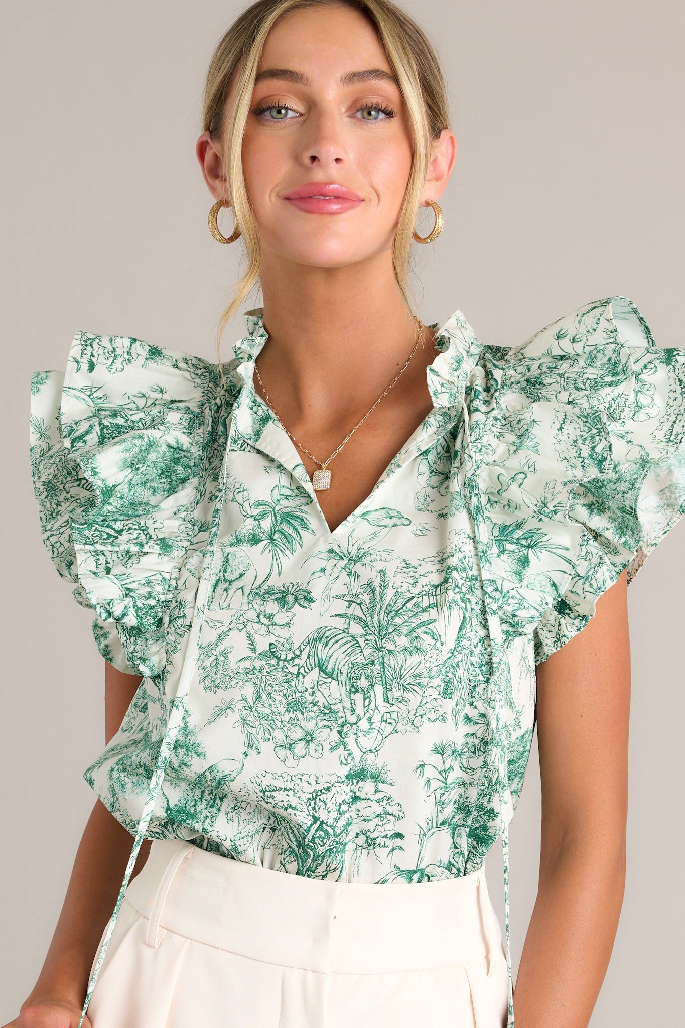 Get lost in a dreamy paradise with our Dreamscape 100% Cotton Green Toile Top. Made with soft, breathable fabric, this top is perfect for a comfortable and stylish look. The green toile design adds a touch of whimsy, making it a must-have for your wardrobe. This green top features a ruffled v-neckline with a self-tie closure, a light weight material, ruffle sleeves, and a toile print.