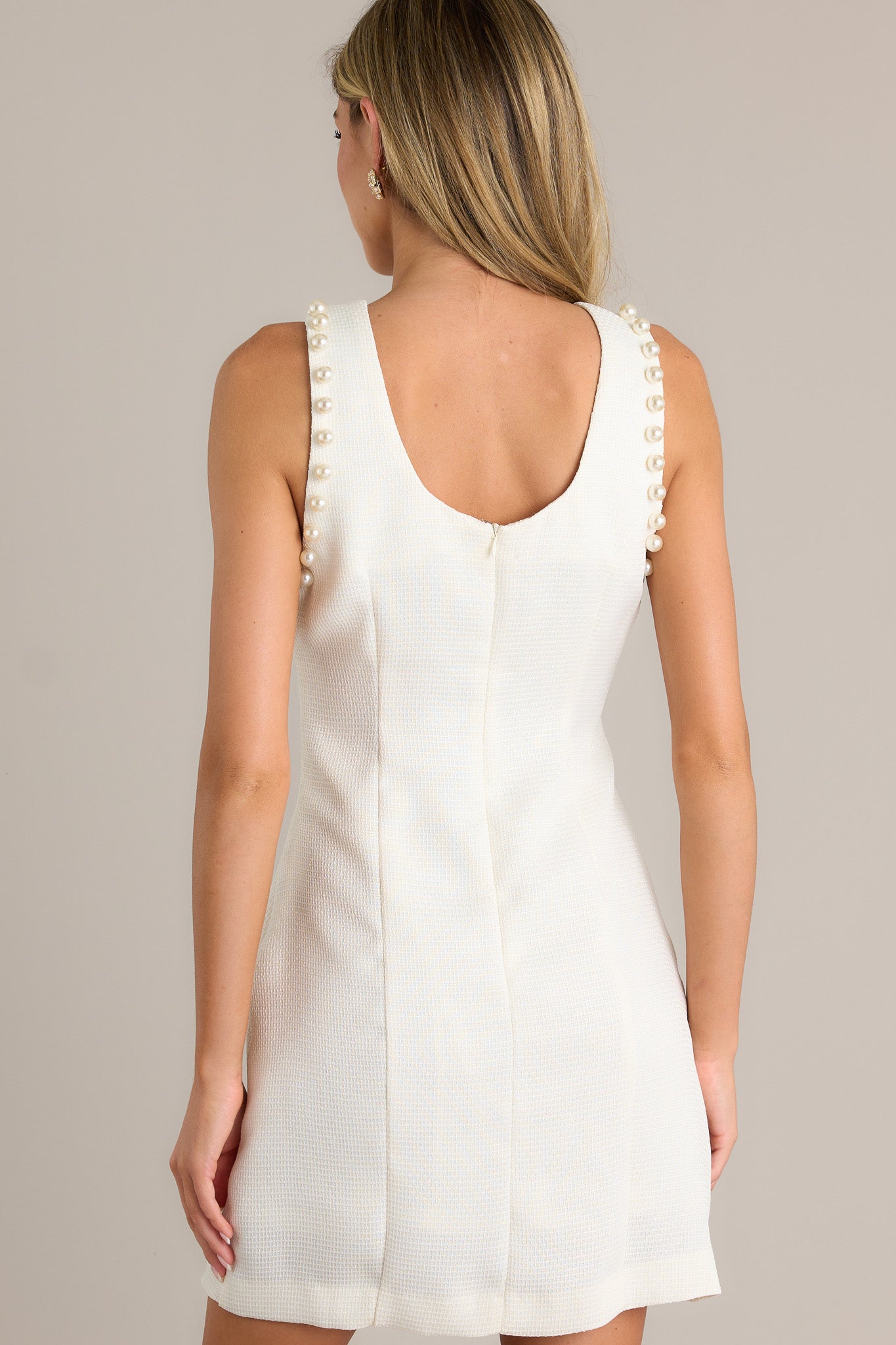 Our Elegance Unveiled Ivory Pearl Mini Dress will have you feeling like a true beauty. The cream pearl detailing adds a touch of elegance to this fun and flirty piece. Perfect for any occasion, let yourself shine in this must-have dress. This dress features a high neckline, pearl details around the sleeves, and a hidden zipper in the back.