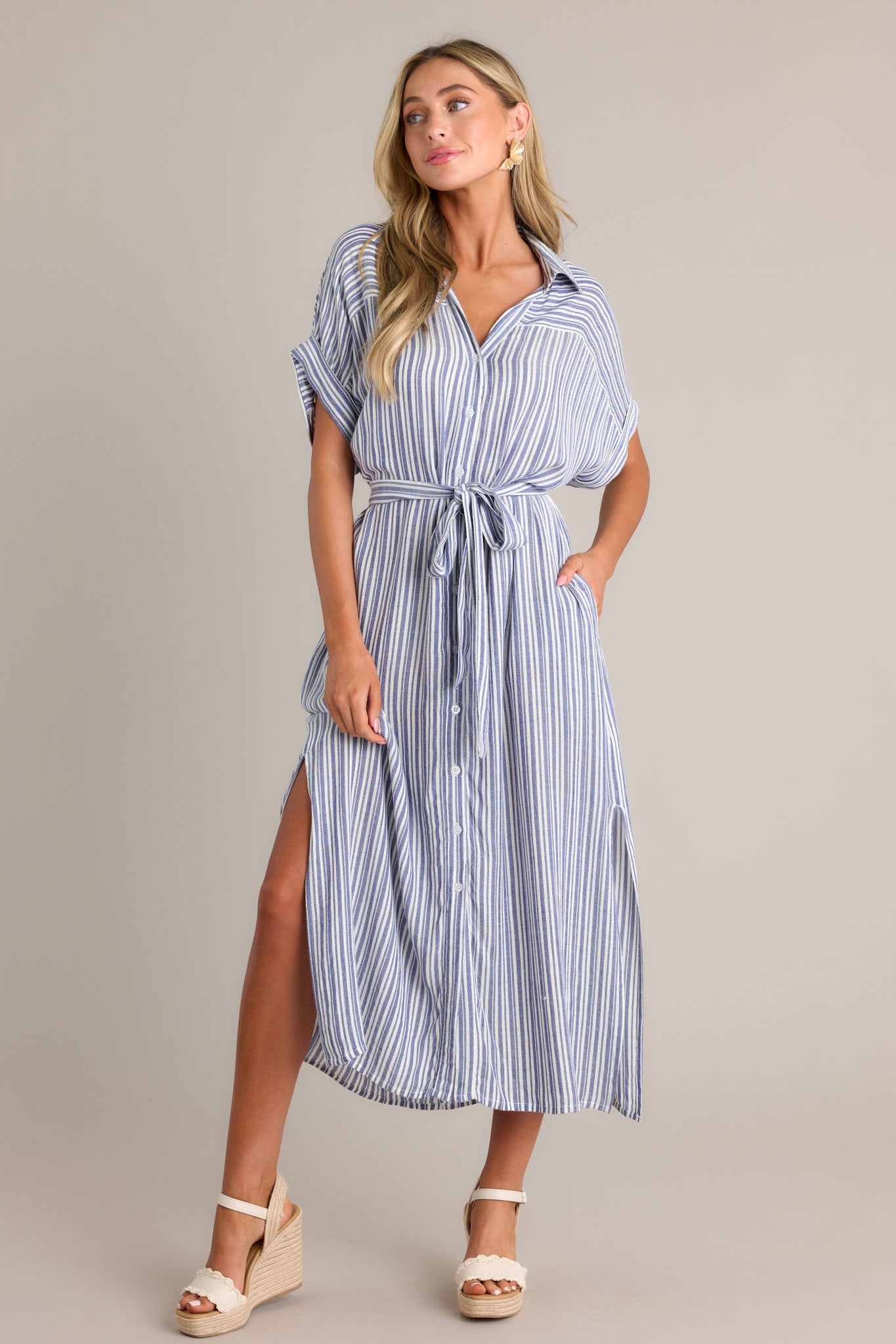 Go bold with the Embrace The Day Blue Stripe Midi Shirt Dress. Flaunt your style with this playful and quirky dress that features a midi length and a stylish blue stripe pattern. Be ready to take on the day with confidence and make a statement wherever you go. This blue stripe midi dress features a collared v-neckline, a functional button front, a self tie drawstring belt, functional pockets, side slits, and a flowing silhouette.