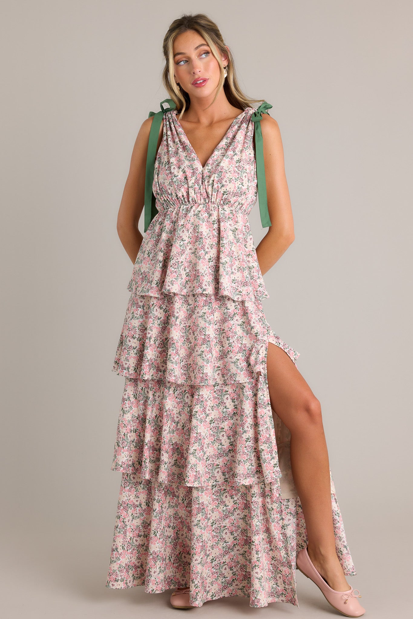 Get ready to be inspired by this Endless Inspiration Pink Multi Floral Tiered Maxi Dress! With its vibrant floral pattern and flowing tiers, this dress is sure to bring a dose of fun and joy to your wardrobe. Perfect for any occasion, it will keep you looking and feeling your best. This pink floral maxi dress features a v-neckline, self-tie shoulder features, an elastic waistline, multiple tiers, a side slit, and a flowing silhouette.