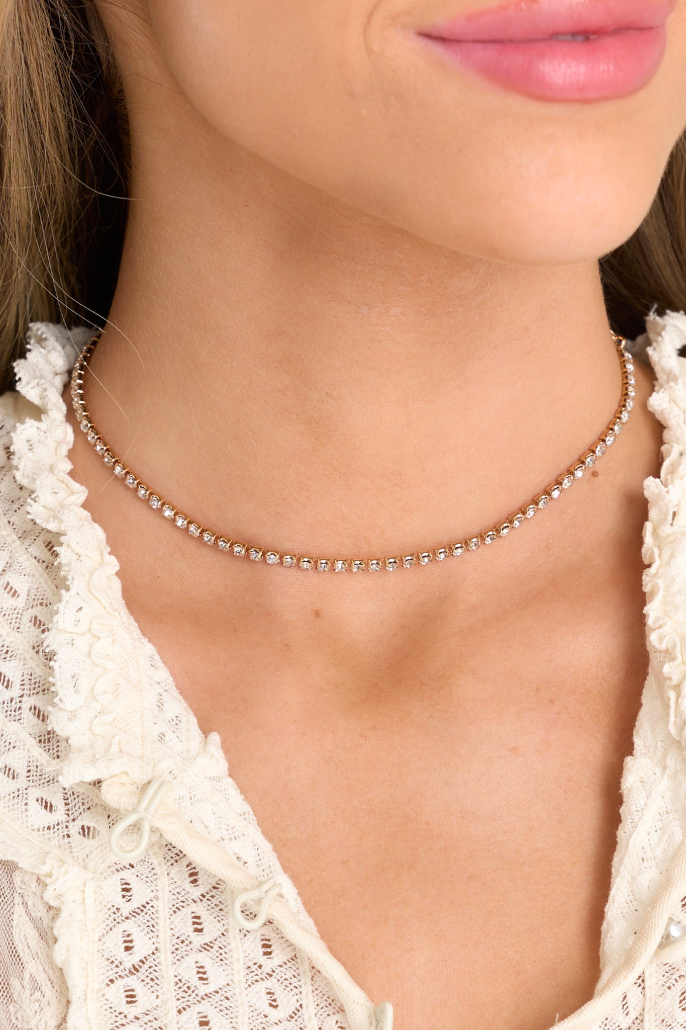 Look like a million bucks wearing this charming Ensemble Grace Gold Choker! Crafted with love in a lovely gold hue, this choker is the perfect fashion accessory for any special occasion. With its lightweight design, you'll feel like you're floating on air! Now you can sparkle and shine in style everywhere you go. This choker features a series of circular rhinestones and a lobster hook closure. • Necklace measures 10.5" with a 3" extender • Imported