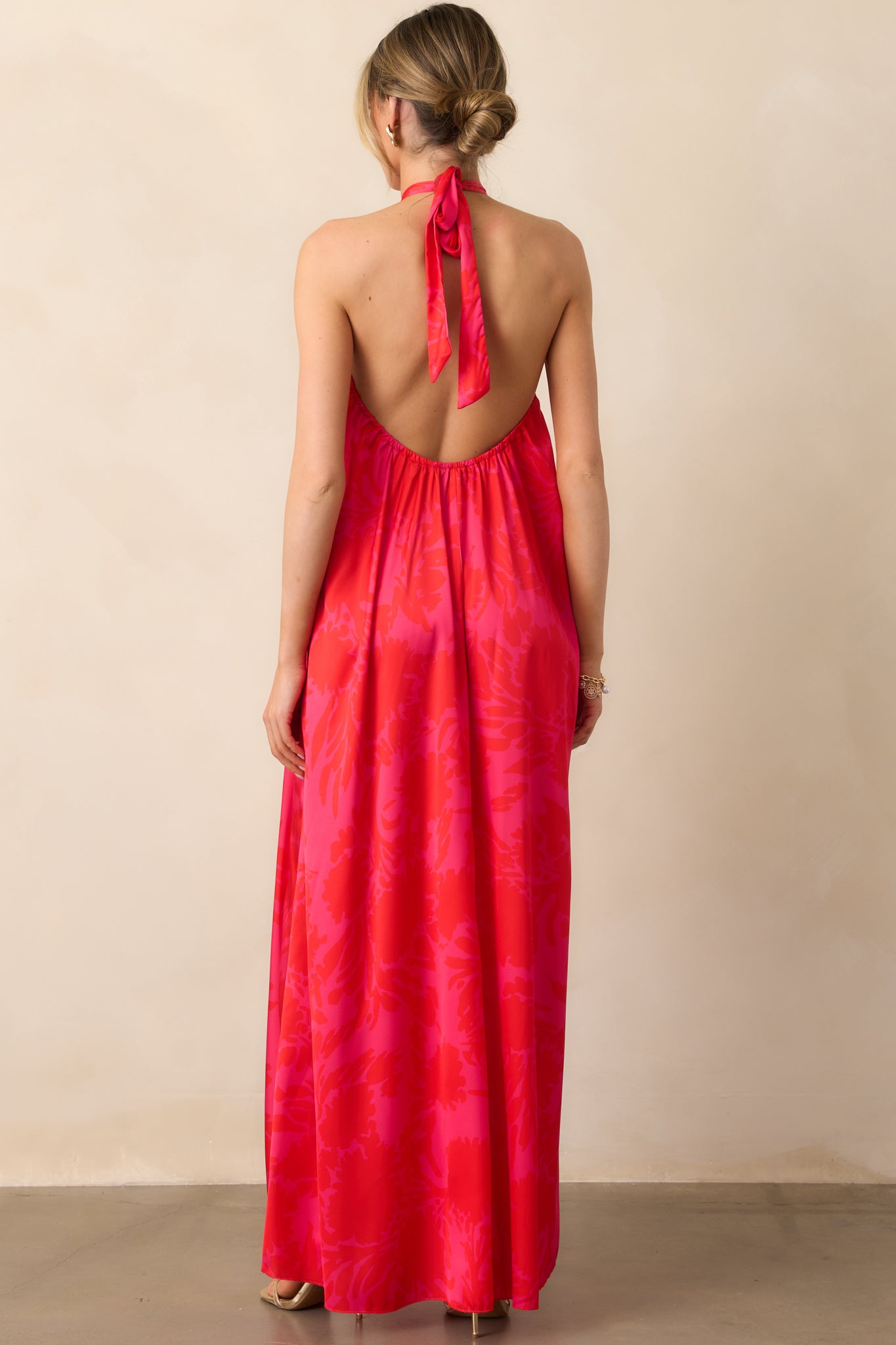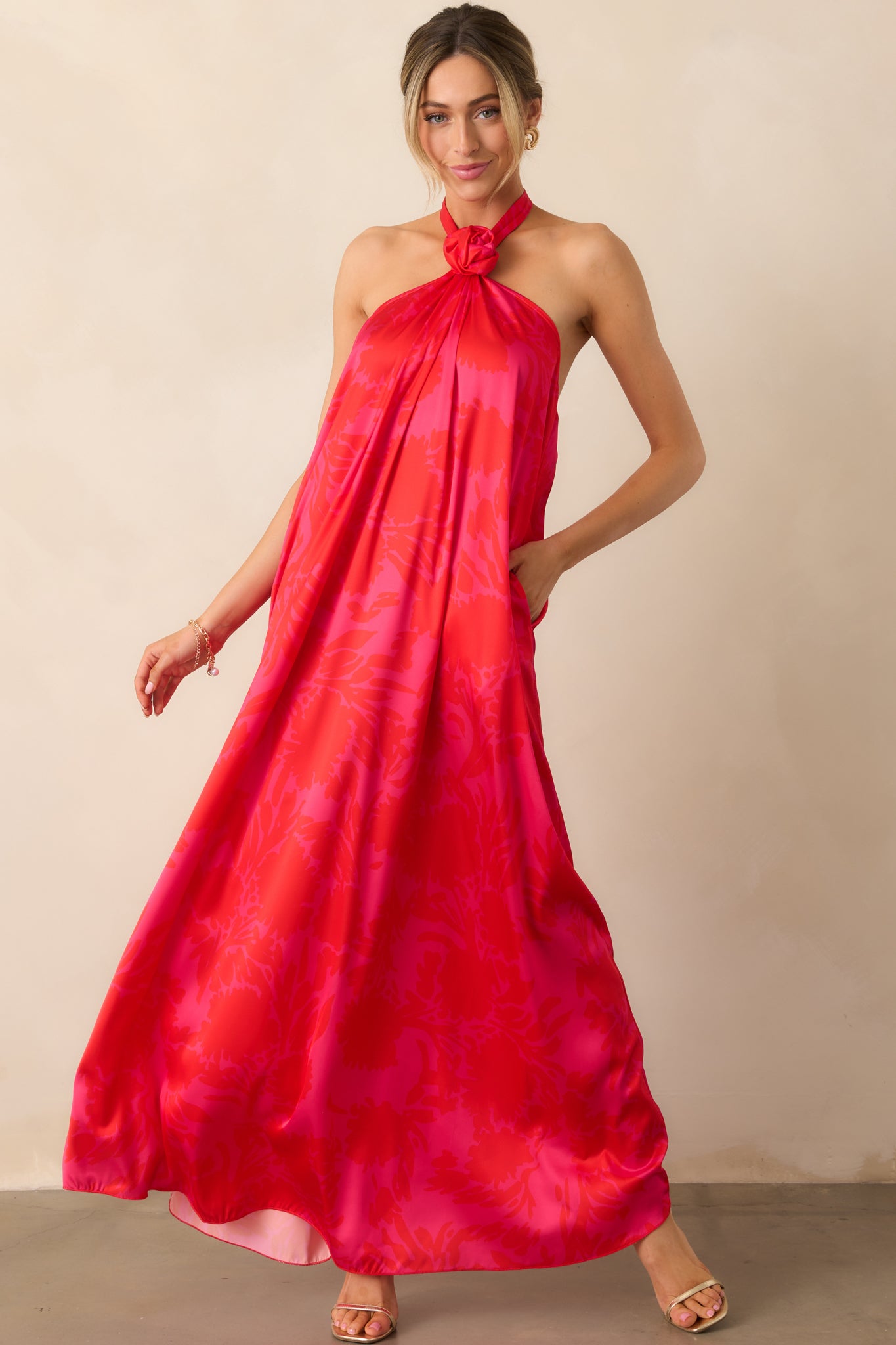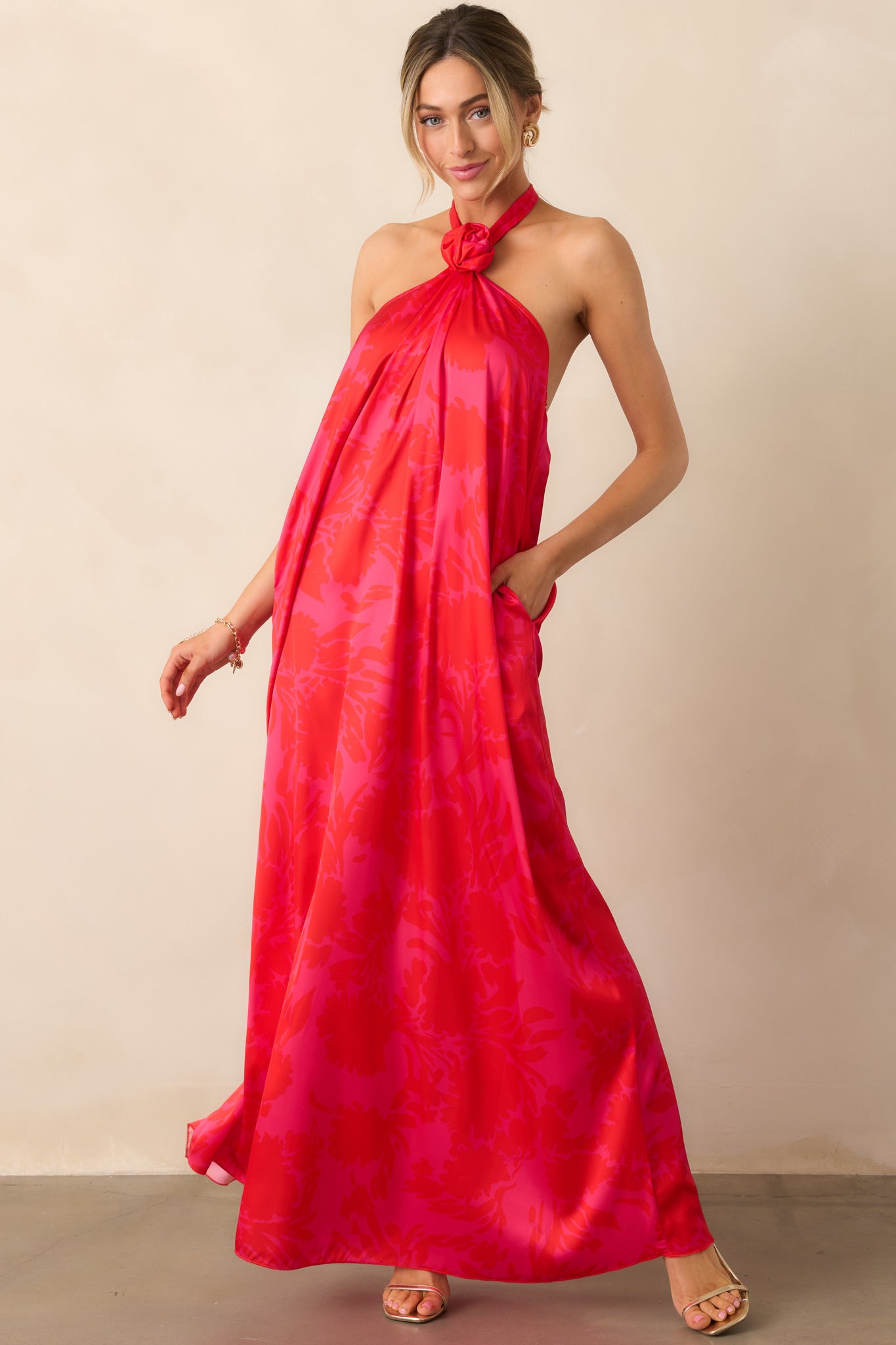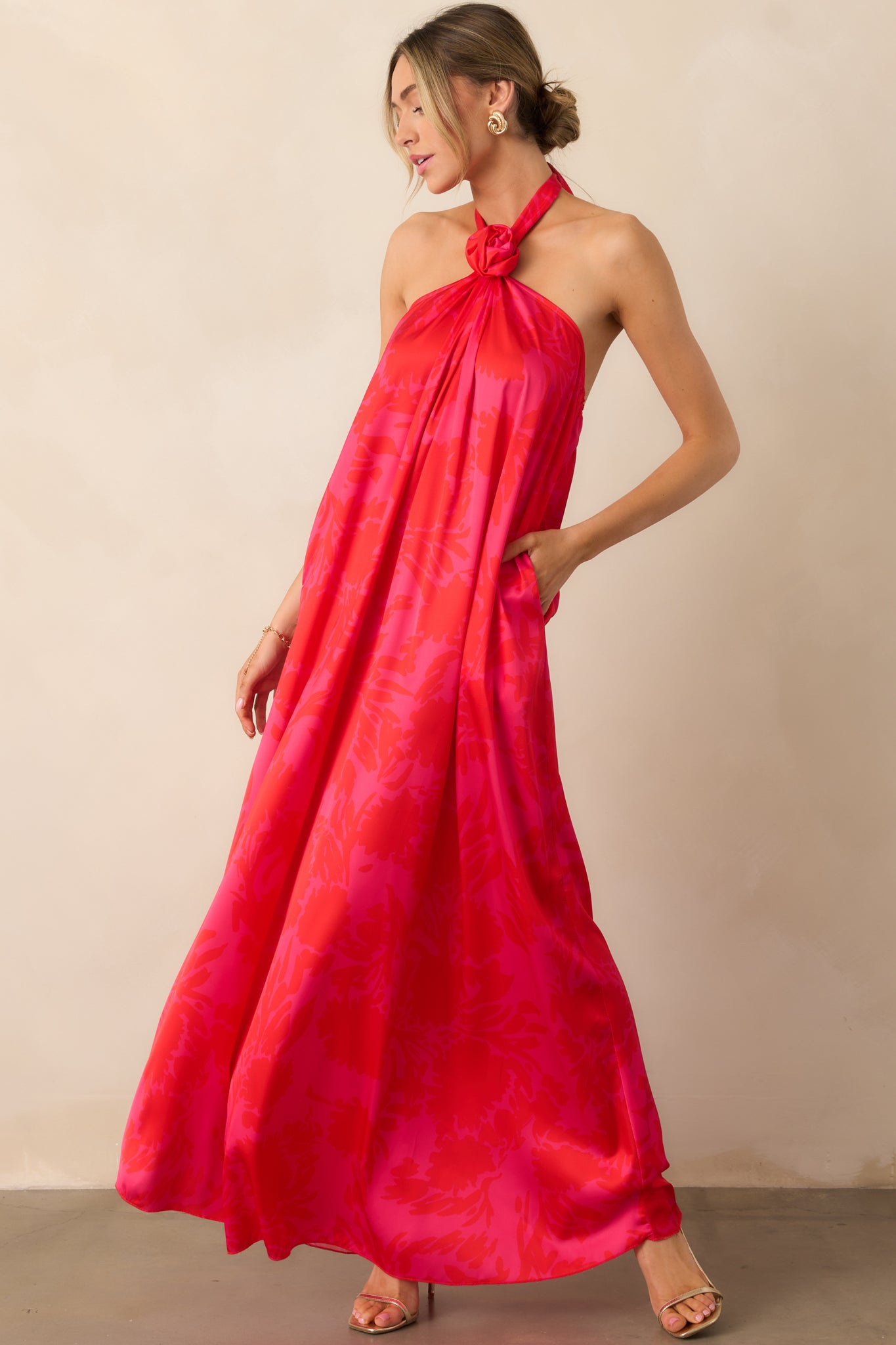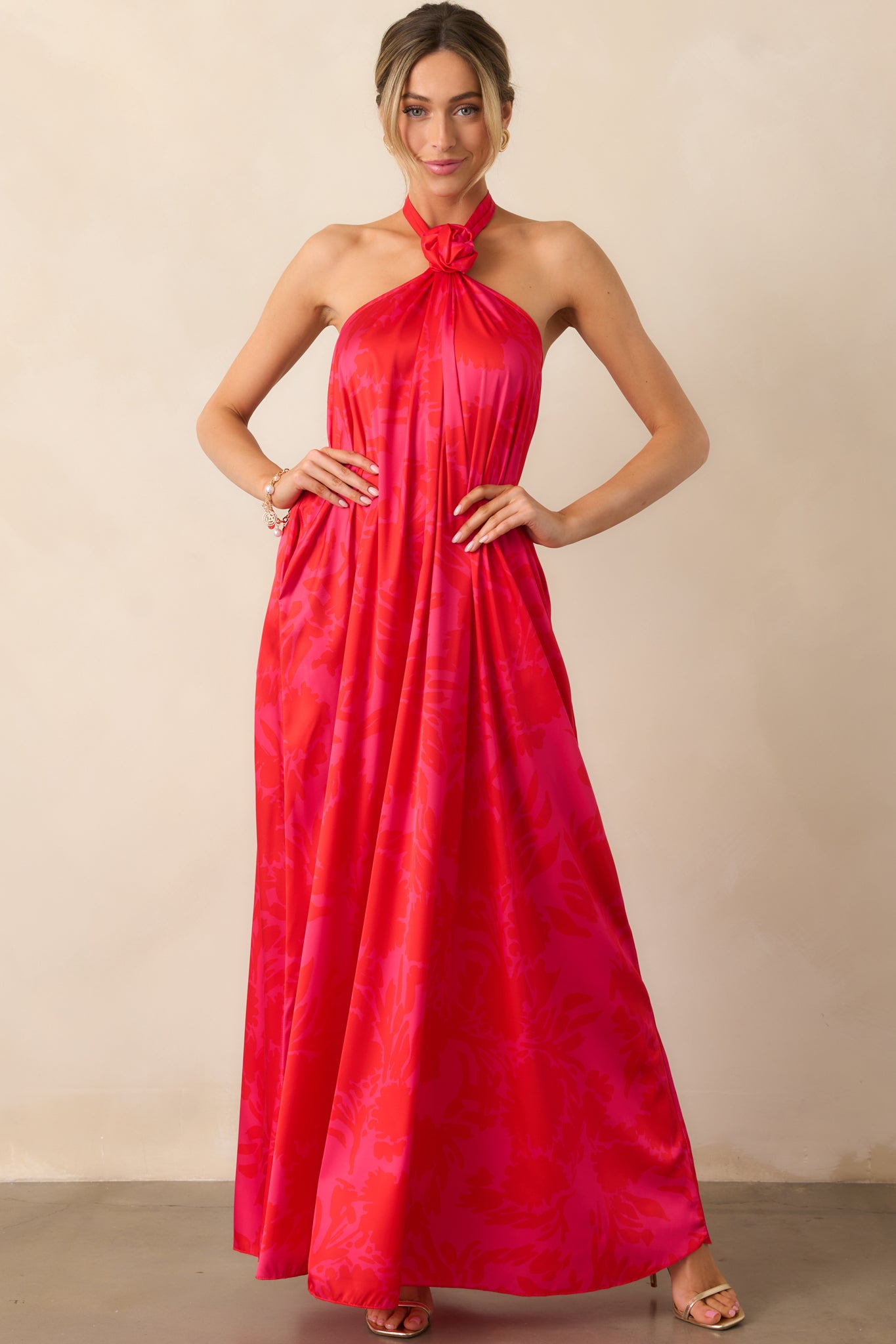 Everything You Need Red Floral Satin Halter Maxi Dress