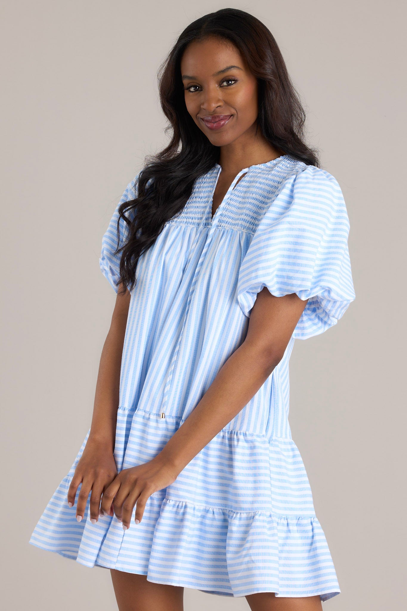 Introducing the perfect dress for your next family gathering - the Family Story Light Blue Stripe Mini Dress! With its playful striped design and flattering fit, this dress will keep you comfortable and looking stylish all day. Don't miss out on creating new memories with your loved ones in this quirky, fun dress. This dress features a v-neckline with a self-tie feature, a smocked chest, functional hip pockets, a tiered design, and elastic cuffed puff sleeves.