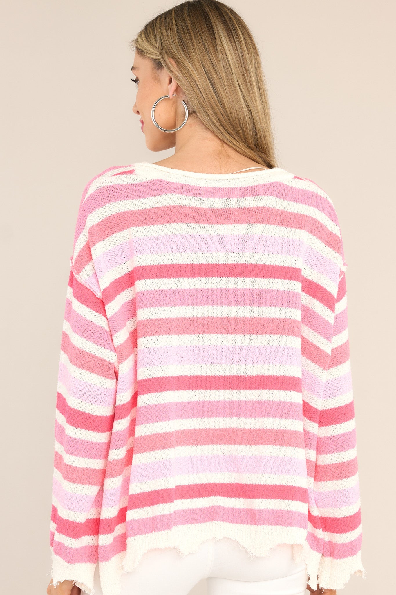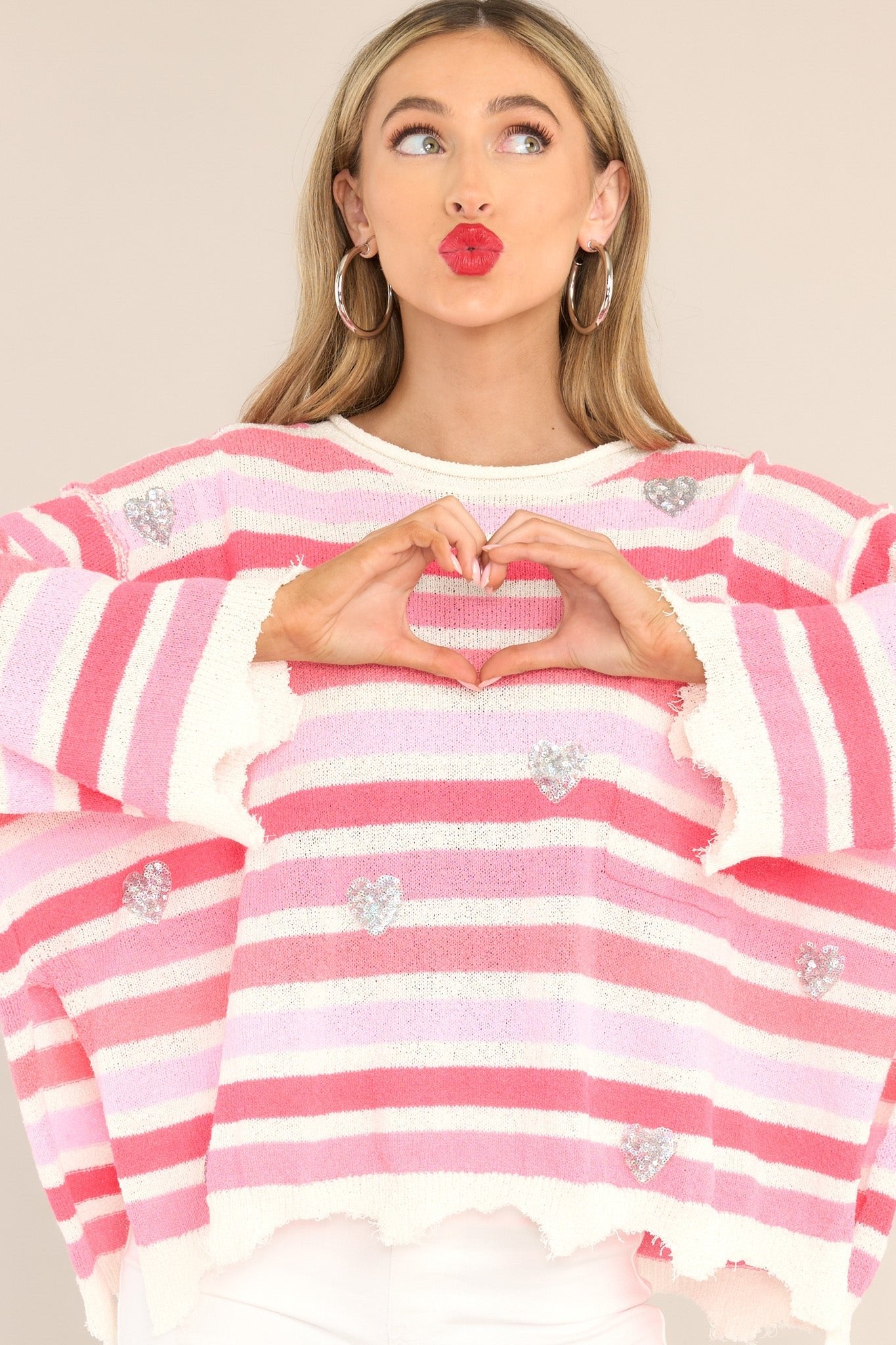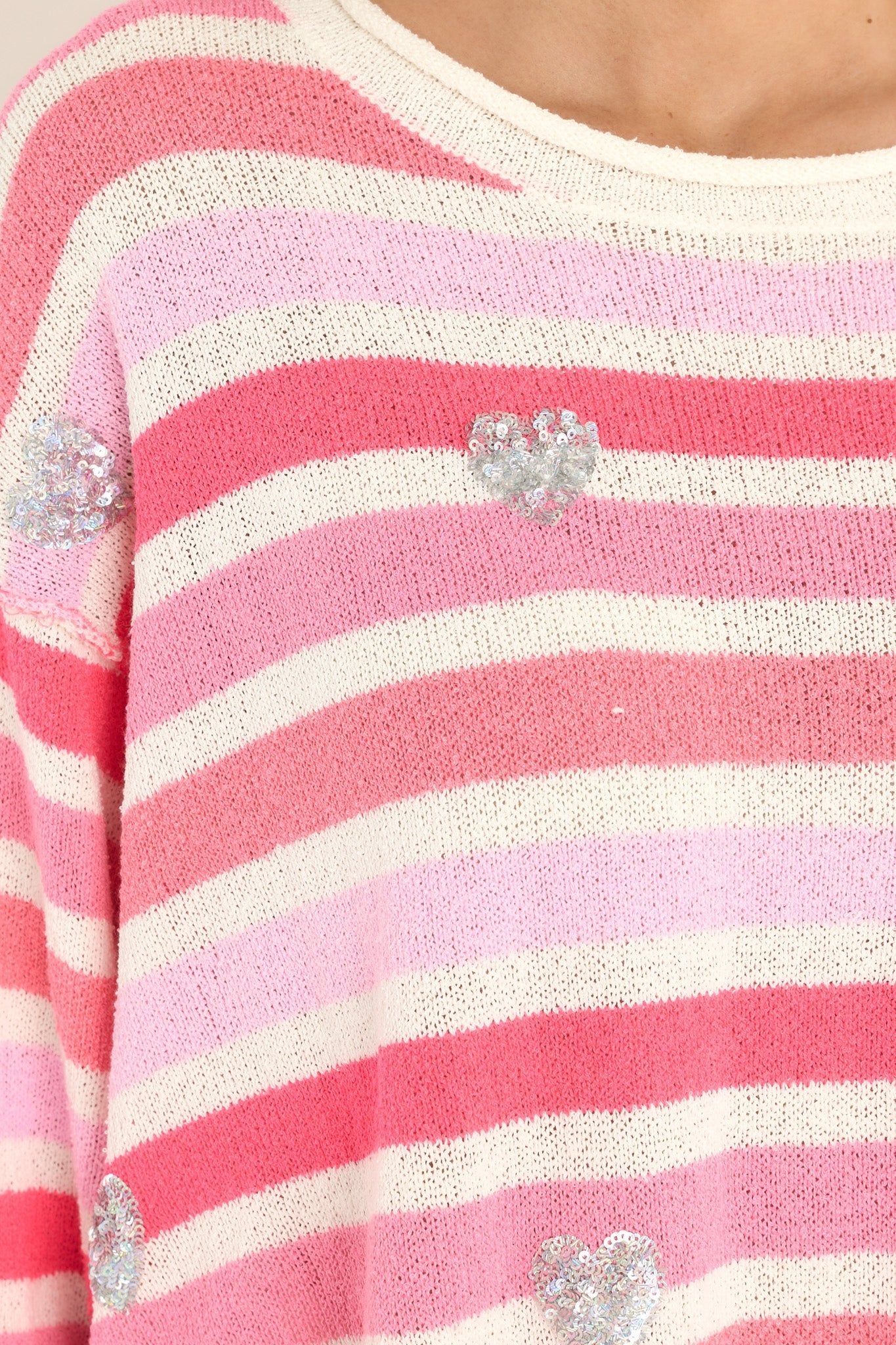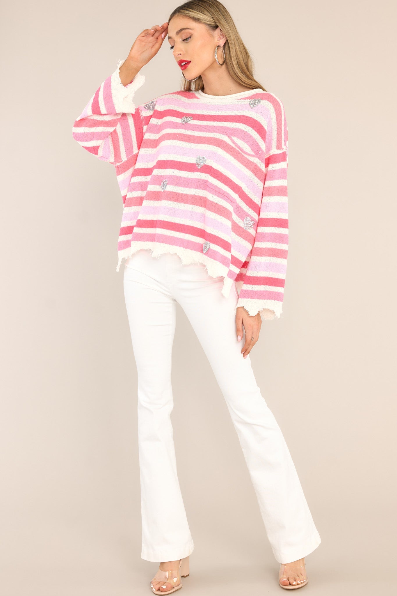 Looking for a new love? Look no further than the Finding My Love Pink Striped Sweater! Made from cozy material, this sweater features eye-catching stripes that will turn heads. Perfect for a casual day out or a cozy night in, this sweater is sure to become your new favorite. Get ready for all the heart-eyes! This sweater features a crew neckline, a chest pocket, sequin heart detailing, frayed sleeves, and a frayed split hemline.