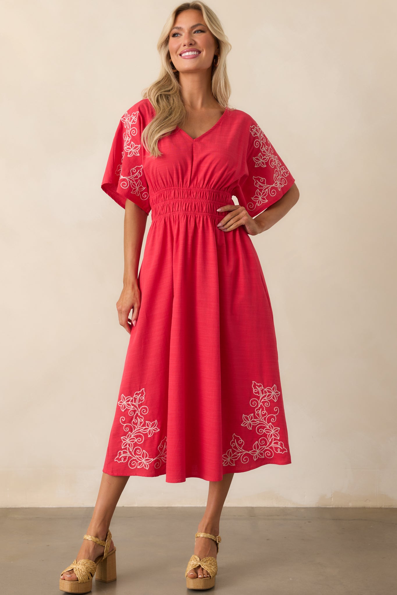 The Finding Your Way Red Floral Embroidered Cotton Midi Dress captures a sense of effortless beauty and timeless charm. Perfect for moments when you want to feel confident and graceful, this dress brings a vibrant touch to your wardrobe and is suited for everything from special occasions to everyday elegance. This red midi dress features a v-neckline, back keyhole closure, oversized short sleeves, ivory floral embroidery details, smocked elastic waist, lightweight cotton-rayon blend fabric, and functional pockets.