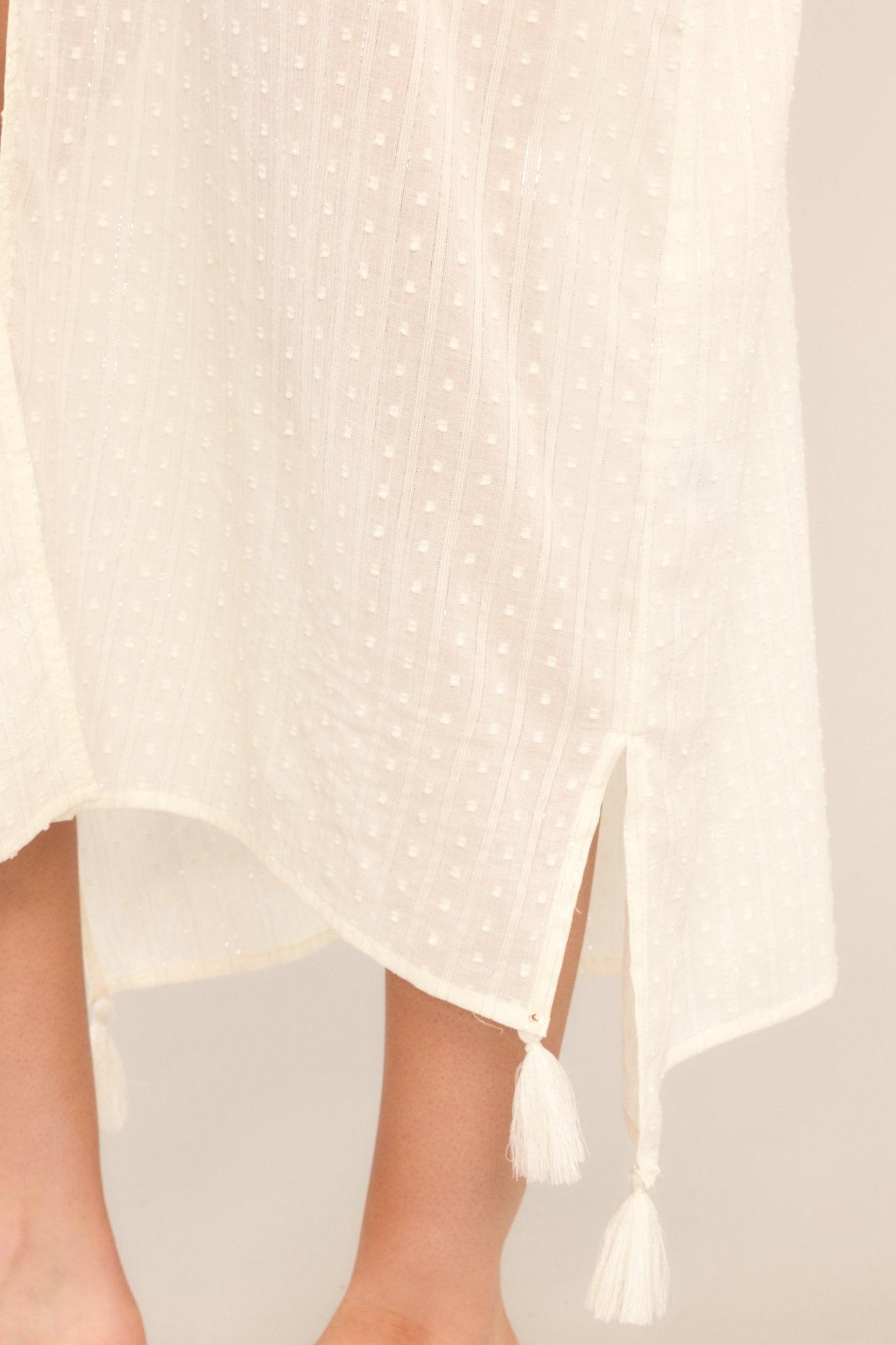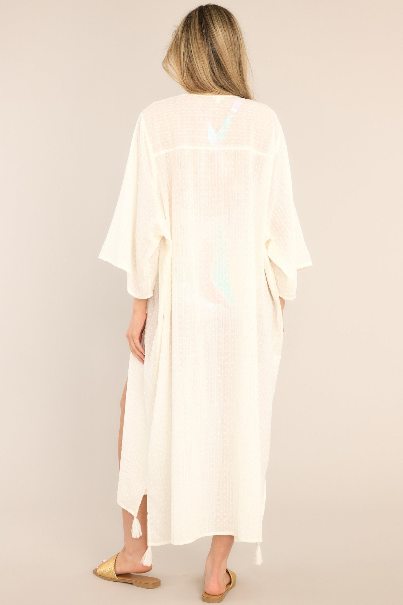 I’m in it For The Long Ride this season…and I need to dress for the extended vacay life I’m choosing! This divine ivory lightweight cover up is the perfect start! Honestly, I can only go up from here! This coverup features wide, flowy sleeves, a textured polka dot design throughout, silver sparkly detailing, slits on either side, and tassels on the bottom hem