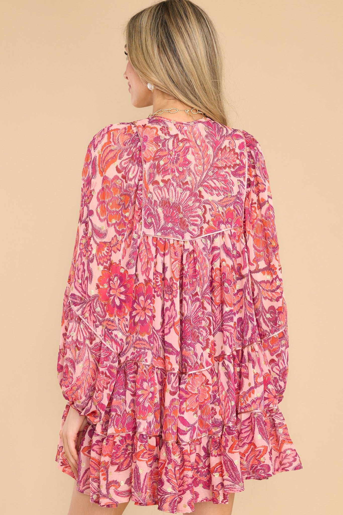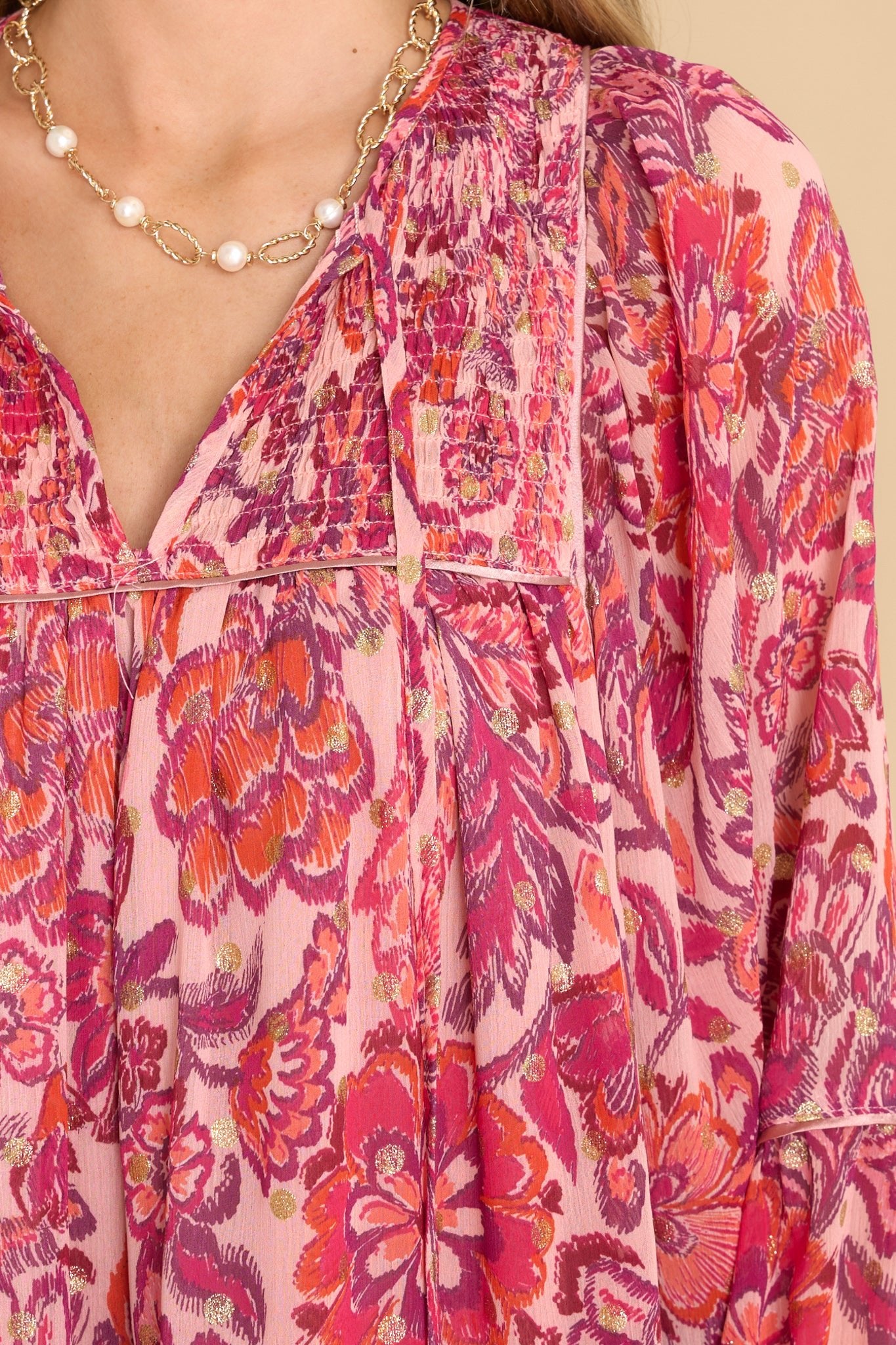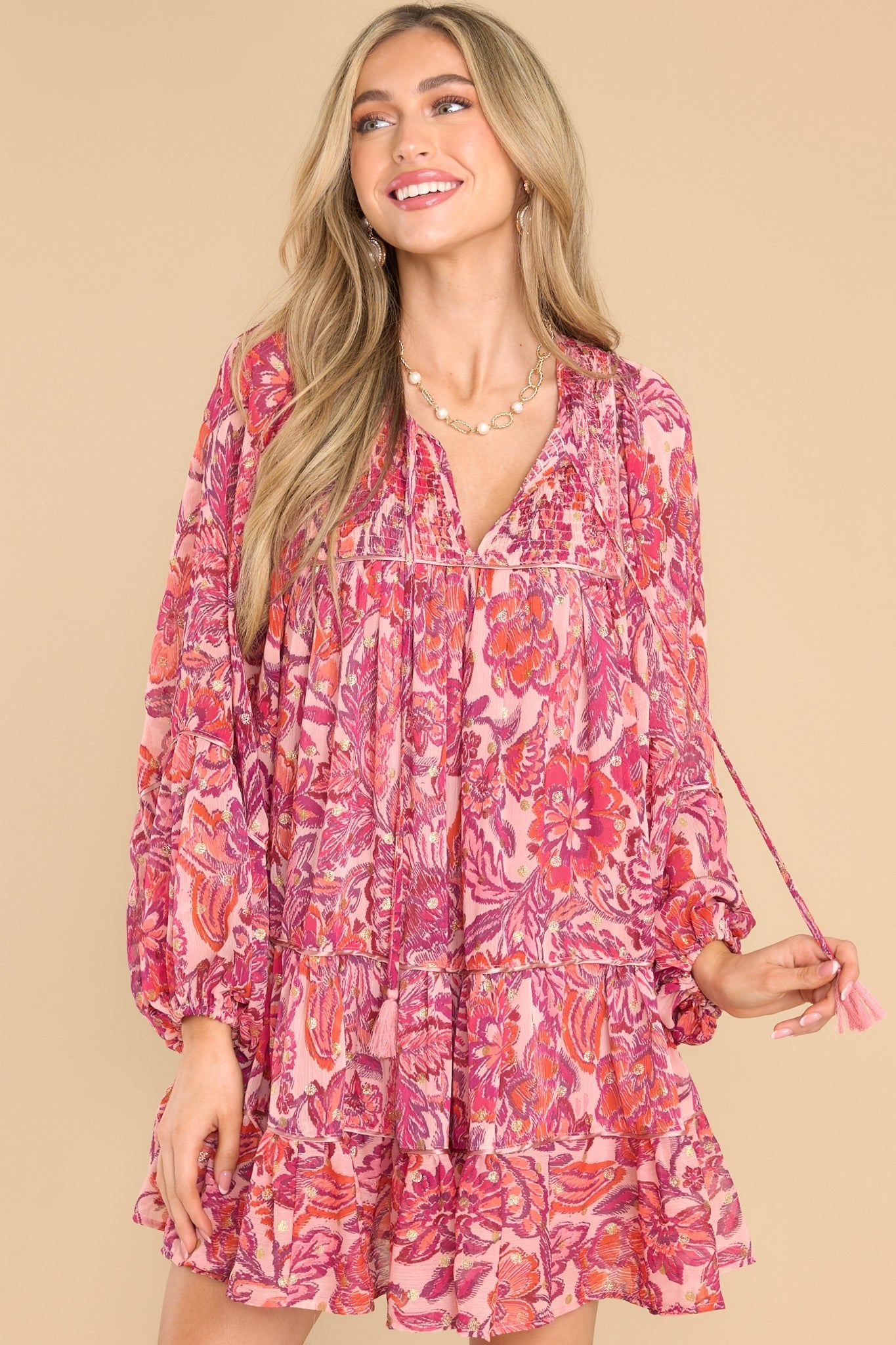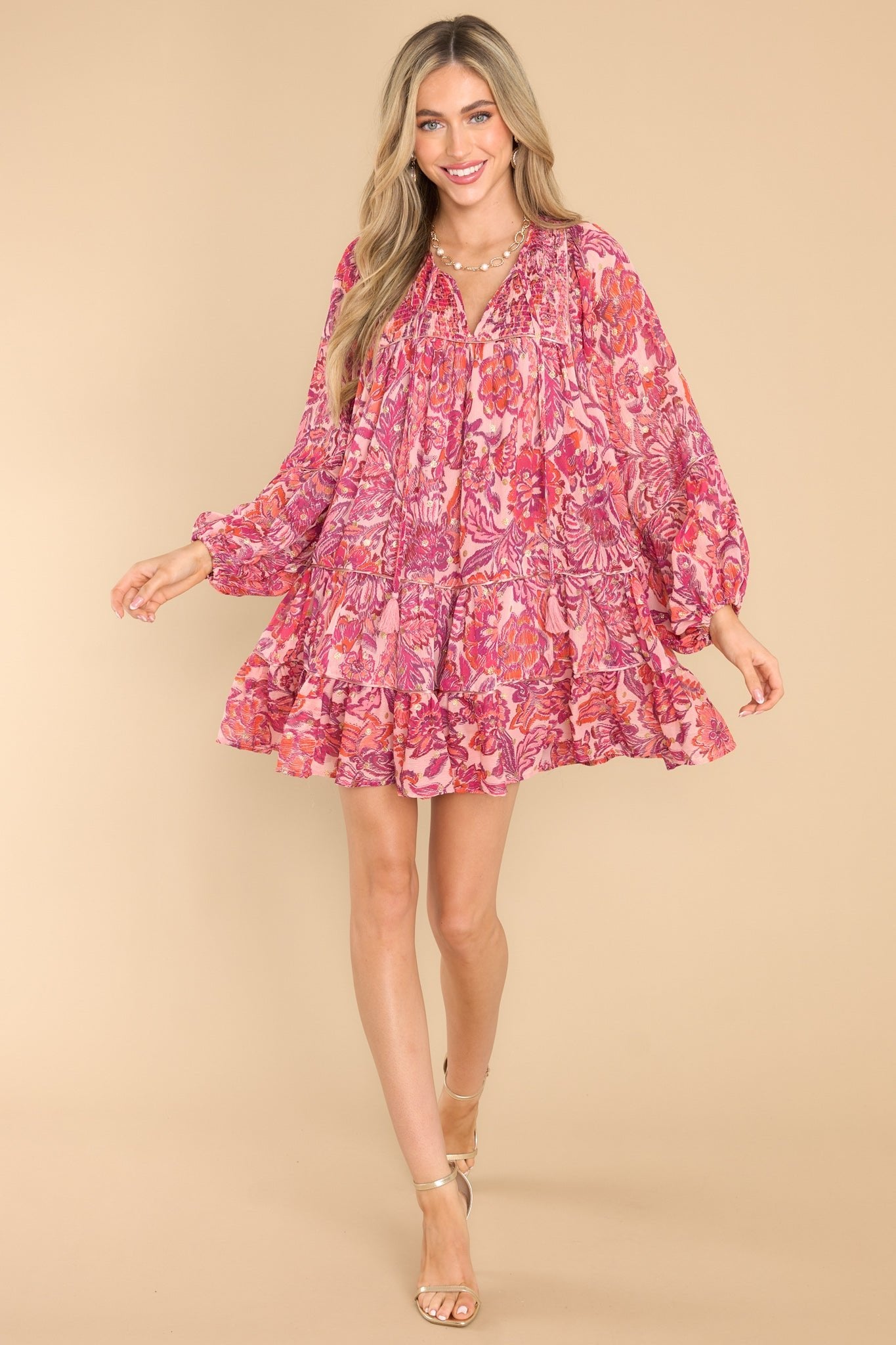 Make a bold statement with the Found My Voice Pink Floral Print Dress! It's the perfect piece for expressing your cute nature. Featuring a playful pink floral design, it's sure to make you look like you've just stepped out of a fairy tale. This dress features a v-neckline with a self-tie closure, a smocked section at the top of the bust, sheer long sleeves with elastic cuffs, a flowy skirt, and gold metallic detailing throughout. Model is wearing a small. • 100% Polyester • Hand Wash Only • Lined 100% Polyester • Imported