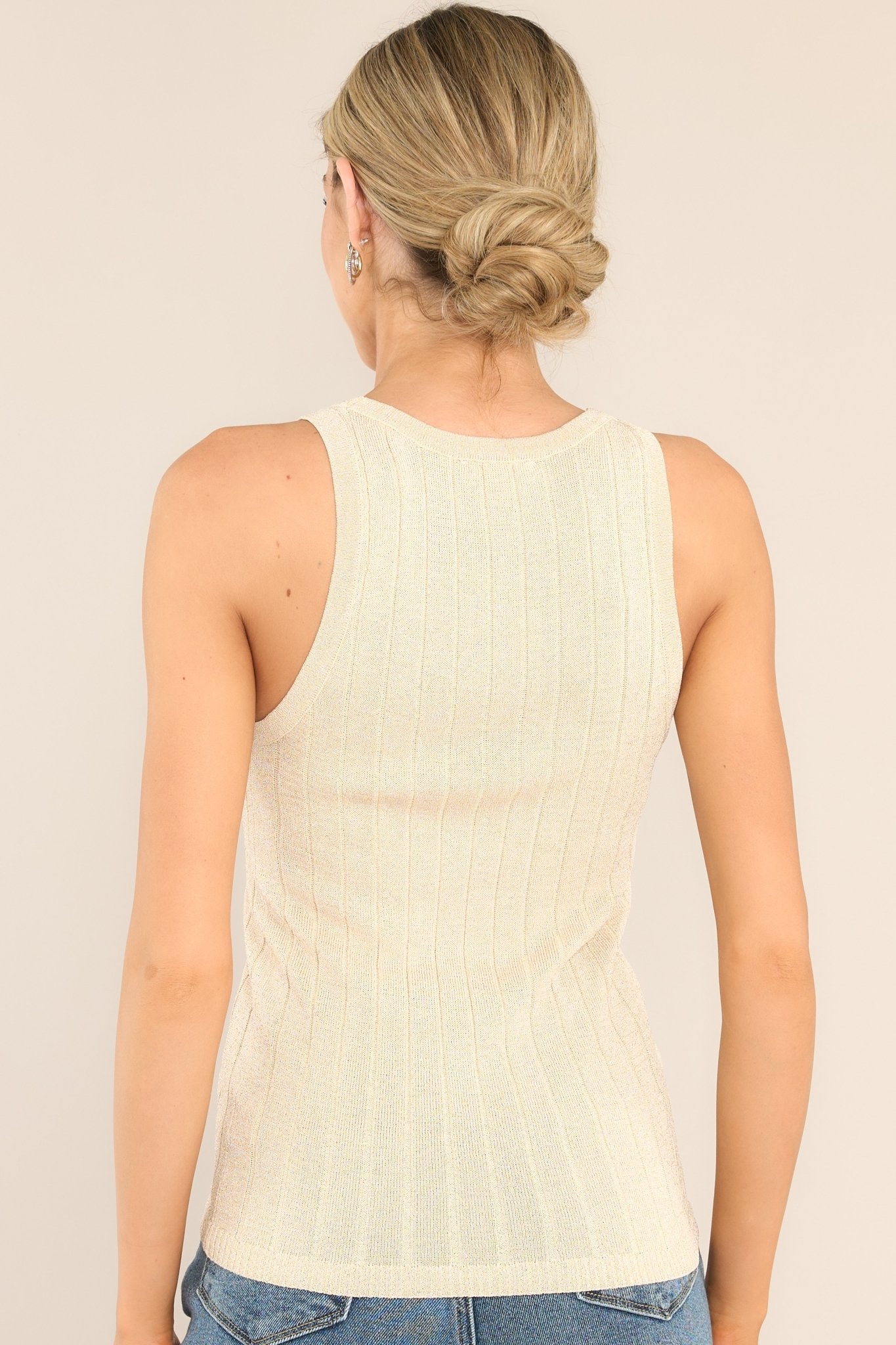 Introducing Frames of Bliss Gold Tank Top, a stylish and comfortable addition to your wardrobe. Get ready to shine in this golden tank top that will make you stand out in any crowd. Perfect for a night out, this top will bring a touch of bliss to your life. This tank top features a scoop neckline, a stretchy ribbed fabric, a high back, and slight shimmer detailing.