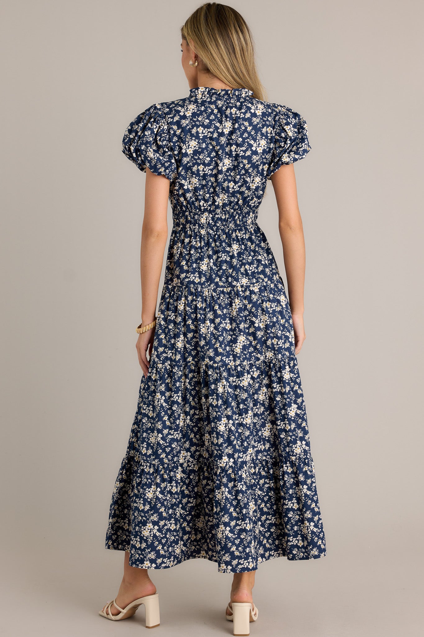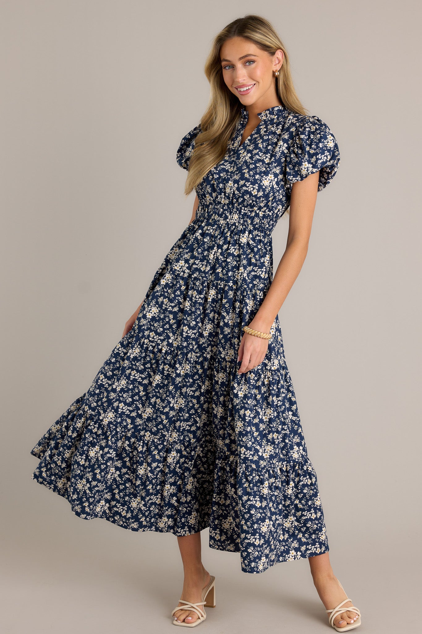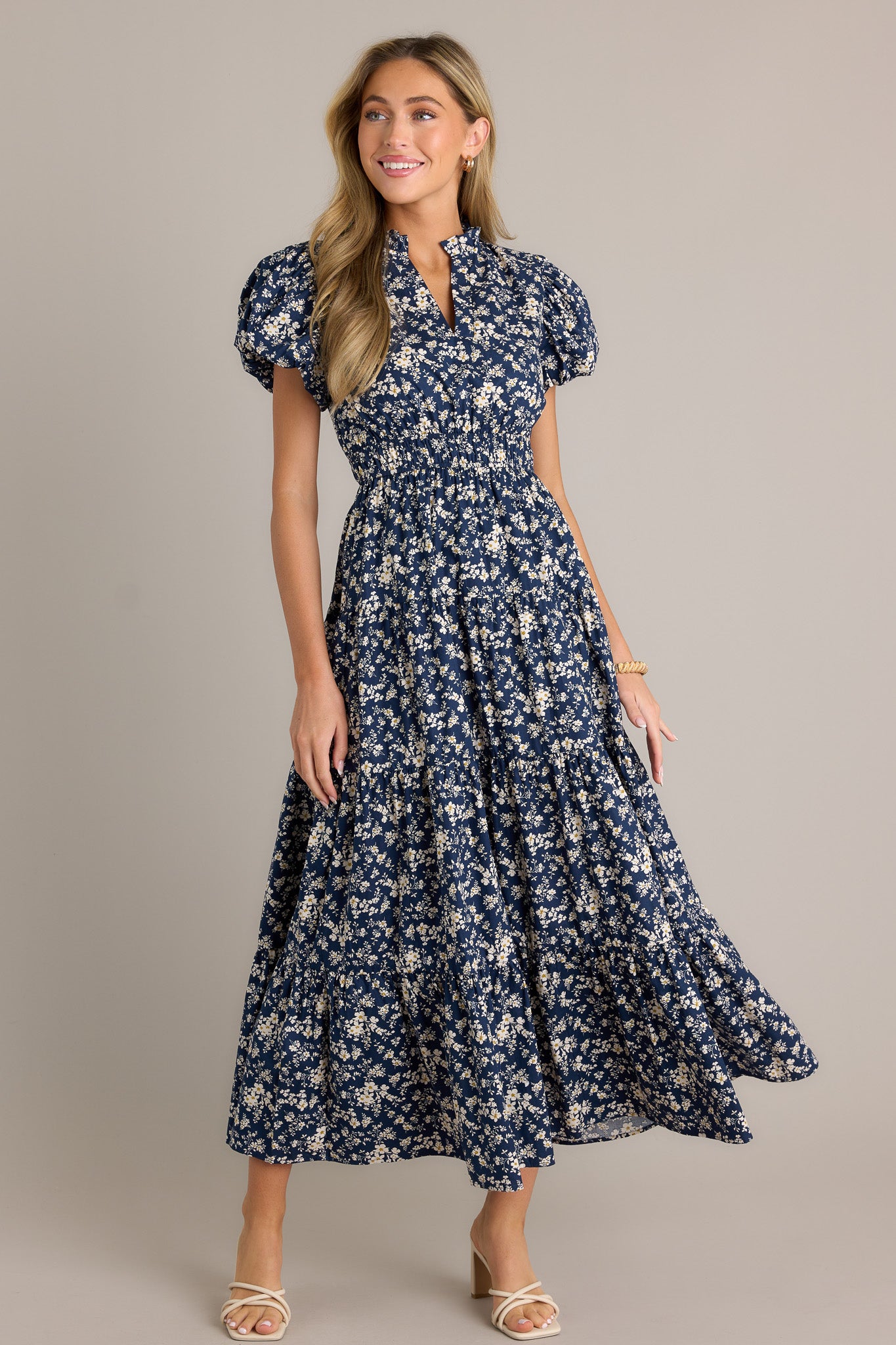 Get ready to be the life of the garden party with the Gardenia Gala Navy Floral Maxi Dress. Boasting a playful and charming navy floral design, this dress will have you standing out from the crowd. Its maxi length and light, flowy material ensure both style and comfort. Perfect for any outdoor event, this dress will have you blooming with confidence. This navy floral dress features a v-neckline, a ruffle collar, an elastic waistband, a tiered design, short cuffed puff sleeves, and a flowing silhouette.