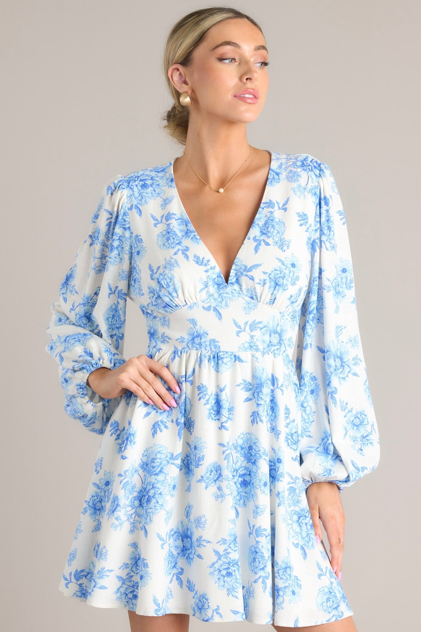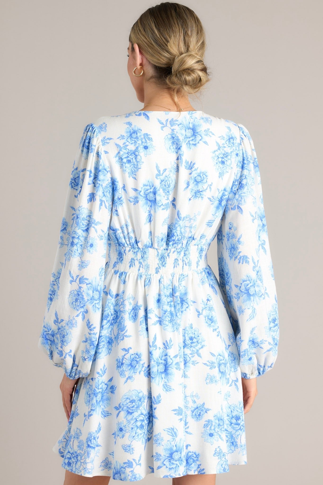 Bring a touch of charm and playfulness to your wardrobe with our Glimmer Of Hope White & Blue Floral Mini Dress. This gorgeous dress features a flattering fit and eye-catching blue floral design, perfect for any occasion. Add a touch of whimsy to your style and feel confident in this stunning mini dress! This dress features a deep v-neckline, ruching in the bust, a fitted waistband, a smocked back insert, and elastic cuffed long sleeves.