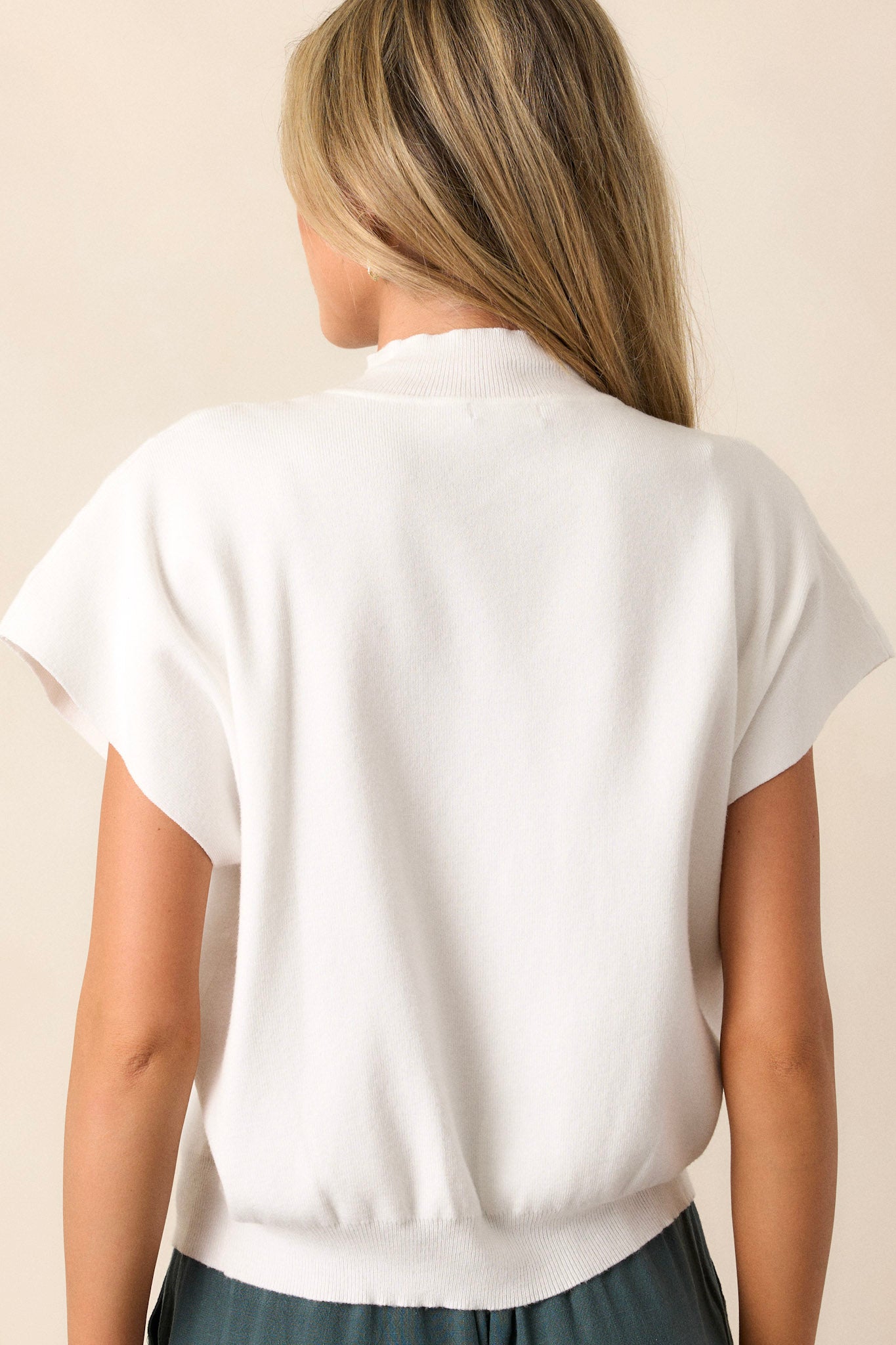 Stay in style with our Hold Your Gaze Ivory Sweater Top! Made with soft and cozy material, this short sleeve top features a flattering silhouette and a playful twist with its ribbed details. Perfect for any occasion, keep your gaze on this must-have piece. This ivory sweater top features a ribbed high neckline, a ribbed hemline, short sleeves and a soft sweater fabric.