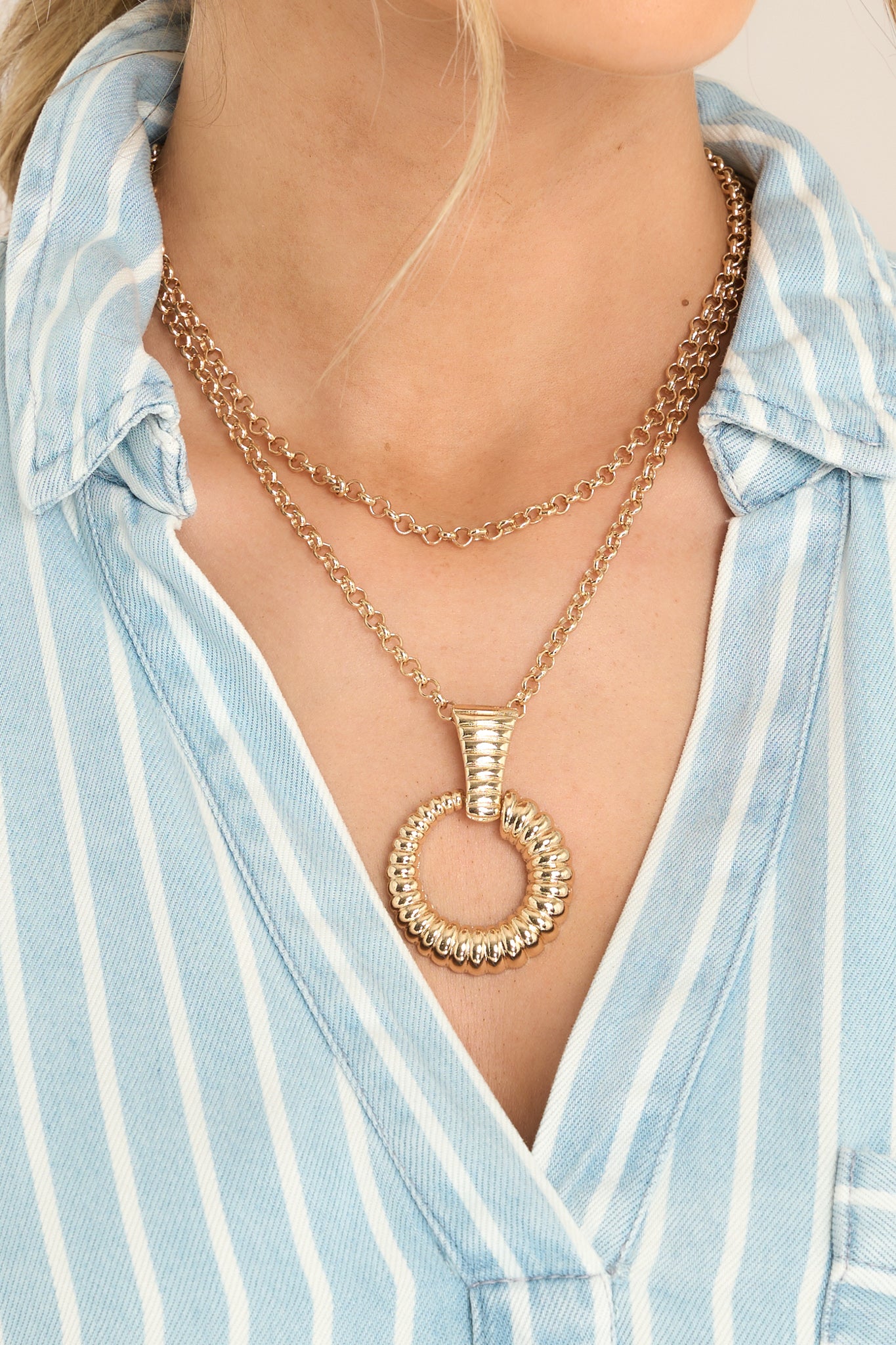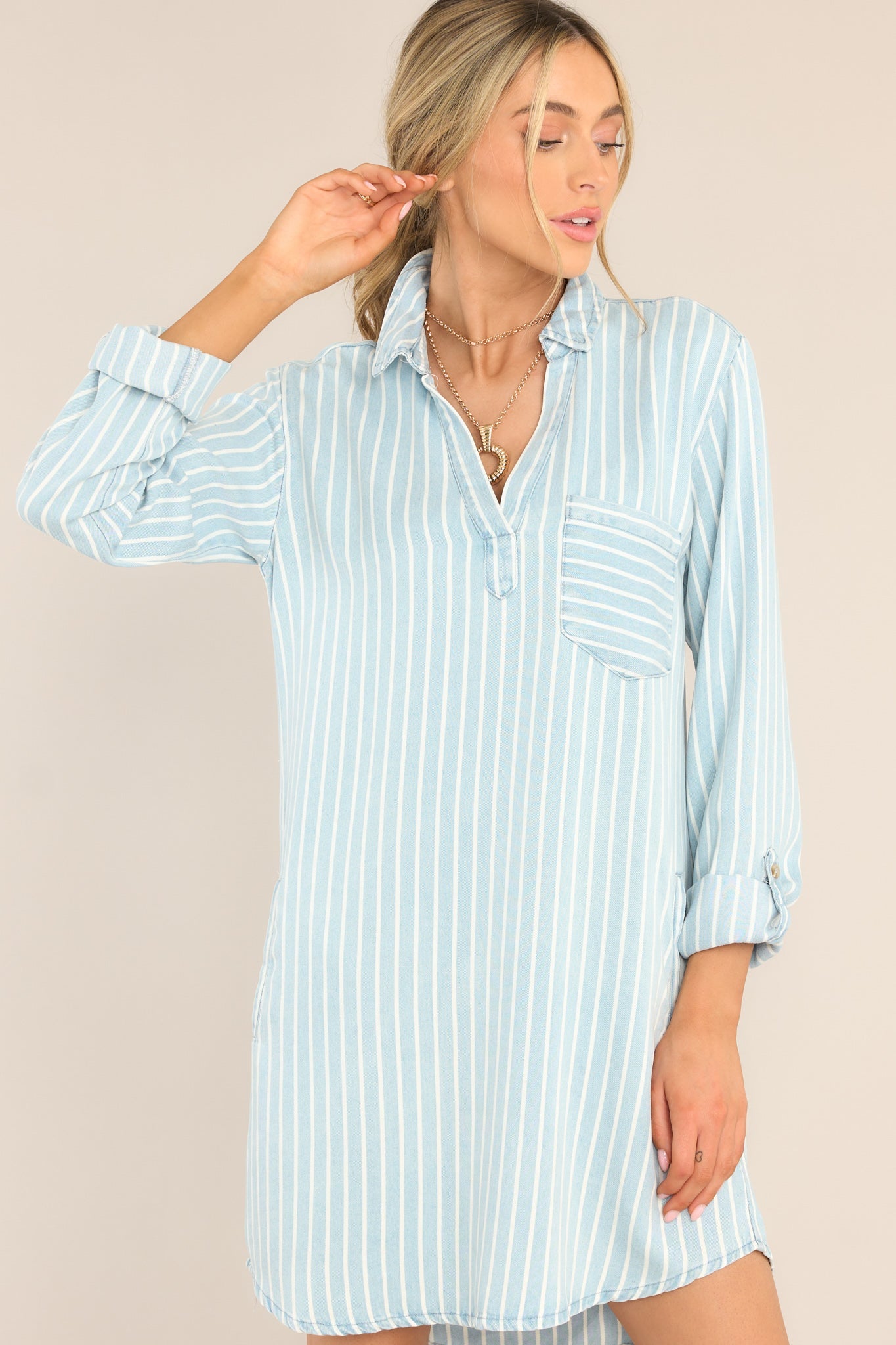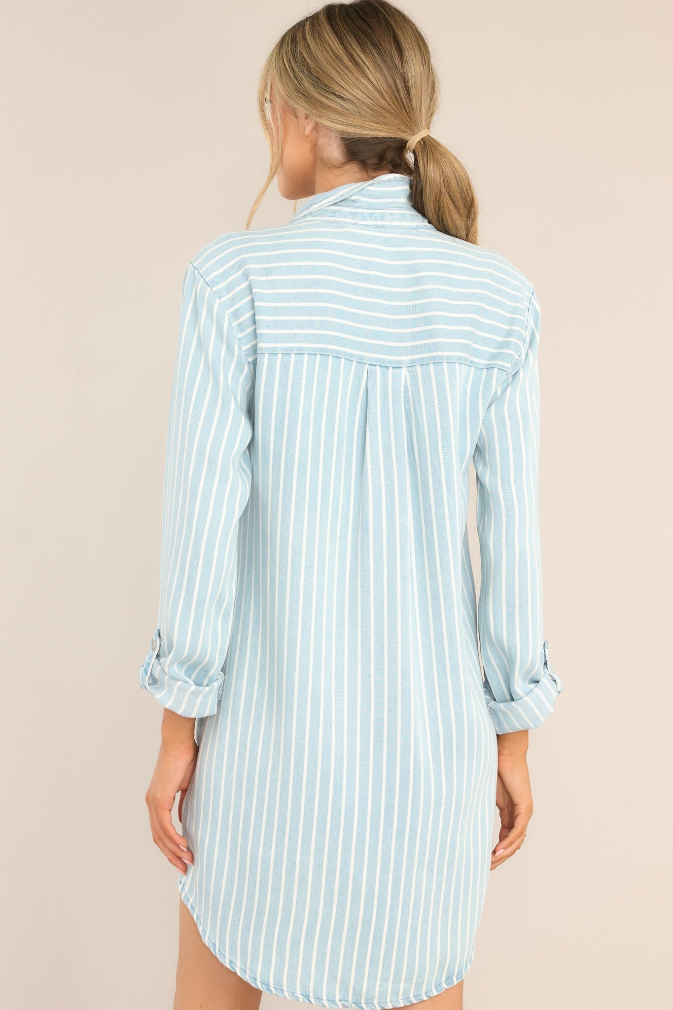 Step out in style and comfort with the Hurrying Along Chambray Striped Shirt Dress. With its lightweight and breathable fabric, you'll breeze through your day in chic, effortless fashion. The classic striped design adds a touch of playfulness to your wardrobe, making this dress a must-have for any fashionable and fun-loving individual.