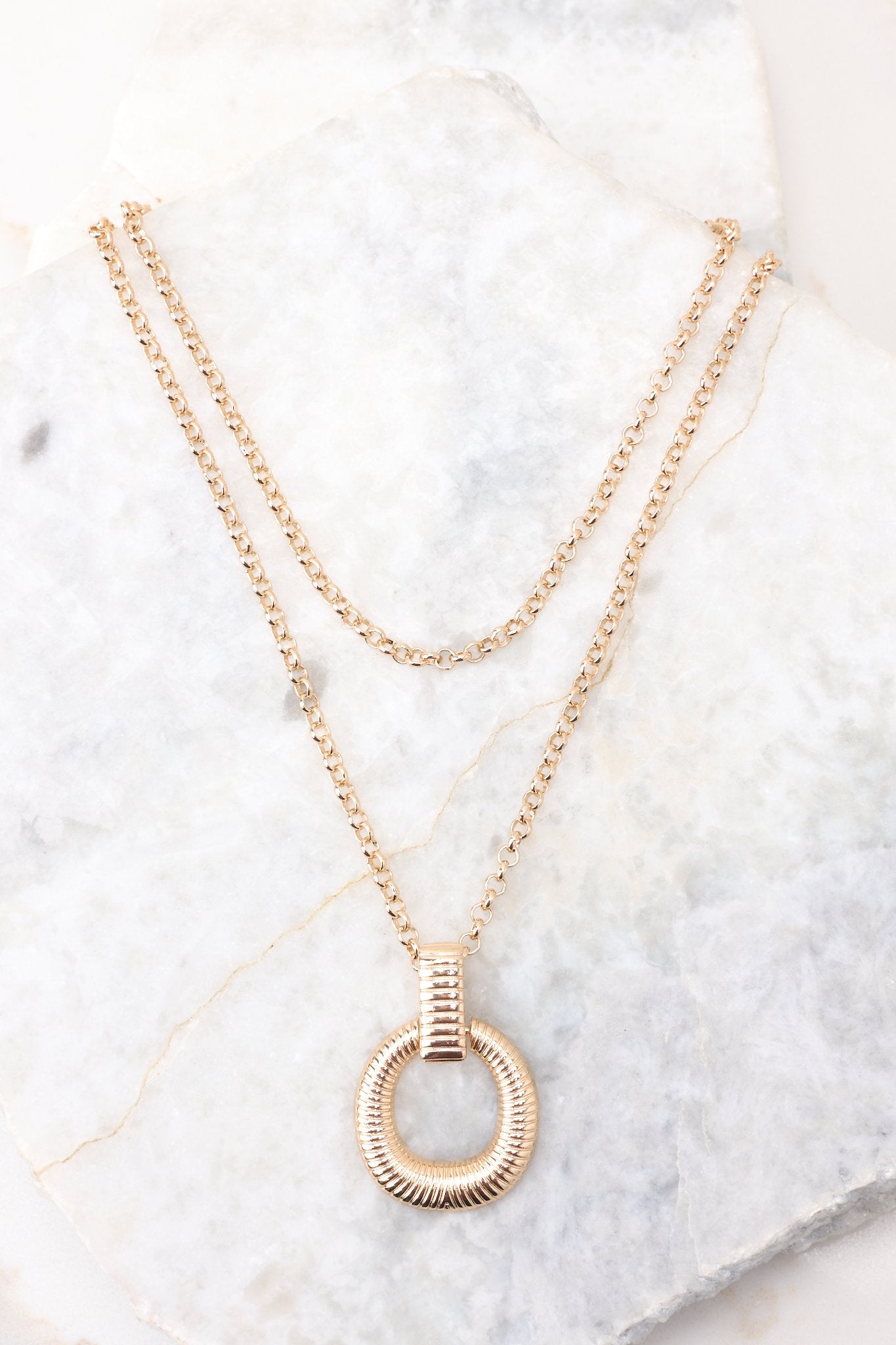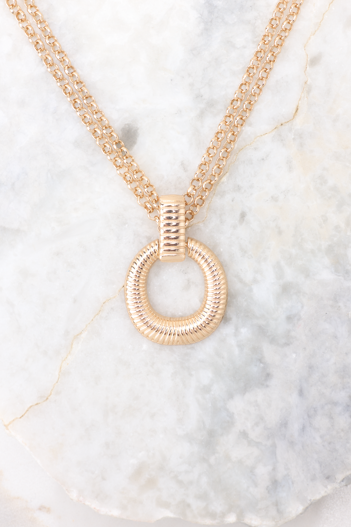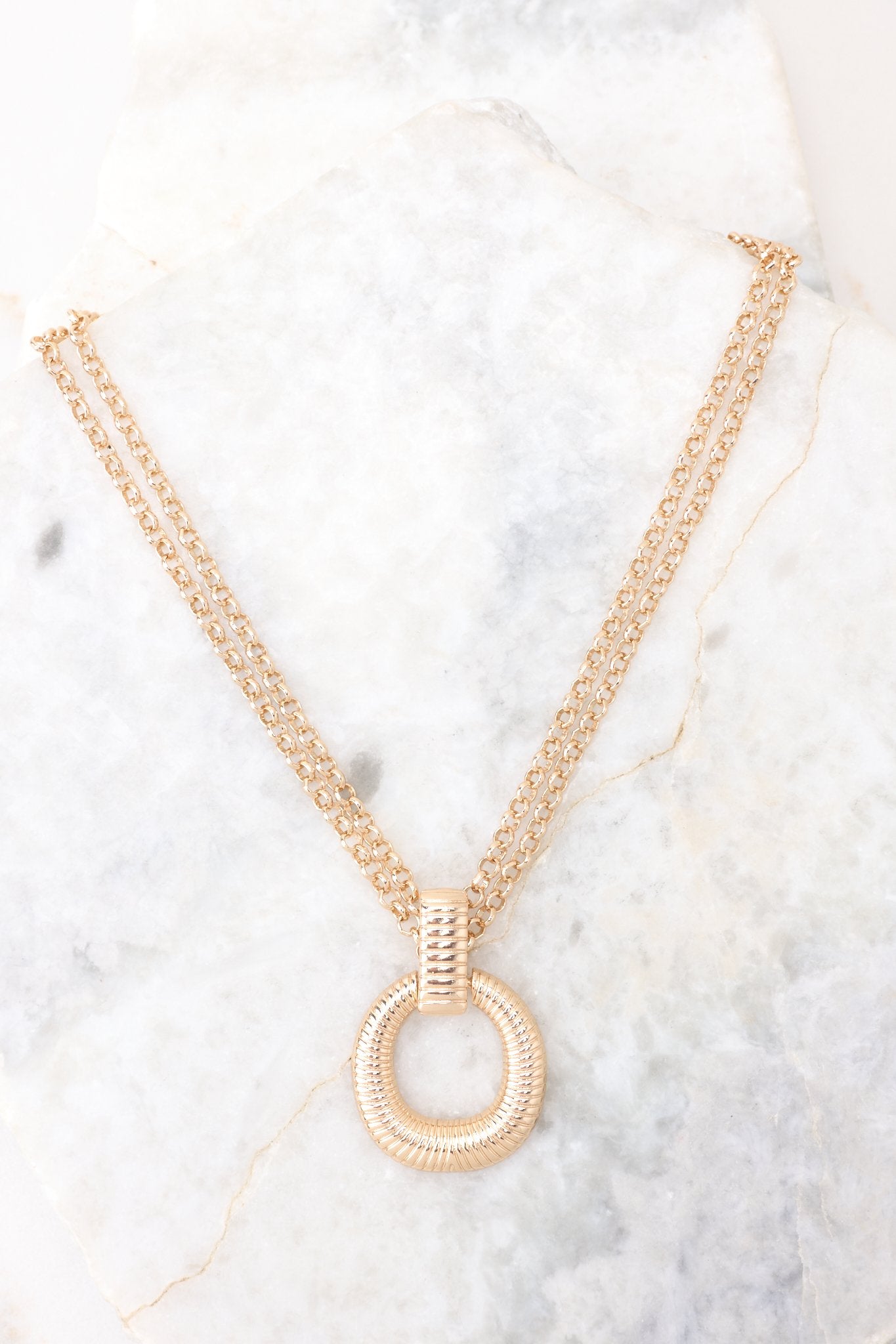 Channel your inner shine with the Hype Me Up Gold Necklace! The pretty and classic design will make any outfit sparkle and let you stand out in the crowd. So don't be shy--it's time to show off that golden glow! This necklace features an adjustable double-layered chain link design, lobster closure, and a round gold pendant with groove detailing. • Necklace measures 10" and can be doubled in length • Imported