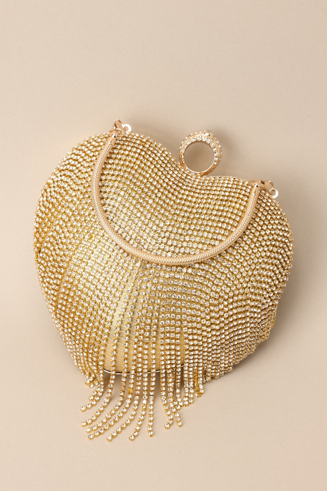 Carry your heart on your shoulder (well, technically in your hand) with the I Give You My Heart Gold Handbag! This gold-colored handbag is both stylish and functional with a spacious interior, perfect for holding your essentials. Let your heart shine with this unique and playful accessory! This handbag features gold hardware, rhinestone fringe, a removable chain strap, a ring like feature, and a snap closure.