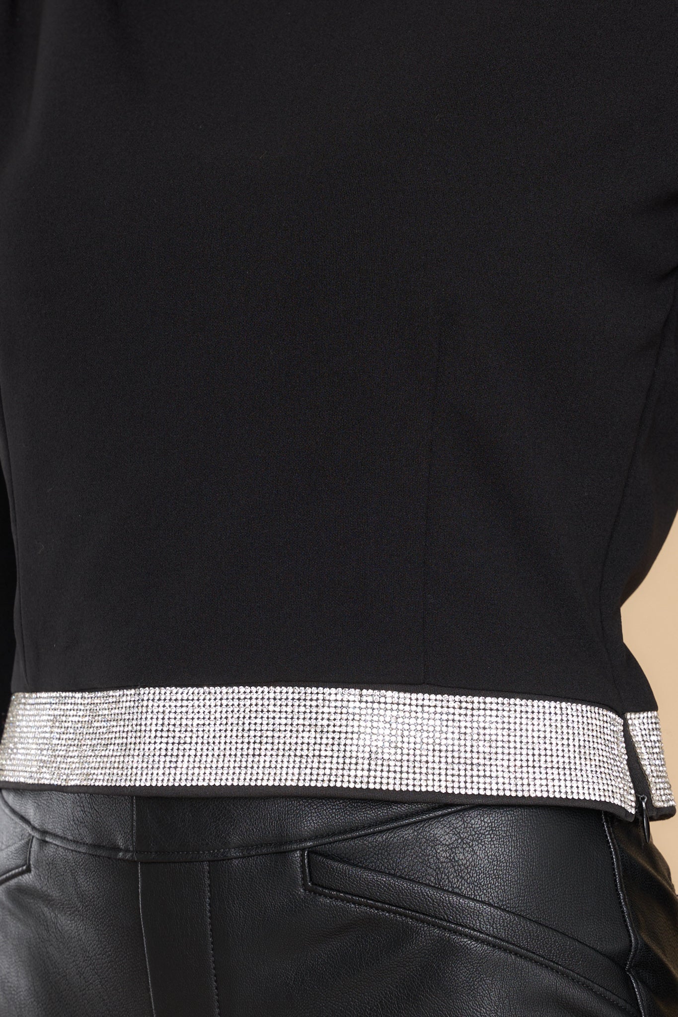 This top features a crew neckline, shoulder pads, scrunched detail on the sleeves, a functional side zipper, and a rhinestone hemline. Model is wearing a size small. • 95% Polyester 5% Spandex • Hand Wash Cold • Lined 97% Polyester, 3% Spandex • Imported