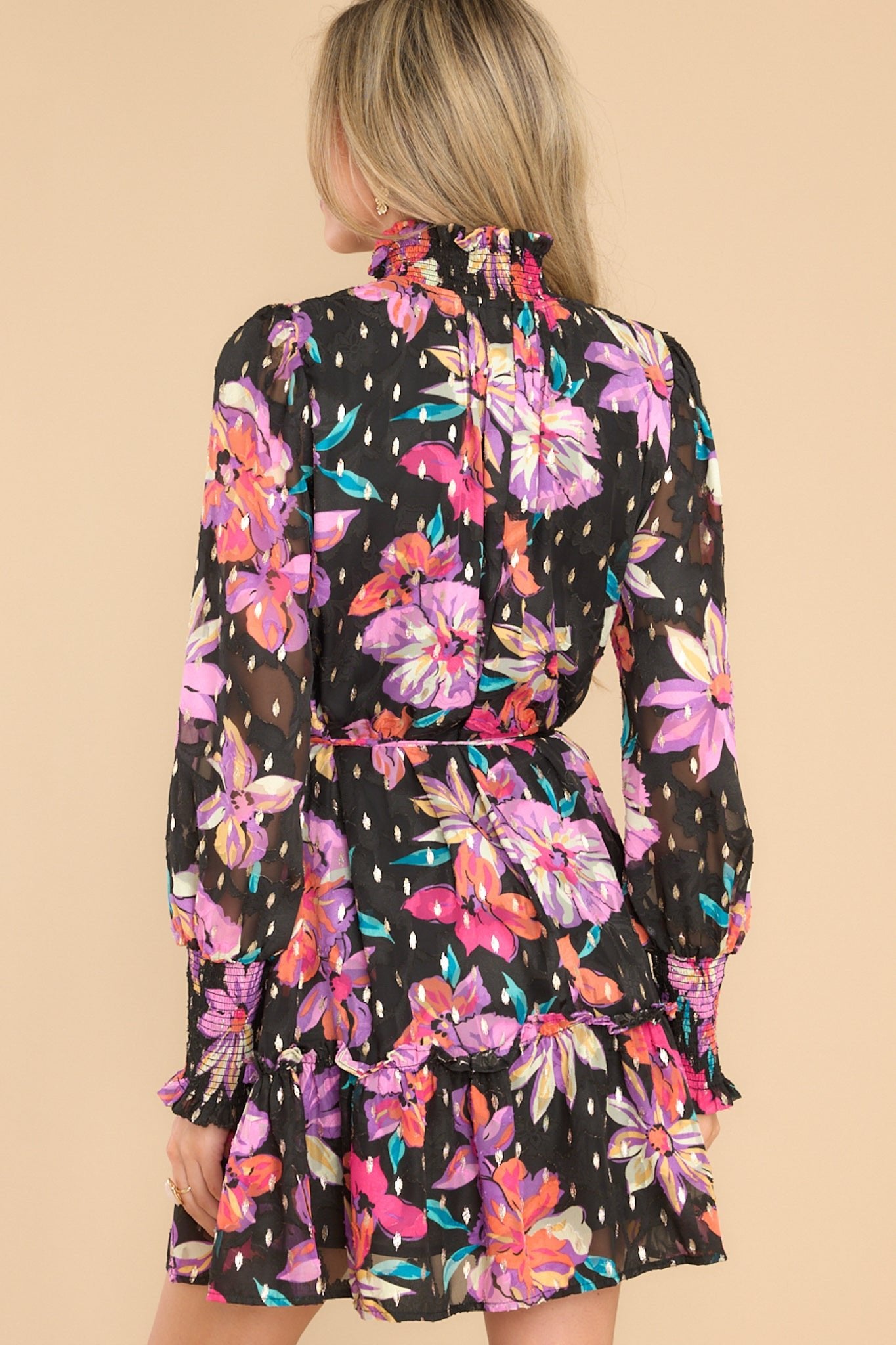 Turn heads in this flirty floral dress! With a beautiful black background, this dress is perfect for a dinner with the gals. Be the life of the party - choose the I'd Choose You dress! This dress features a smocked high neckline, long sleeves with smocked cuffs, a self-tie belt at the waist, and gold metallic detailing throughout. Model is wearing a small. • 100% Polyester • Hand Wash Cold • Lined 100% Polyester • Imported