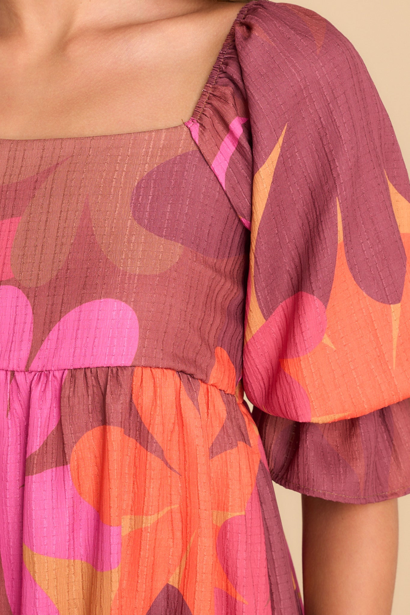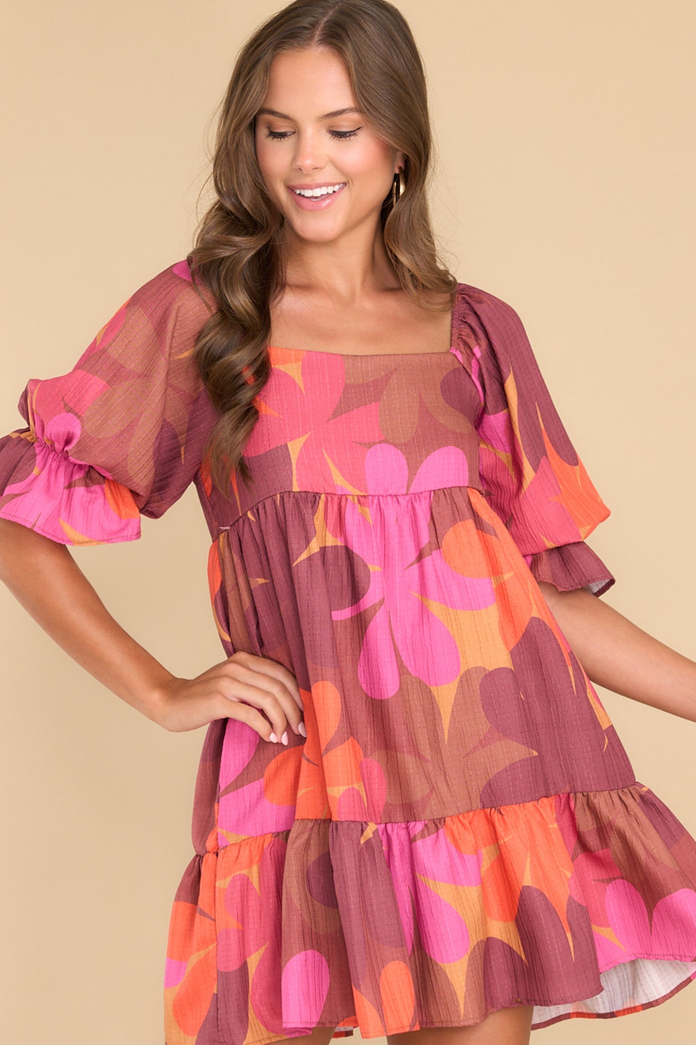 This Instinctive Impression Burgundy Floral Print Dress is the perfect pick if you want to make a colorful statement! Crafted with a bright burgundy base and charming floral pattern, this piece is sure to have you looking stylish and sweet. The possibilities are bloomin' brilliant! This dress features a square neckline, half-length puff sleeves with elastic cuffs, and a flowy skirt. • 100% Polyester • Hand Wash Cold • Lined 100% Polyester • Made in the U.S.