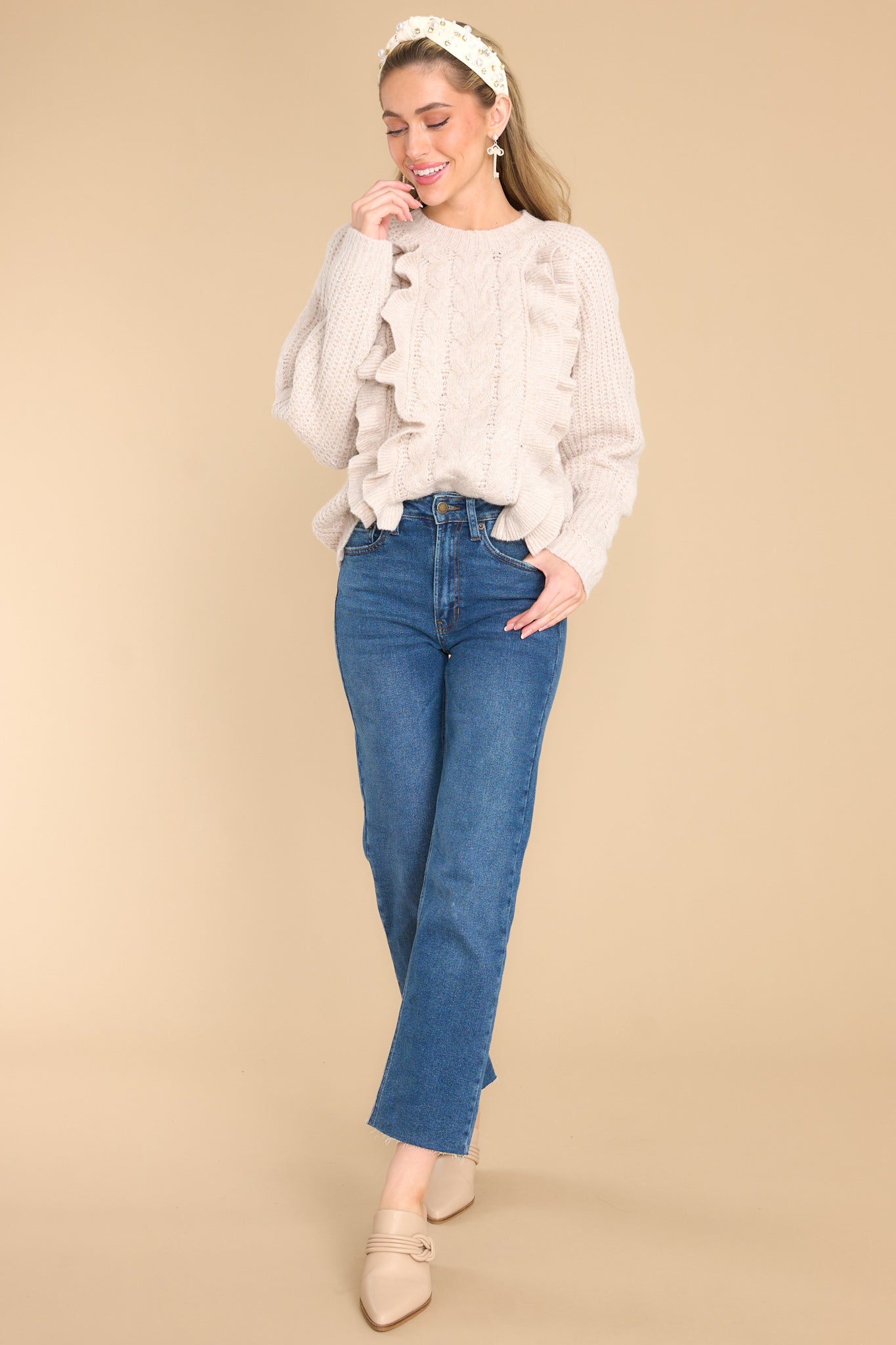 Stay comfortable and look professional in the Into Pieces Beige Sweater! Perfect for teachers, this beige sweater has just the right blend of style and practicality. With its breathable fabric, you'll stay cool in the classroom whilst looking seriously chic! Show 'em who the real boss is! This sweater features a crew neckline, ruffle detailing down the front, long sleeves with cuffs, and a chunky knit design. The model is wearing a size small. • 65% Polyester. 35% Spandex • Dry Cleaning Only • Unlined • Imported