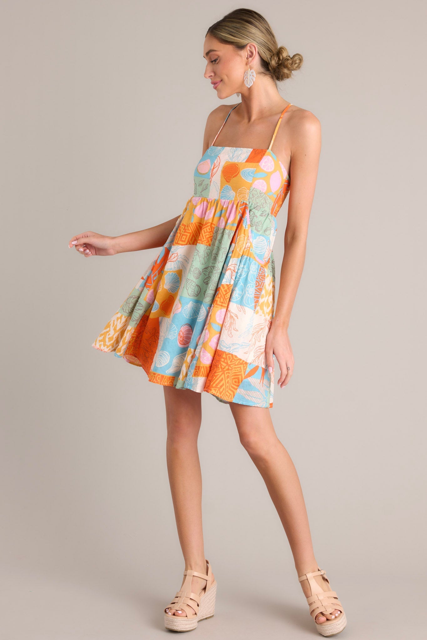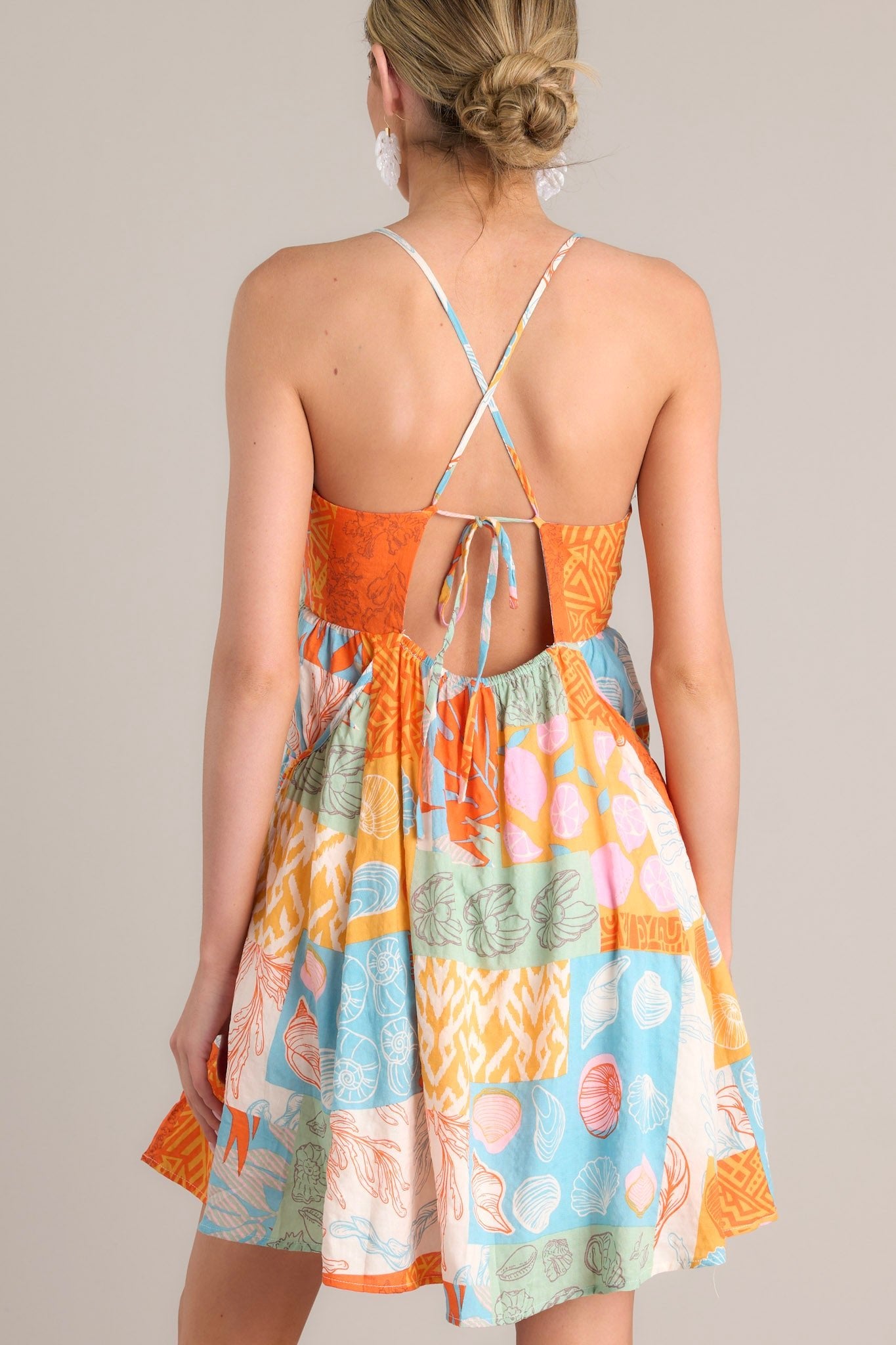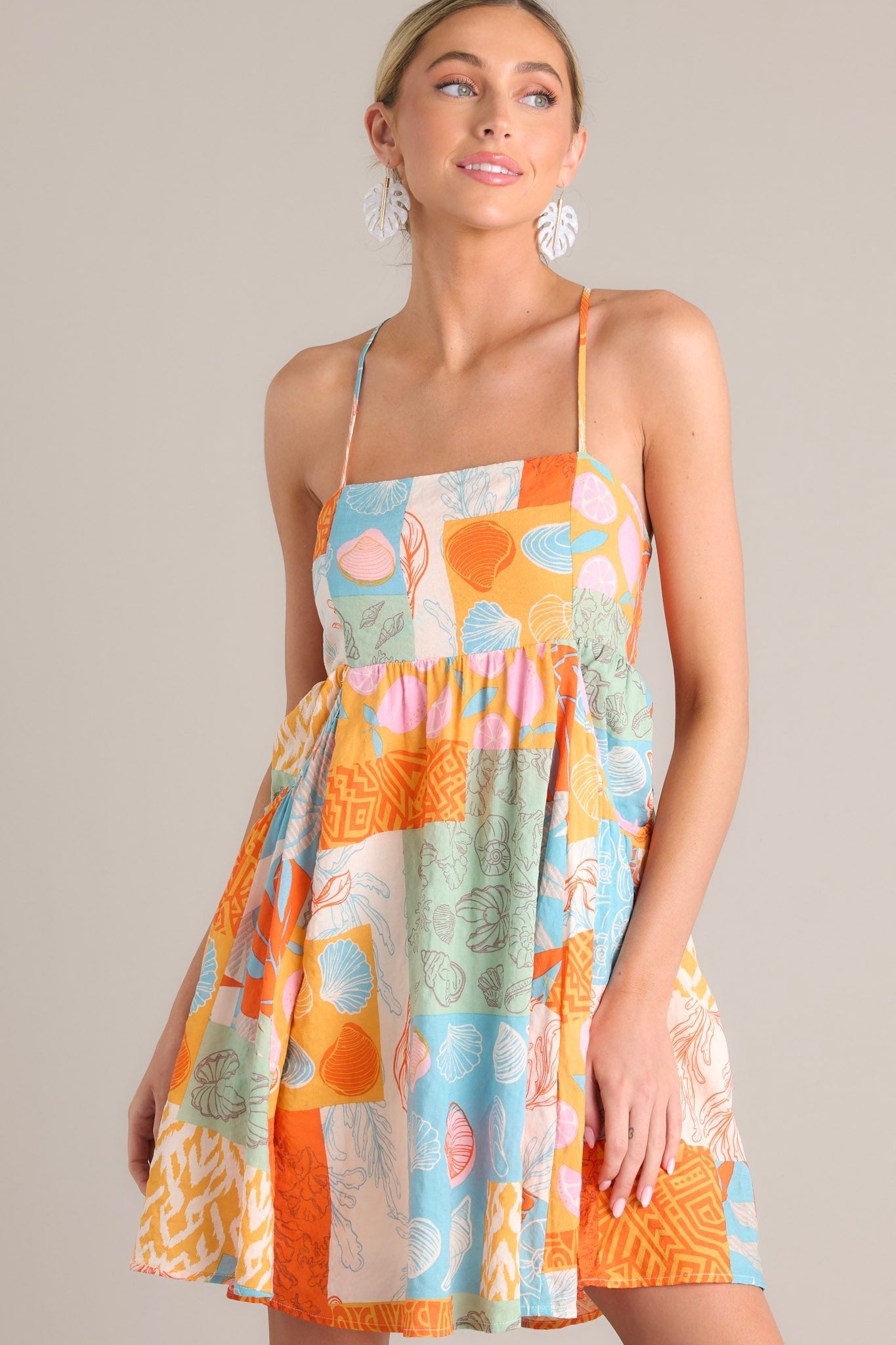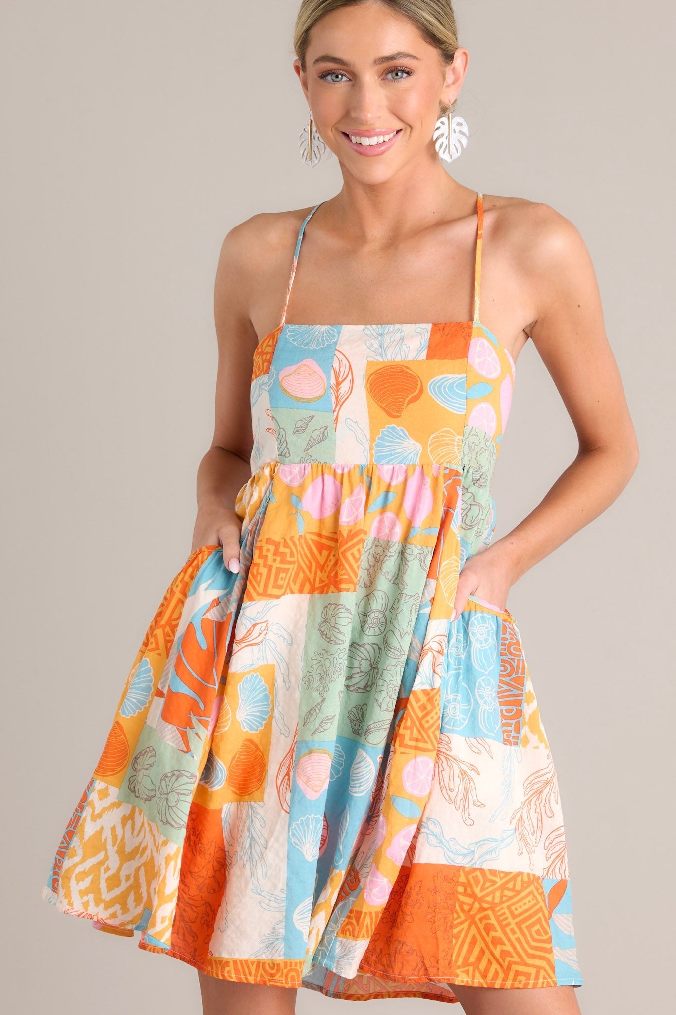 Get ready to add some fun and flair to your wardrobe with the Island Harmony Orange Tropical Patchwork Mini Dress! Featuring a vibrant mix of colors and patterns, this dress is sure to turn heads. Embrace the island vibes and feel the harmony of style and comfort in this playful piece! This dress features a square neckline, thin adjustable straps that self-tie in the back, an open back, an elastic back insert, and large functional pockets.
