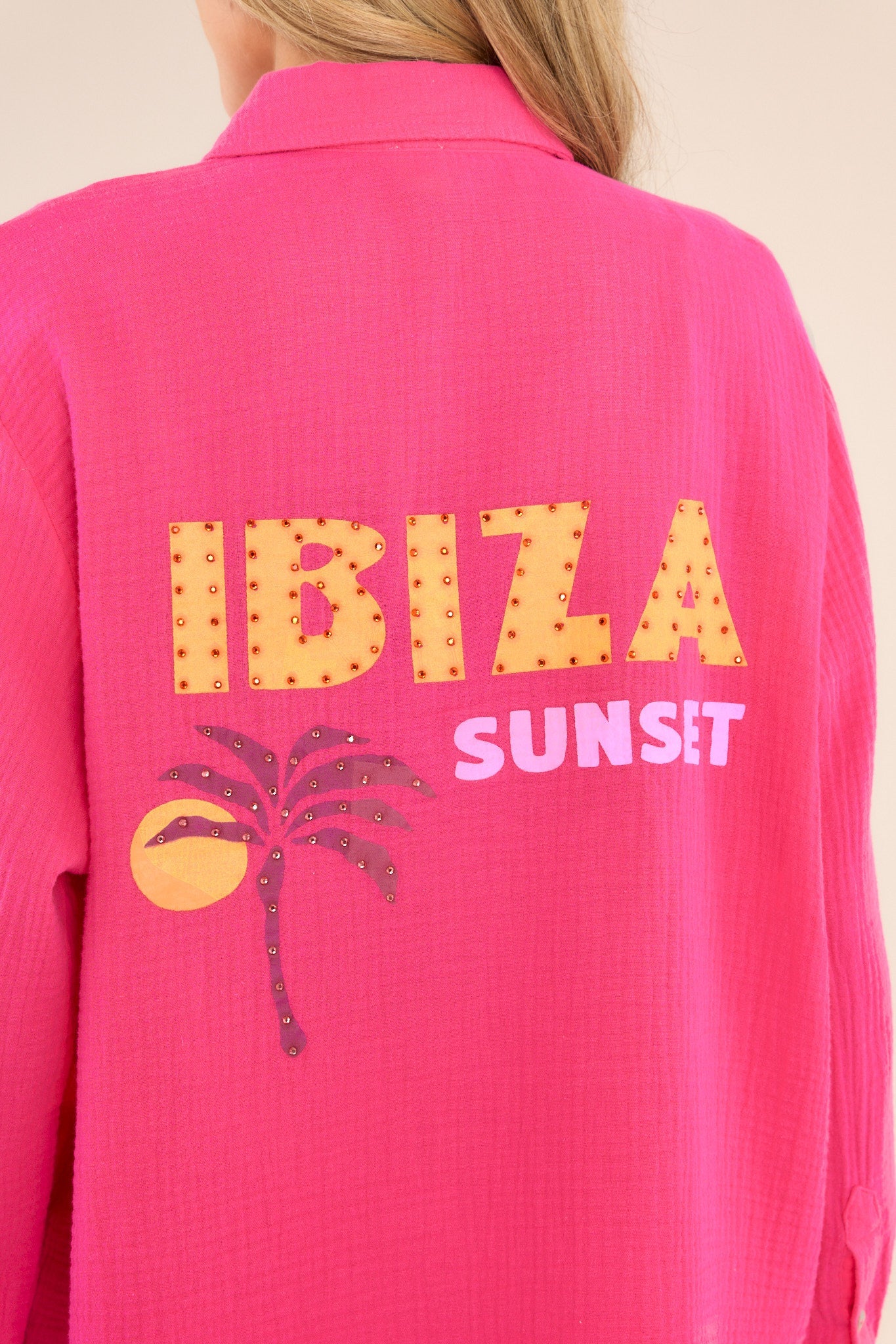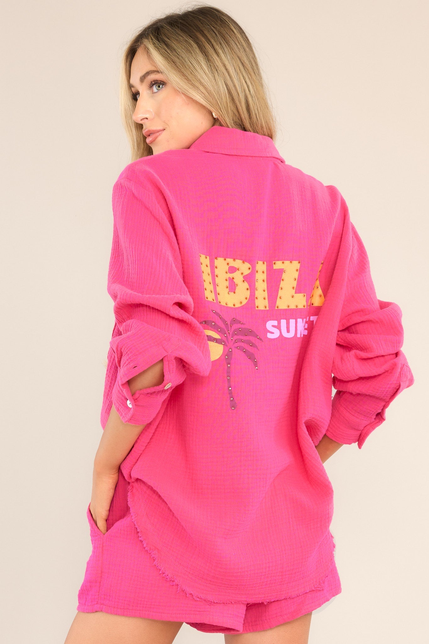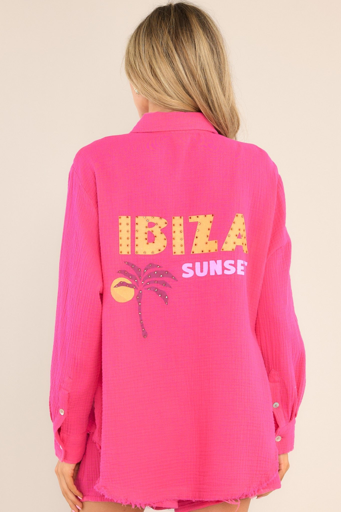Get ready for your next island adventure with the Island Hopping Hot Pink Gauze Button Front Top. Made from breathable gauze fabric with a button front design, stay cool and stylish as you explore. Perfect for beach days or pairing with your favorite shorts for a casual look! This top features a collared neckline, a full button front, a functional breast pocket, colorful rhinestone wording on the back, button cuffed sleeves, and a raw split hemline.