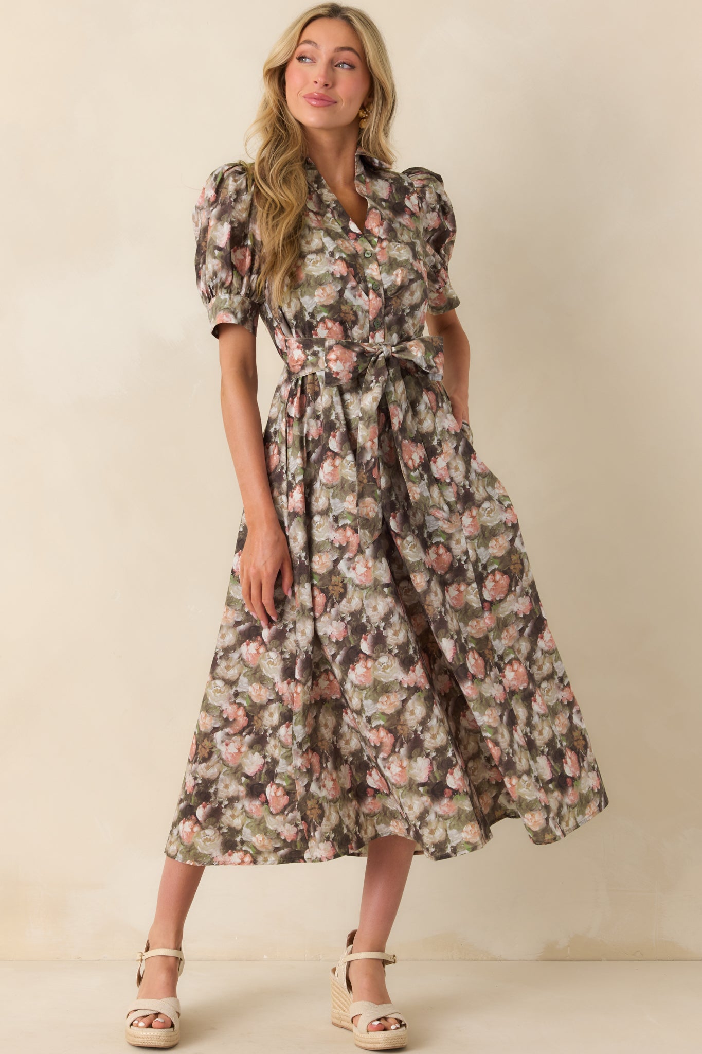 The It All Worked Out Olive Green Multi Floral Print Cotton Maxi Dress makes getting dressed feel effortless. With its easy charm and grounded elegance, it’s a piece that comes together beautifully just like the day ahead. This olive green maxi dress features a pink multicolor floral print, collared neckline, functional button front bust, short puff sleeves, functional button cuffs, back elastic waist insert, adjustable self-tie waist, and functional hip pockets.