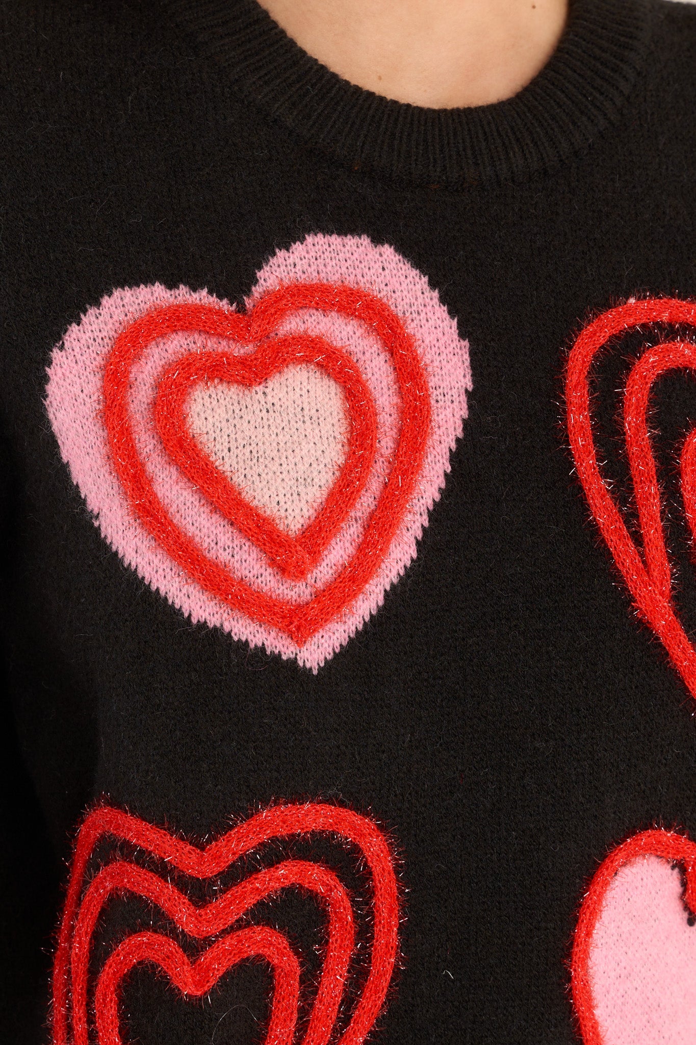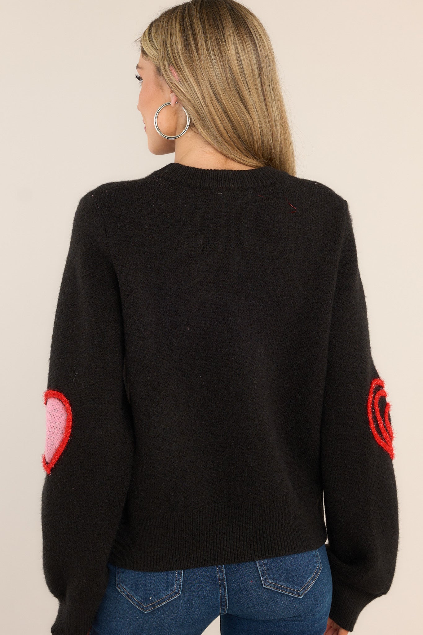 This cozy black sweater will steal your heart! Featuring embroidered hearts on the front, embroidered hearts on each elbow, ribbed hemlines, and cozy black fabric. Don't just wear your heart on your sleeve, wear it on your sweater!