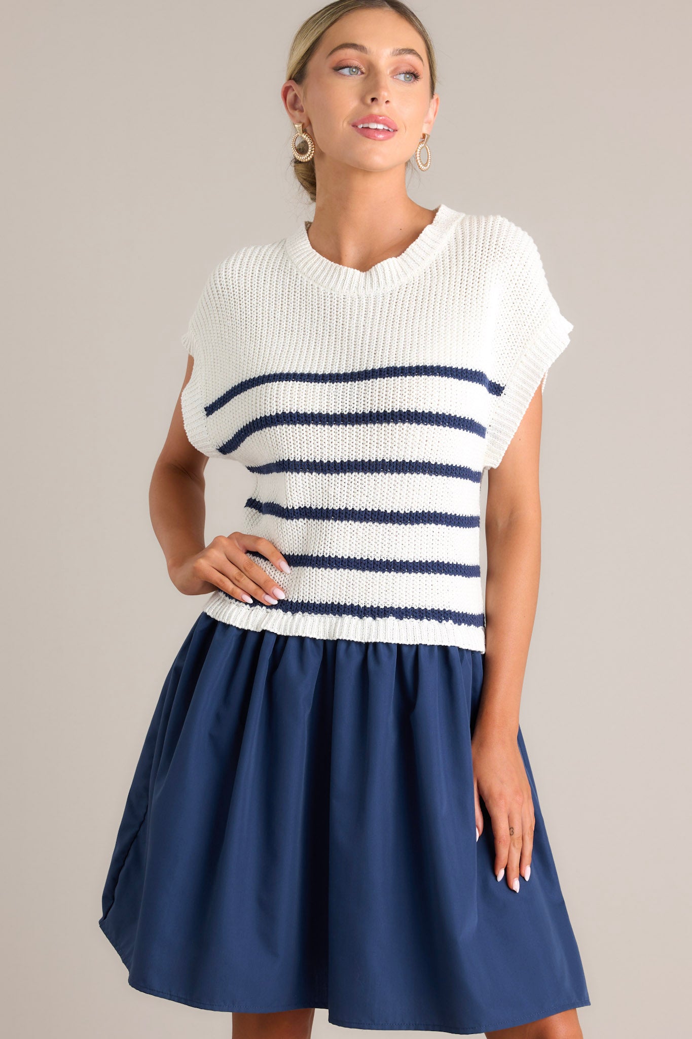 Keep your style journey going with this adorable Ivory & Navy Stripe Sweater Mini Dress. Made with cozy material, this dress is perfect for both casual and dressy occasions. The unique stripe design adds a playful touch to your outfits. Stay stylish and comfortable at the same time with this must-have piece! This dress features a crew neckline, a ribbed knitted bodice, horizontal stripes, and a solid flowy skirt. Belt is not included.