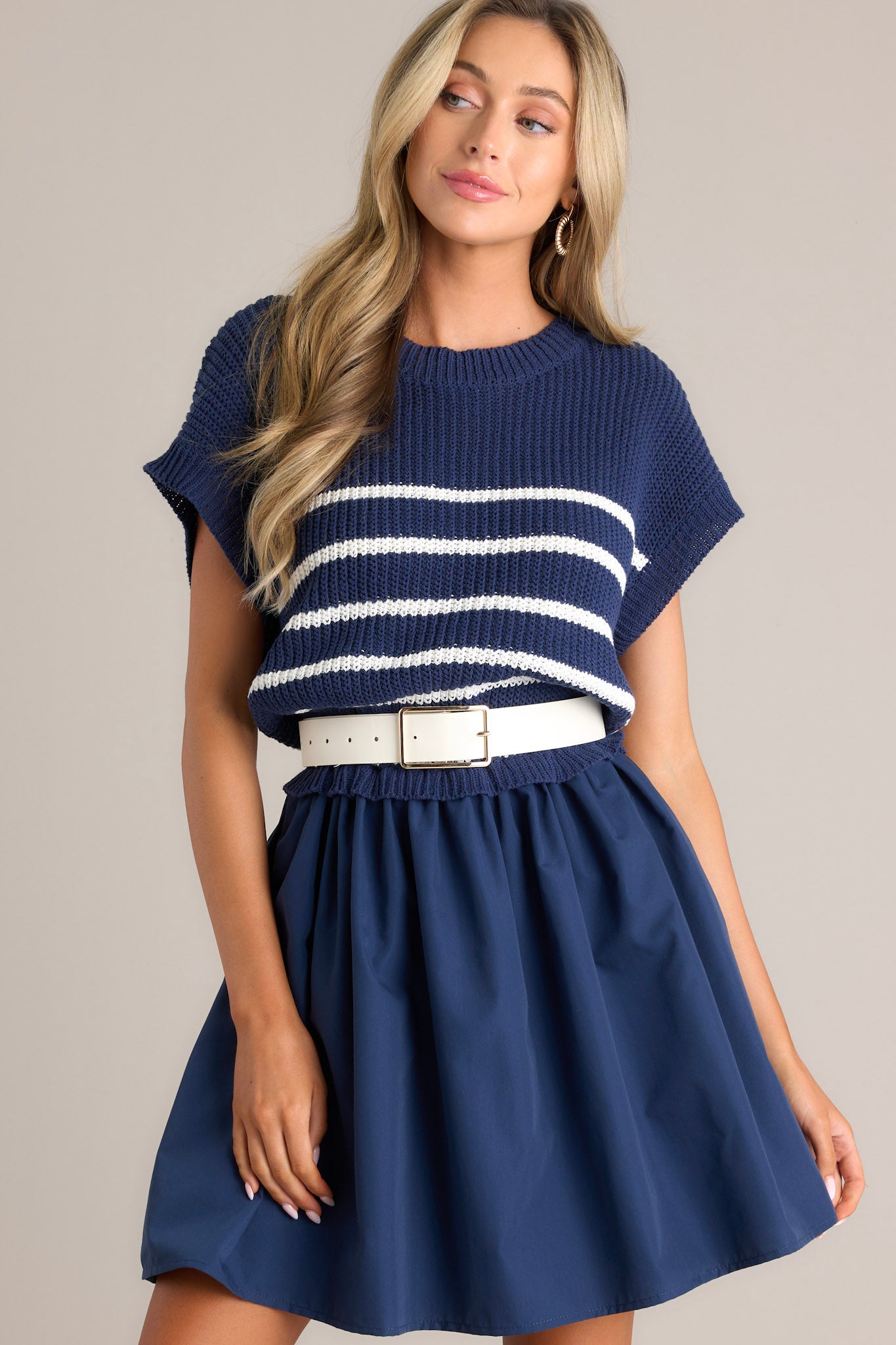 Keep your style journey going with this adorable Navy & White Stripe Sweater Mini Dress. Made with cozy material, this dress is perfect for both casual and dressy occasions. The unique stripe design adds a playful touch to your outfits. Stay stylish and comfortable at the same time with this must-have piece! This dress features a crew neckline, a ribbed knitted bodice, horizontal stripes, and a solid flowy skirt. Belt is not included.