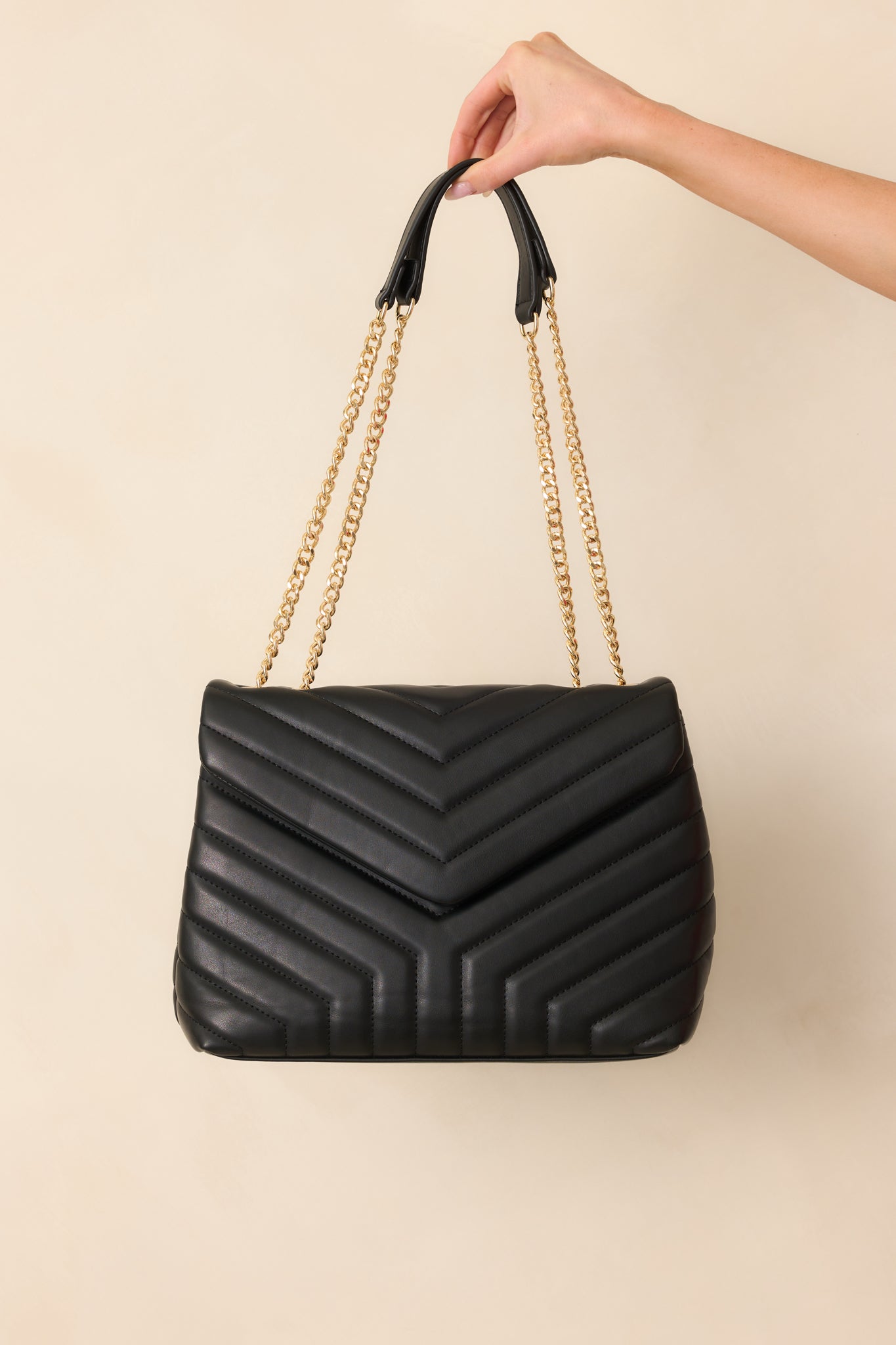 Find your perfect accessory with the Just Let It Be Black Quilted Handbag. This stylish and durable bag features red stitching that adds a pop of color to any outfit. With plenty of room for all your essentials, you'll love how easy it is to carry everything you need in one chic and convenient bag. Let yourself be stylish and functional with this handbag. This black handbag features a quilted design and rectangle shape, a snap flap closure, a black zipper closure, two gold chain handles with black faux leather handles, a matching black quilted wallet, and interior zipper pockets.
