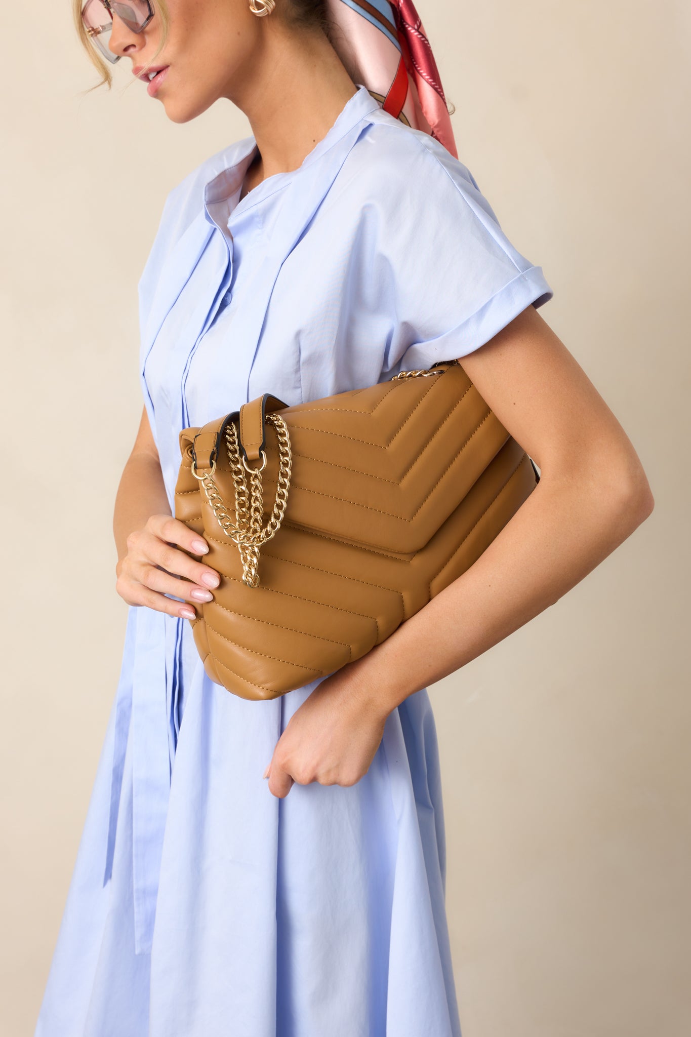 Find your perfect accessory with the Just Let It Be Tan Quilted Handbag. This stylish and durable bag features tan stitching that adds a touch of detail to any outfit. With plenty of room for all your essentials, you'll love how easy it is to carry everything you need in one chic and convenient bag, letting yourself be stylish and functional. This tan handbag features a quilted design and rectangle shape, a snap flap closure, a tan zipper closure, two gold chain handles with tan faux leather handles, a matching tan quilted wallet, and interior zipper pockets.