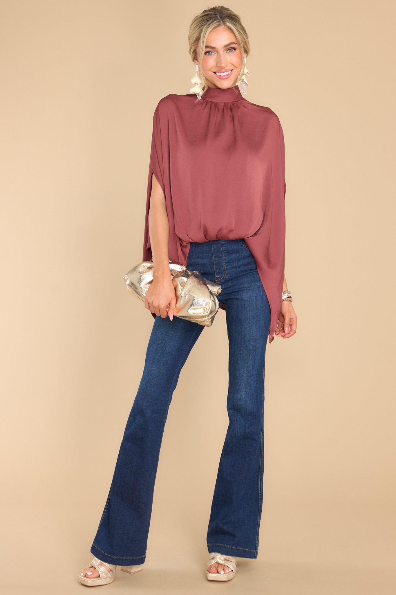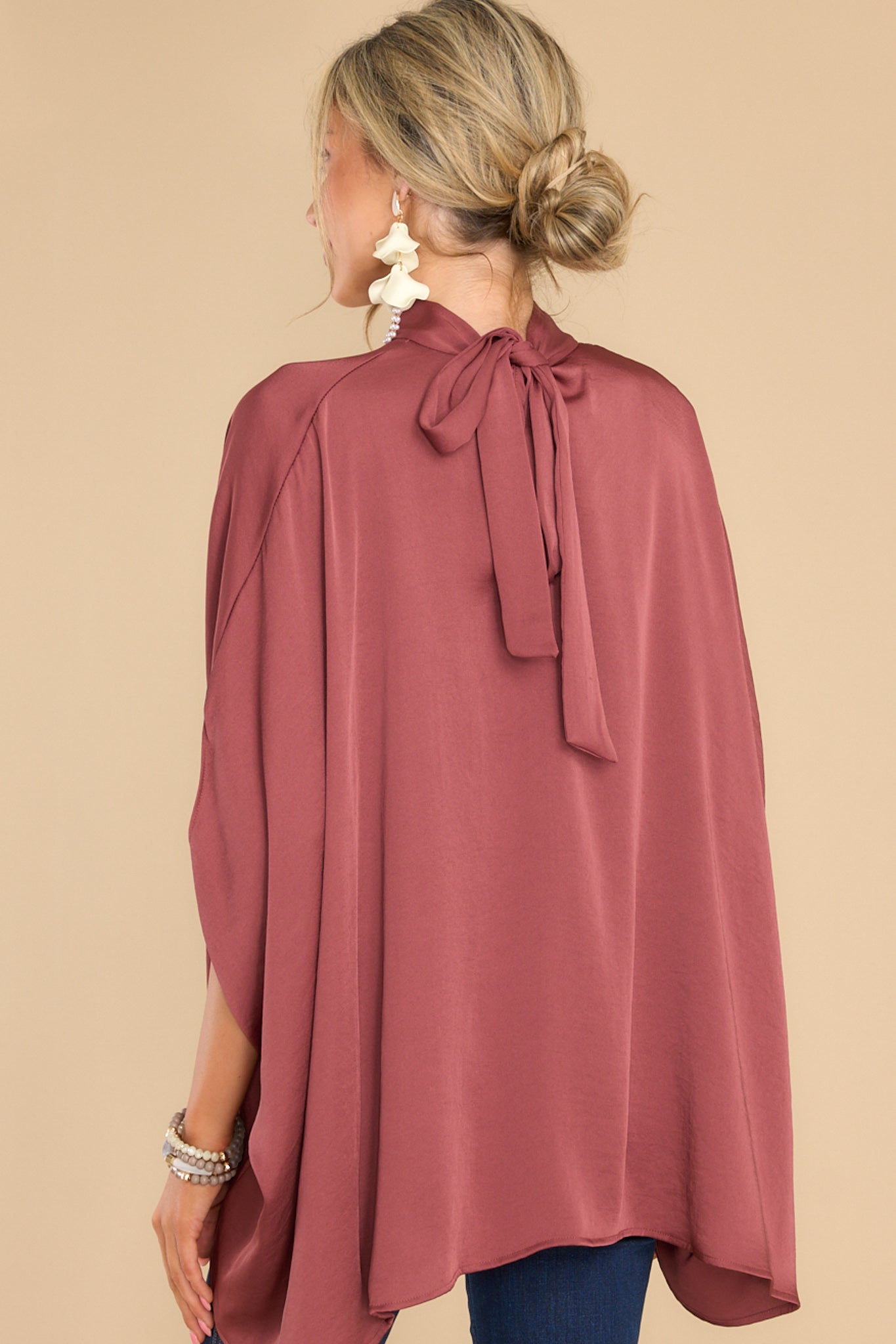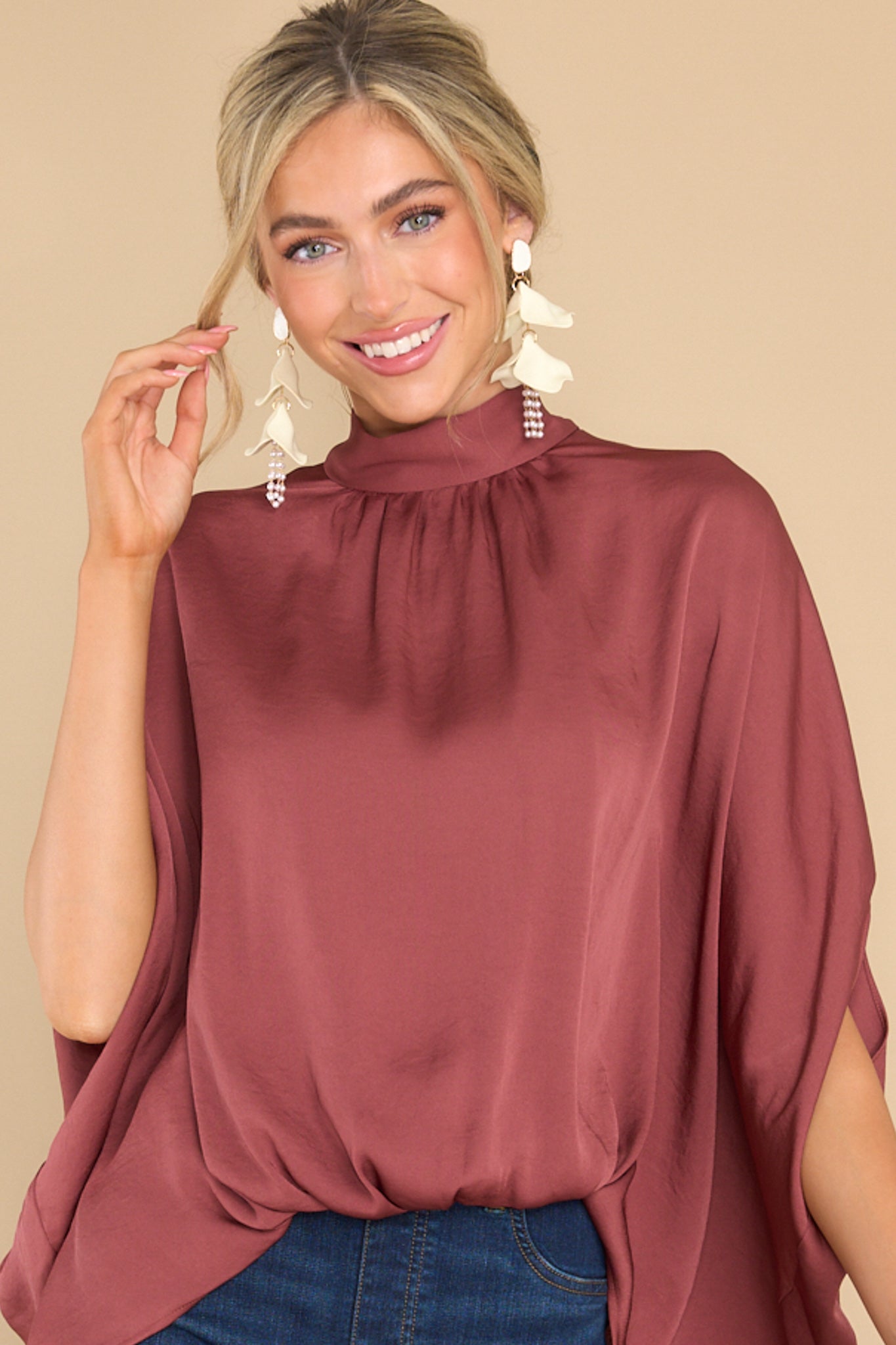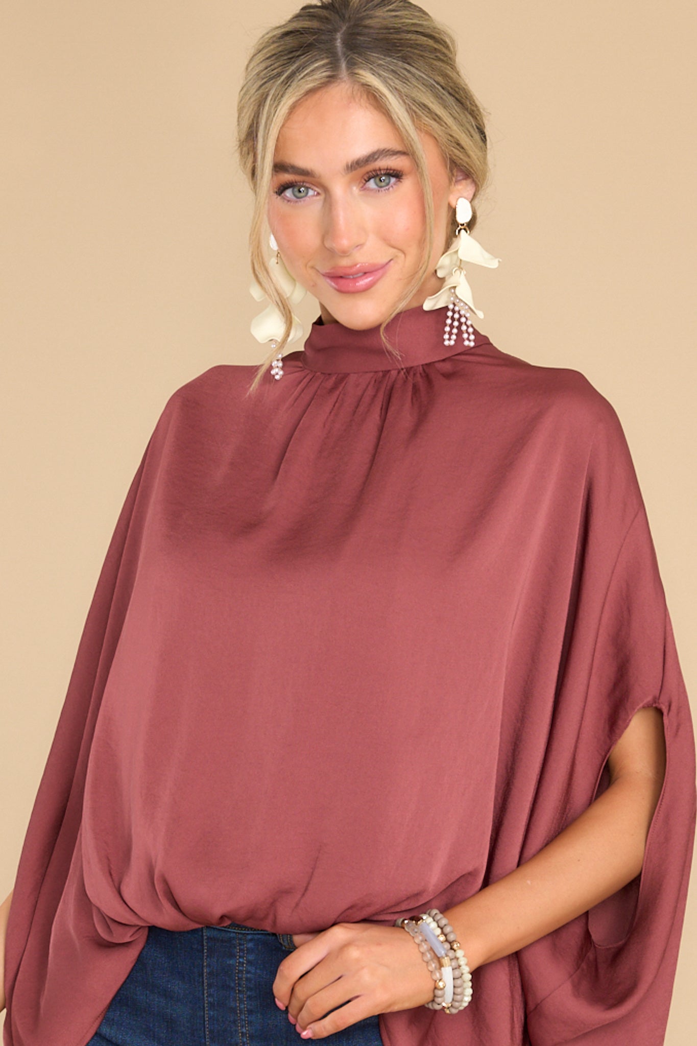This Kiss And Won't Tell Copper Top is the perfect date night companion! The lightweight material will keep you comfortable all night, while the cute details will be sure to turn heads. Wear it out and get ready for your night of flirtation and fun! This top features a high neck, a self tie on the back of the neck area, and short batwing sleeves. Model is wearing a small. • 100% Polyester • Hand Wash Cold • Unlined • Made in U.S.A