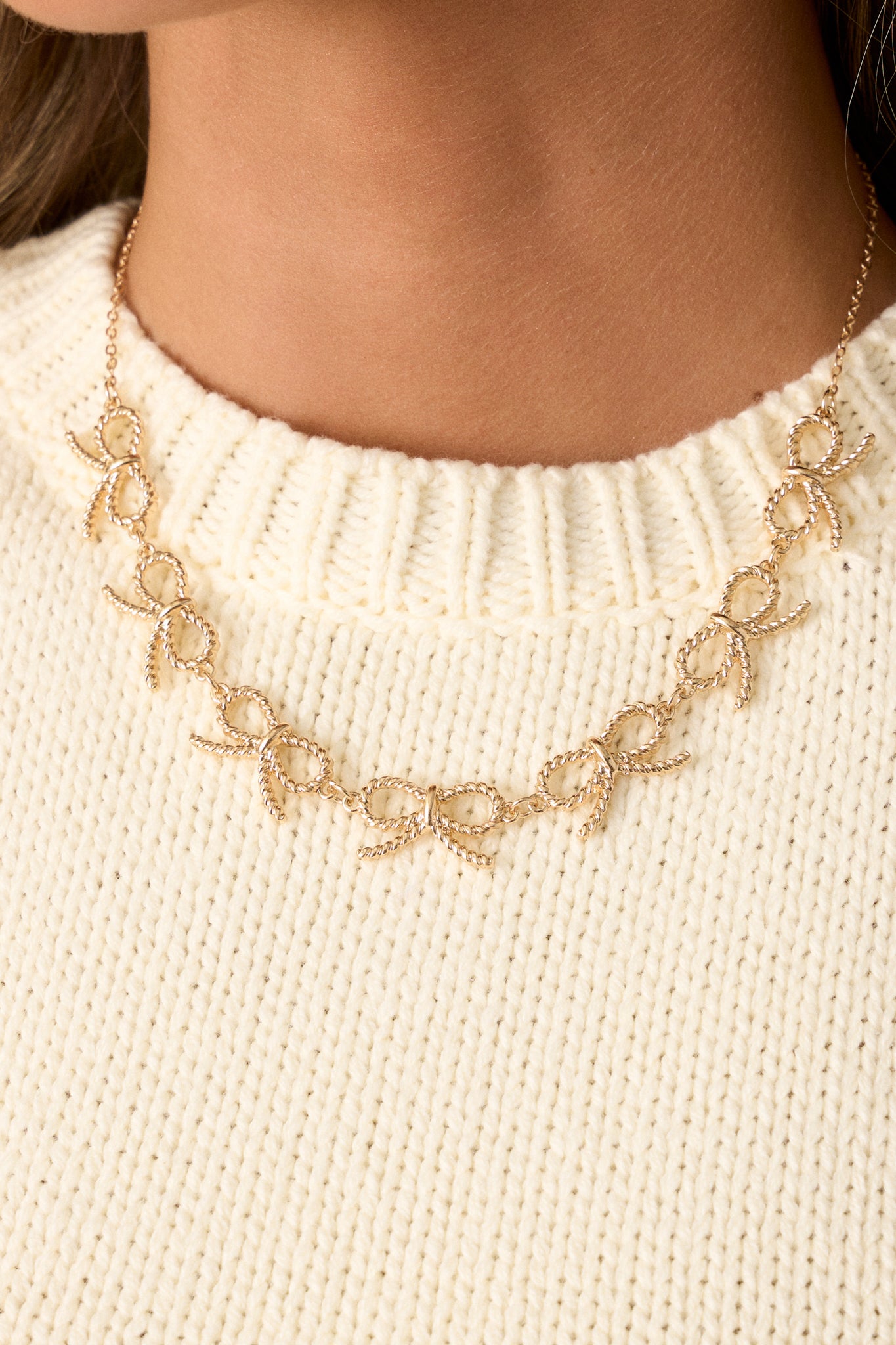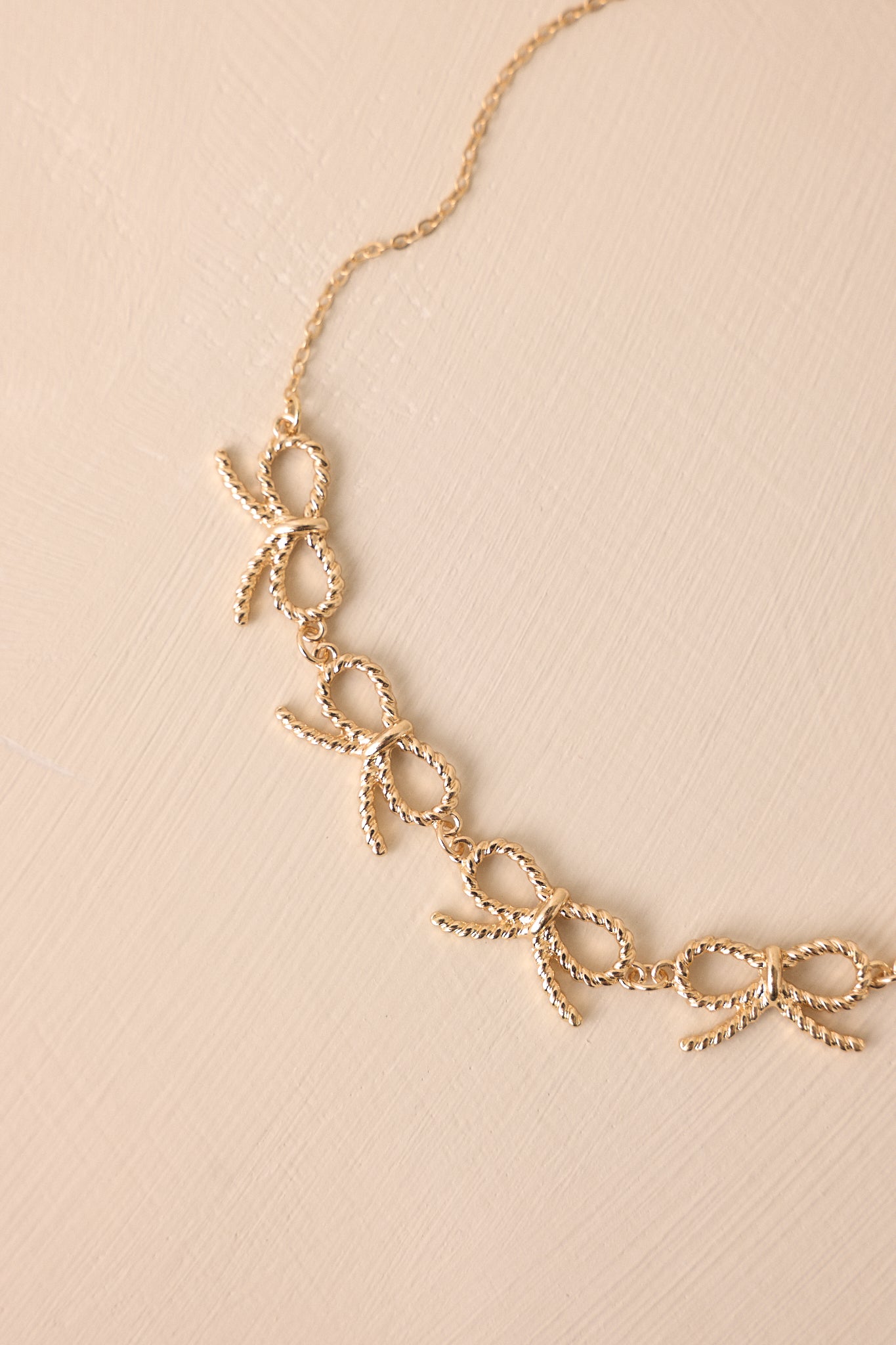 Unleash your inner fashionista with our Know The Feeling Gold Bow Necklace. This elegant piece features a delicate bow pendant crafted in gold for a touch of sophistication. Perfect for any occasion, this necklace will add a touch of charm to any outfit. Elevate your style and confidence with this stunning accessory. This gold necklace features gold hardware, a thin gold chain, seven gold rope textured bows and a lobster claw closure.