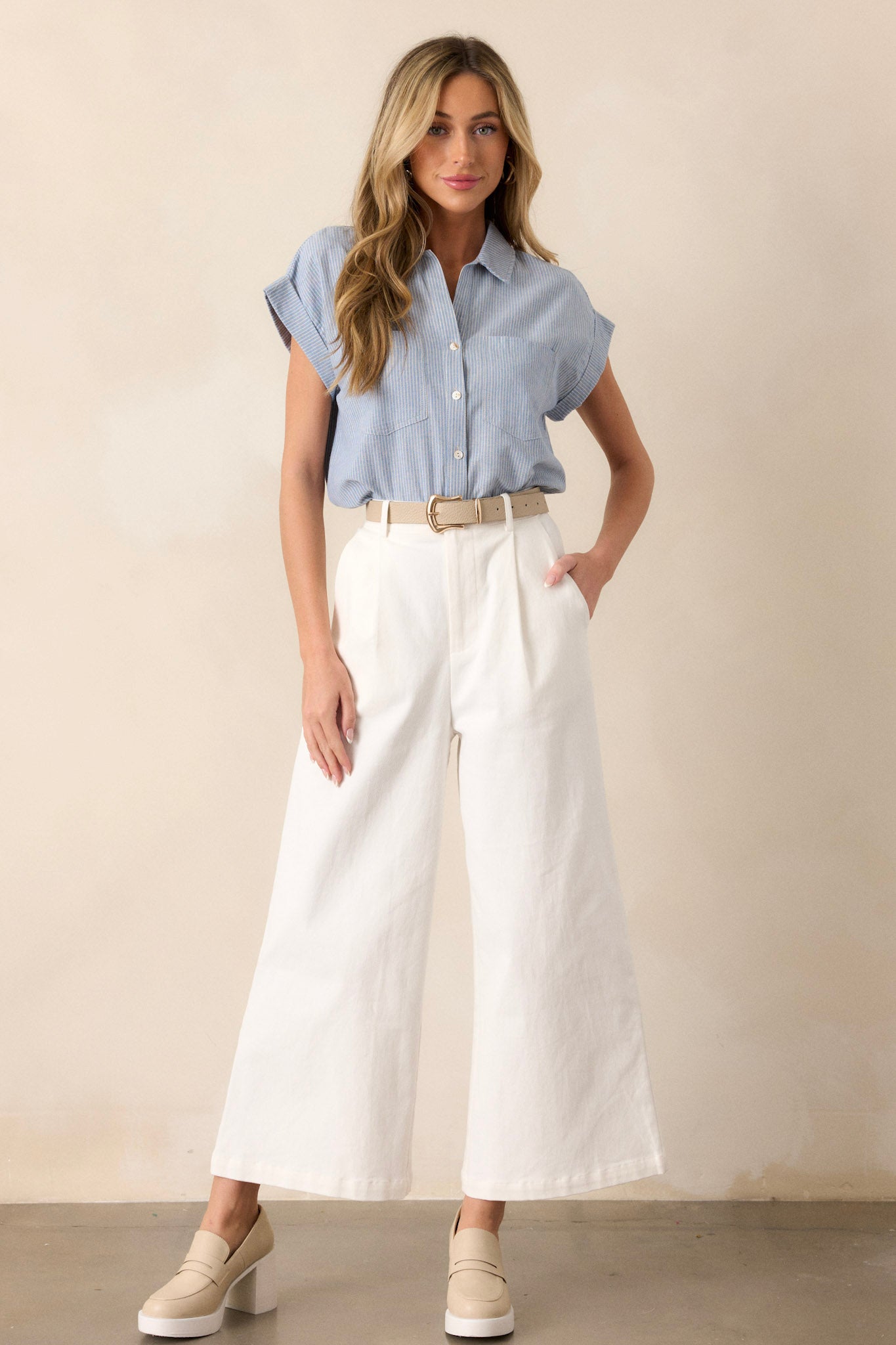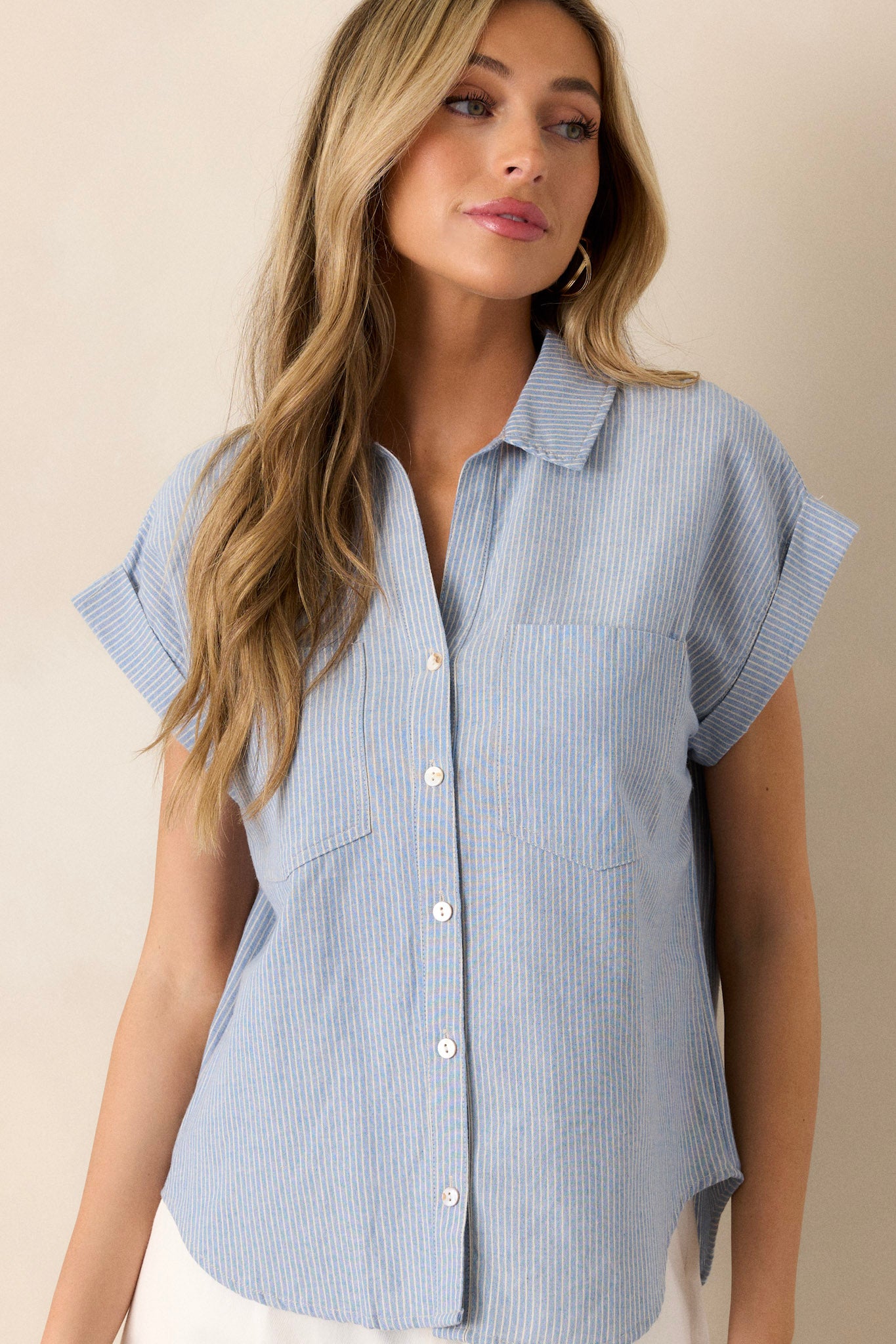 Empower your wardrobe with the Know The One Light Blue Striped Button Front Top. This versatile top features a flattering button-down design and chic blue stripes. Perfect for any occasion, it will elevate any outfit with a touch of sophistication and style. Experience the confidence and elegance that comes with this must-have top. This light blue stripe top features a collared v-neckline, a functional button front, a vertical stripe pattern, functional bust pockets, and cuffed short sleeves.