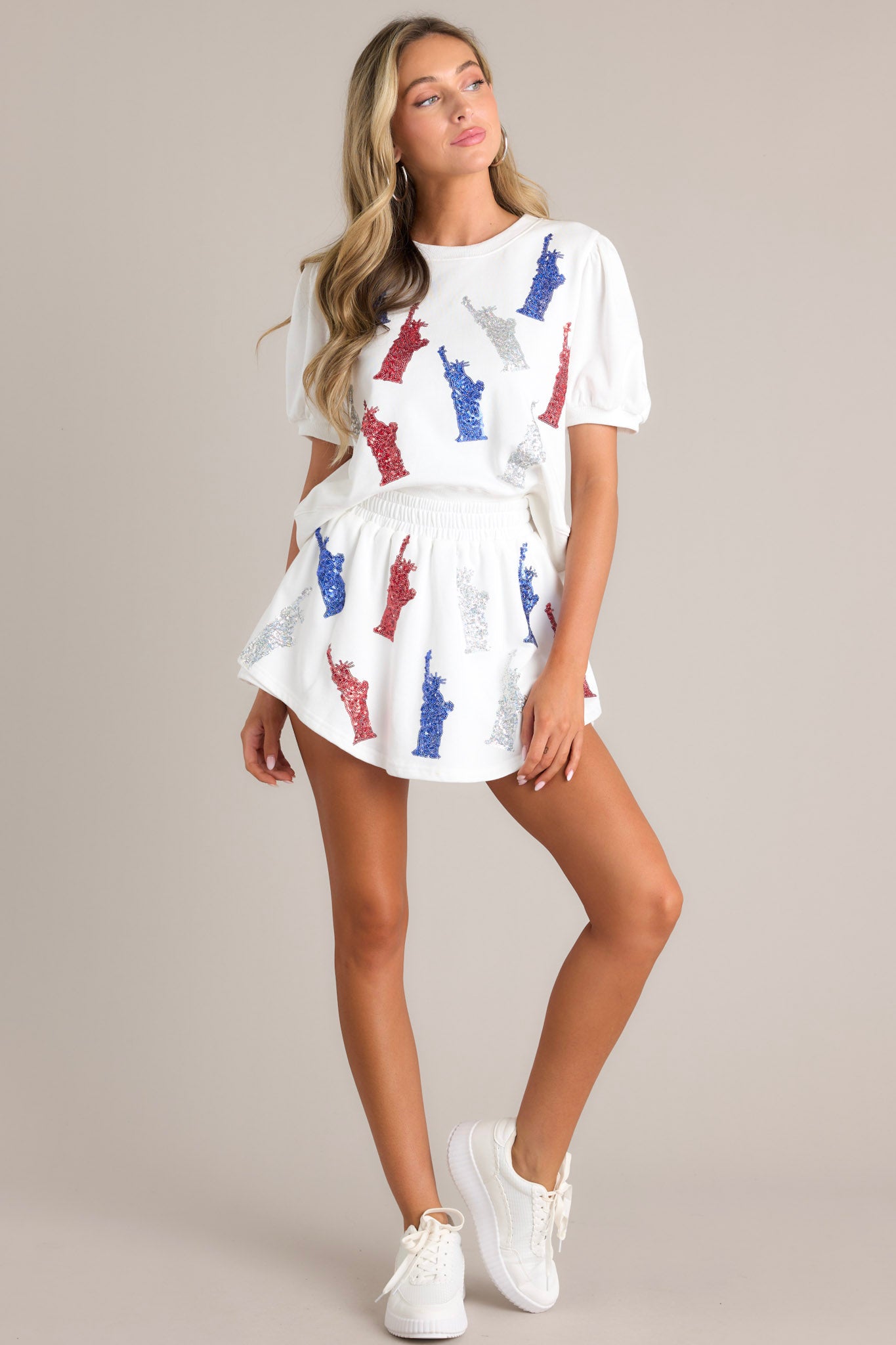 This white skort features a high waisted design, an elastic waistband, sequin Lady Liberties, a skirt in the front, and shorts in the back.