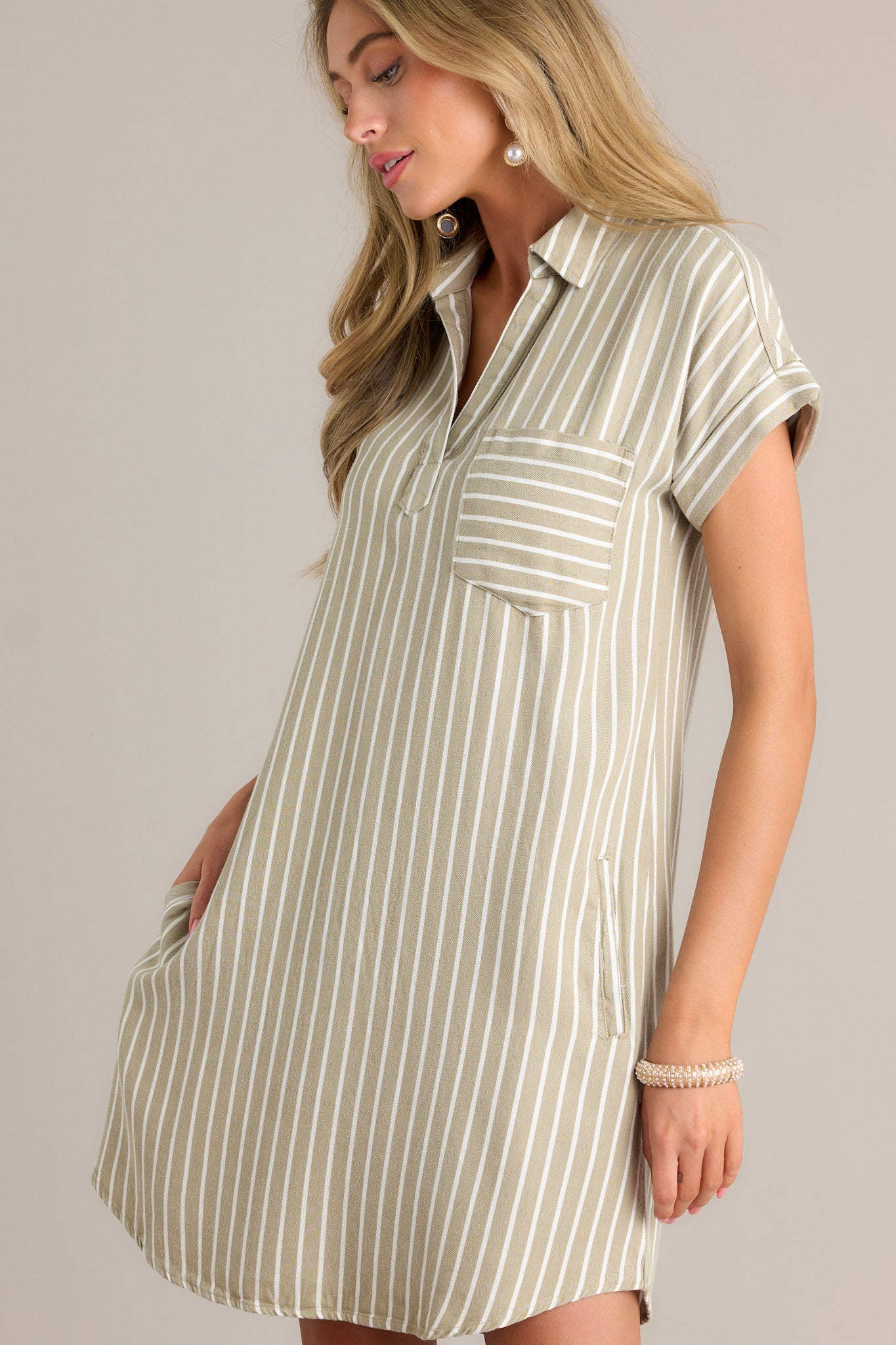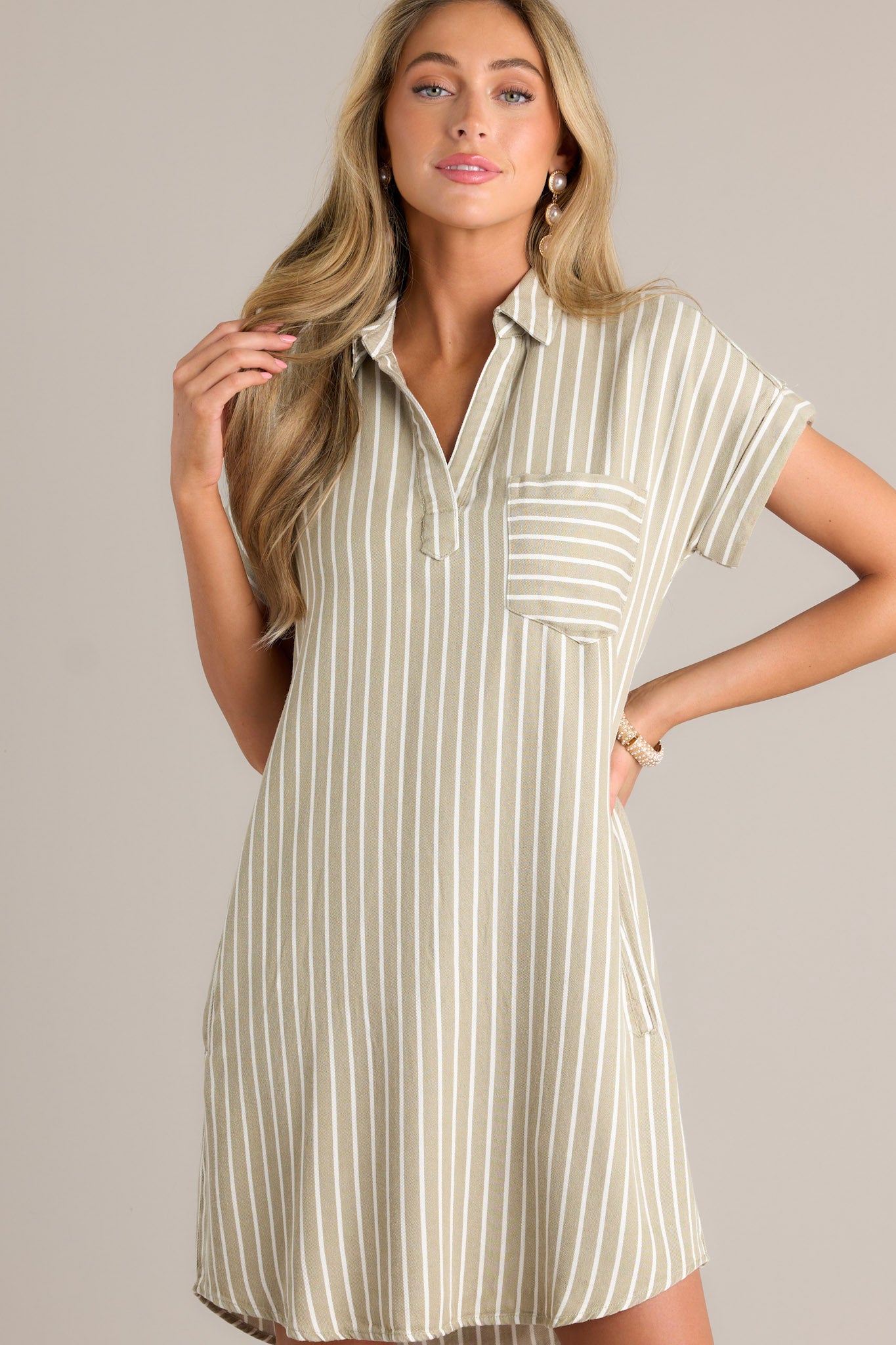 Get ready to turn heads in our Linear Elegance Olive Green Stripe Mini Shirt Dress! This dress features a playful mini length and flattering striped pattern, making it perfect for any occasion. Show off your unique and quirky style in this effortlessly chic piece. This olive green dress features a collared v-neckline, a functional breast pocket, a relaxed fit, functional hip pockets, and a scoop hemline.