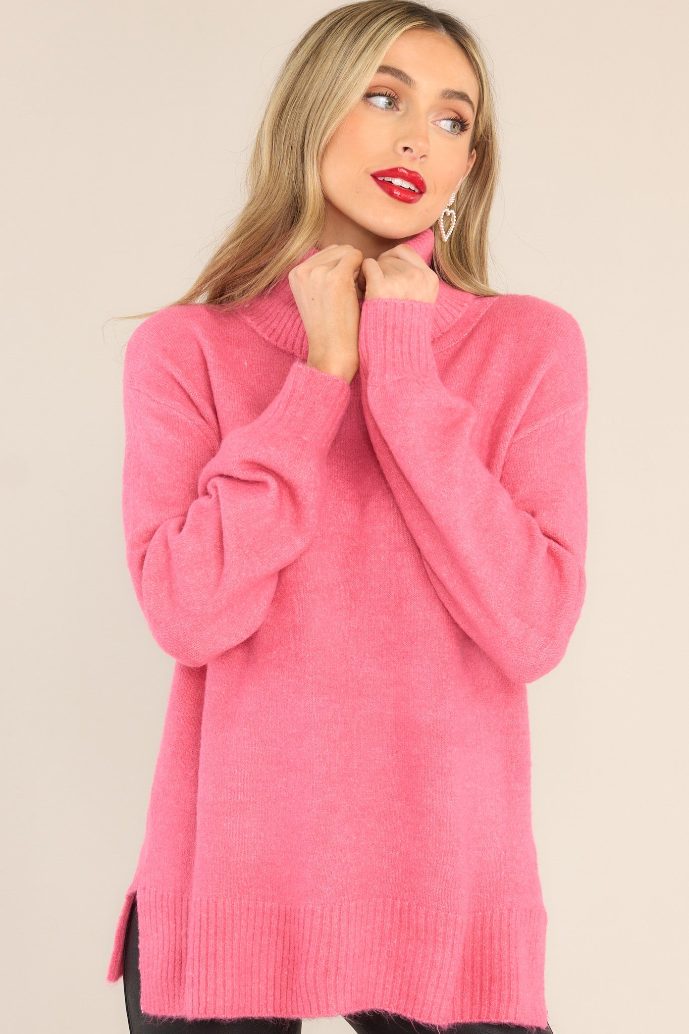 Stay warm and rock the streets with our Livin' Life Hot Pink Sweater! The sweater is designed with an extra-long fit and ribbed cuffs, so you can stay in style and comfortably cozy no matter the season. Throw this on and you'll be livin' life in a fashionable, and toasty, way! This sweater features a cowl neckline, long bishop sleeves with stretchy cuffs, and a ribbed bottom hemline with small slits up the sides.