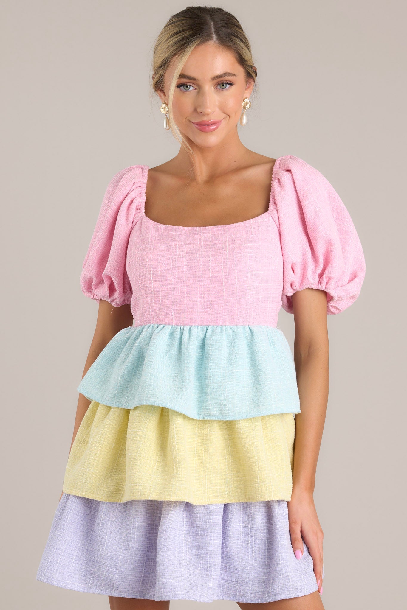 Step into a world of enchantment with our Living In Wonderment Pastel Mini Dress. Let the soft pastel colors and flowy fabric transport you to a land of whimsy and delight. Perfect for a spring occasion, this dress will make you feel like a true fairy tale princess. Embrace the magic today! This dress features a square neckline, an open back, a discrete zipper, multiple colorful tiers, a super soft material, and elastic cuffed puff sleeves.