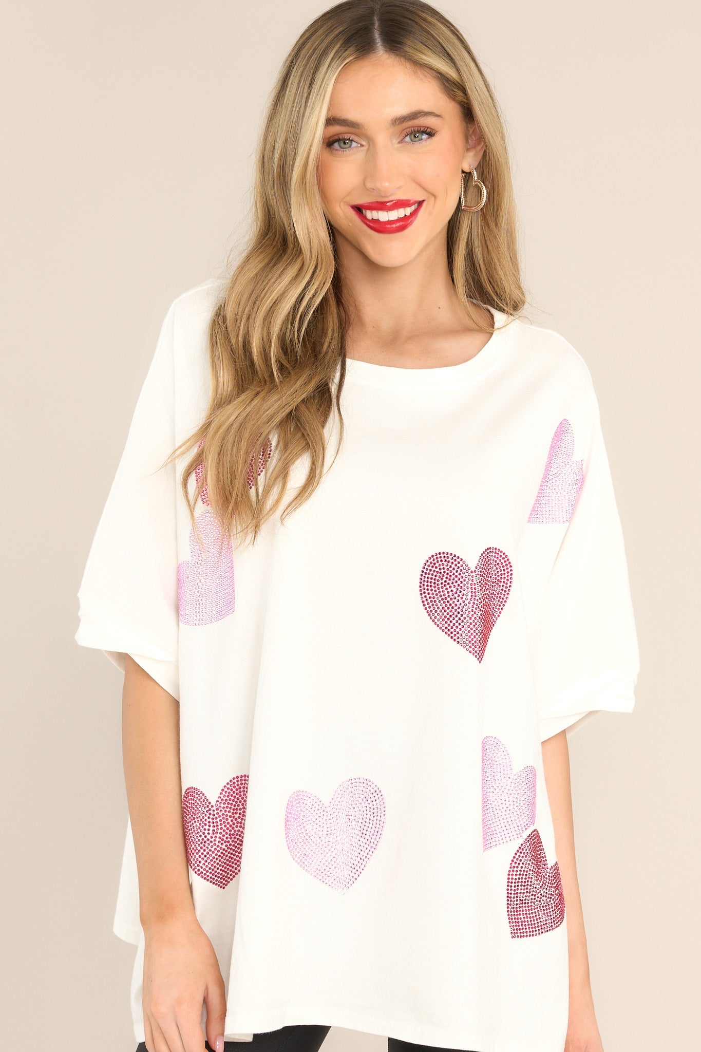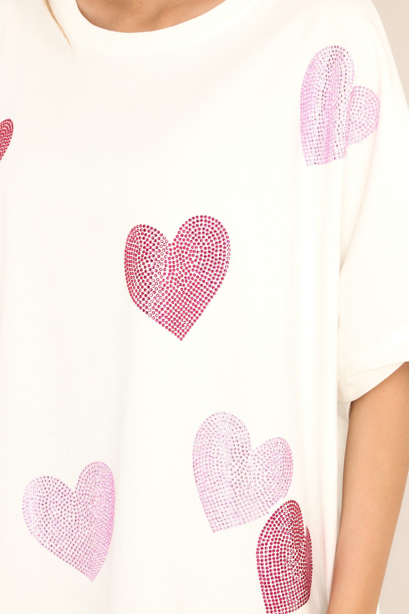 Get ready to steal hearts with this oversized tee! This top features pink rhinestone hearts throughout, short sleeves, crew neckline, and oversized fit. The soft white fabric and pink heart design will keep you comfortable and stylish all day long.
