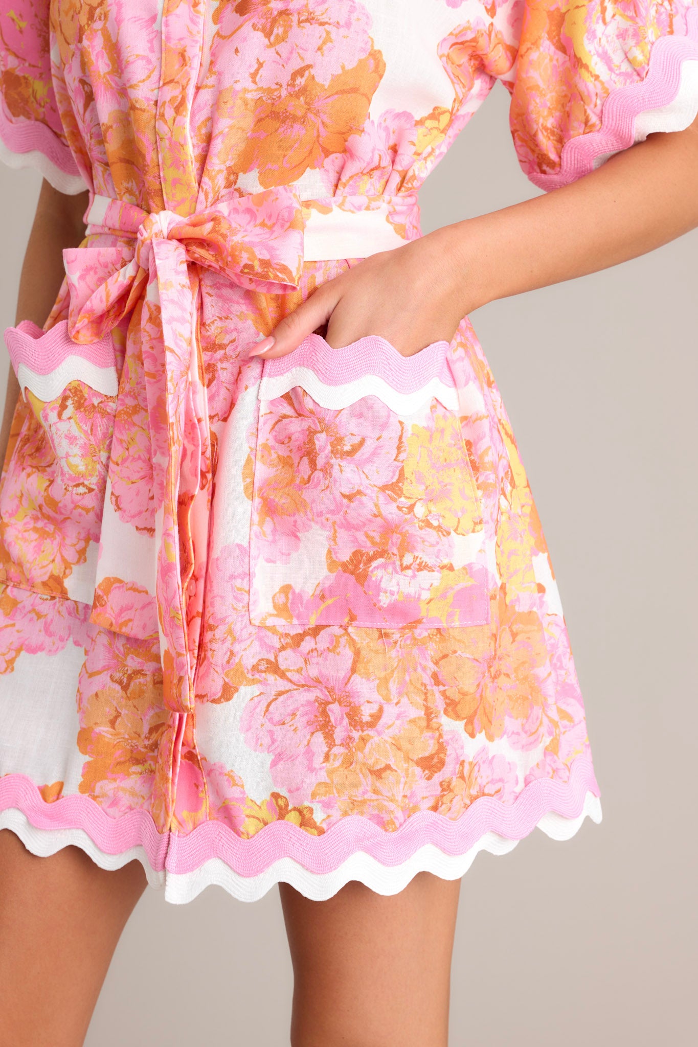 Get ready to fall in love with our Long Time Love Light Pink Floral Mini Shirt Dress! This floral dress is perfect for any occasion, with its playful mini length and airy fabric. Stay stylish and comfortable in this unique and quirky dress. This light pink floral mini dress features a collared neckline, a functional button front, a self-tie waist belt, functional pockets, ricrac trim throughout, and short sleeves.