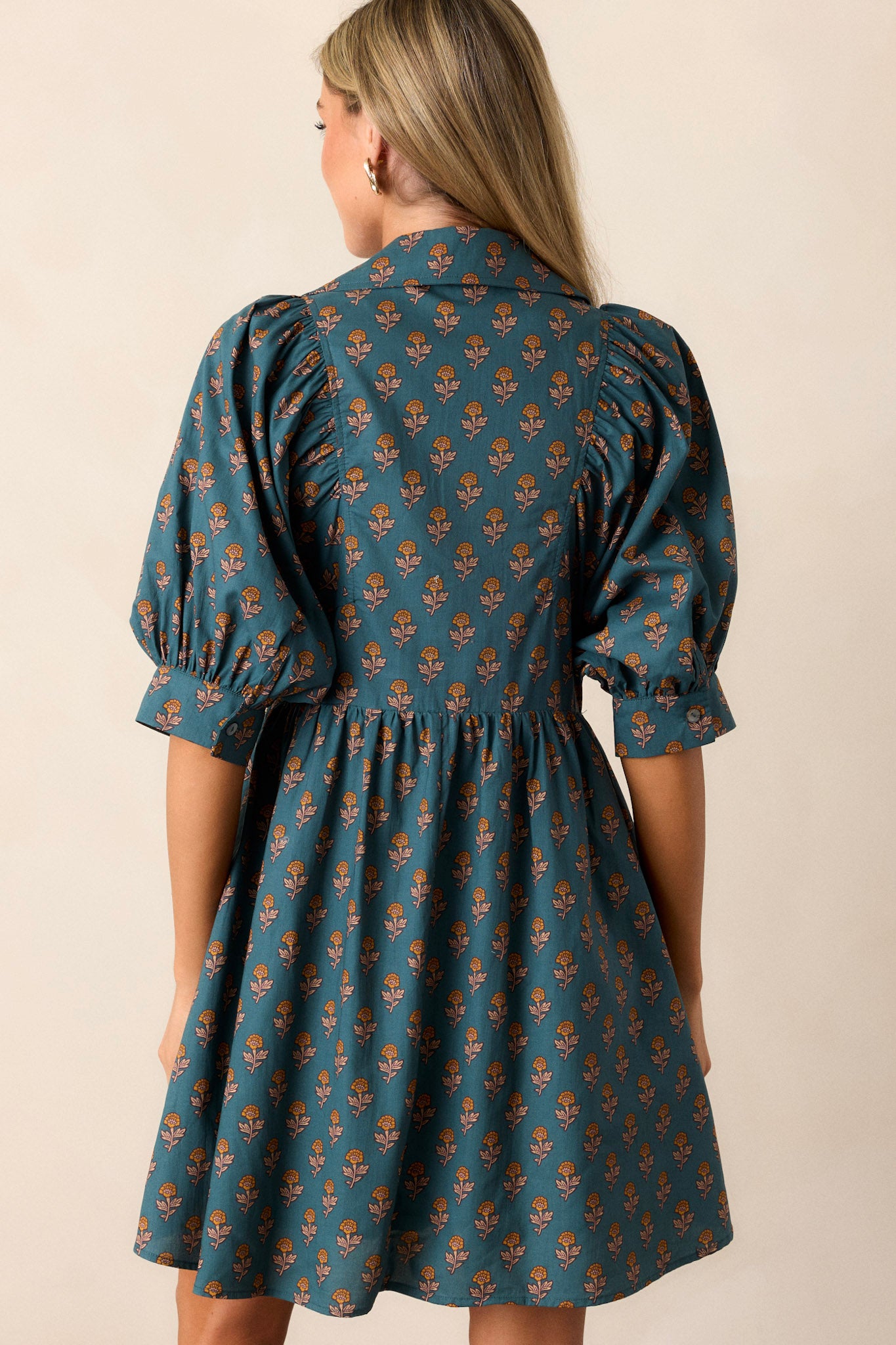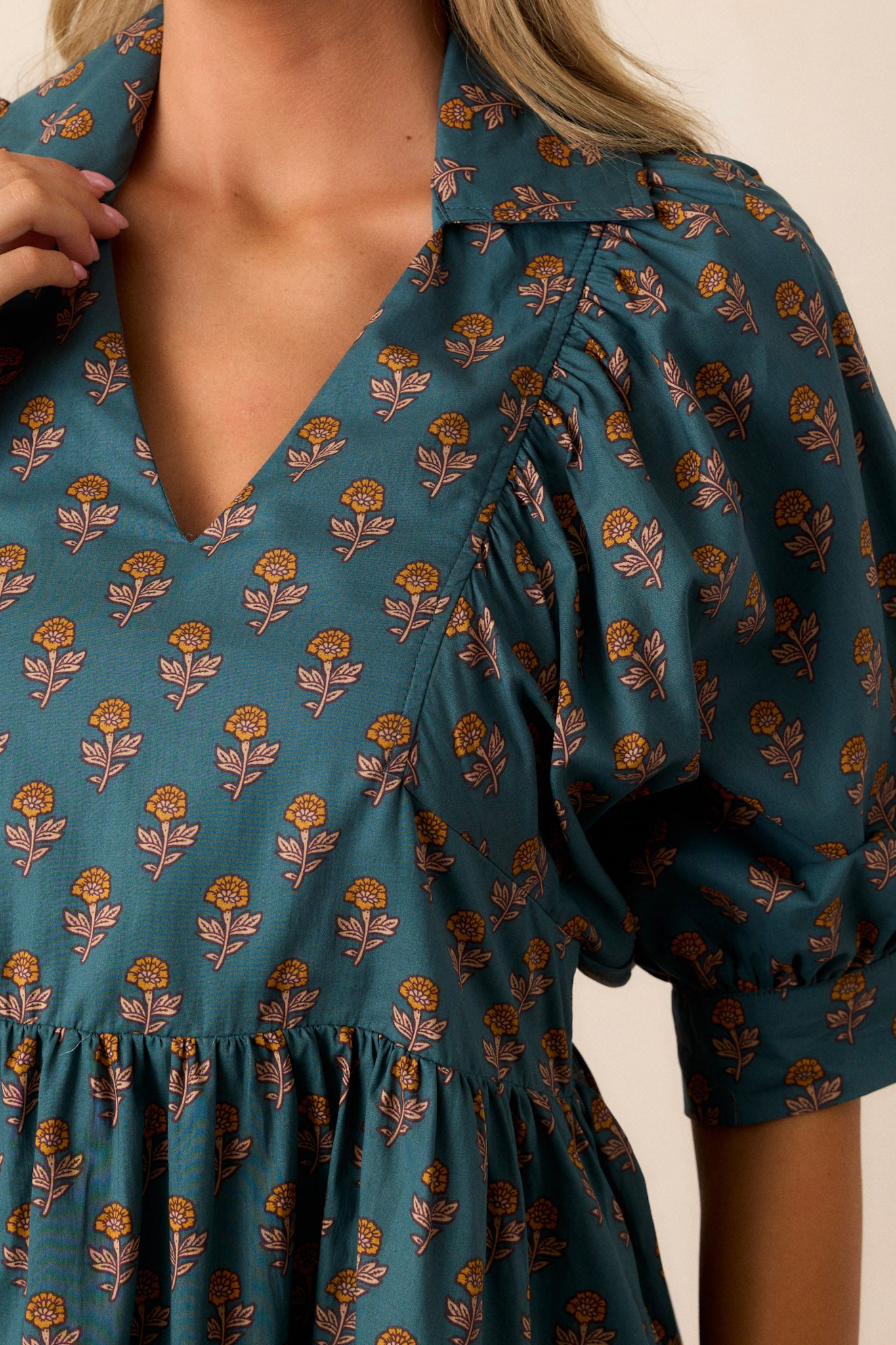 Dare to be bold with this Look On Your Face teal floral mini dress! Turn heads and make a statement with the vibrant teal color and beautiful floral pattern. This dress will have you feeling confident and adventurous. This teal dress features side pockets, a small v-neck and puff sleeves.
