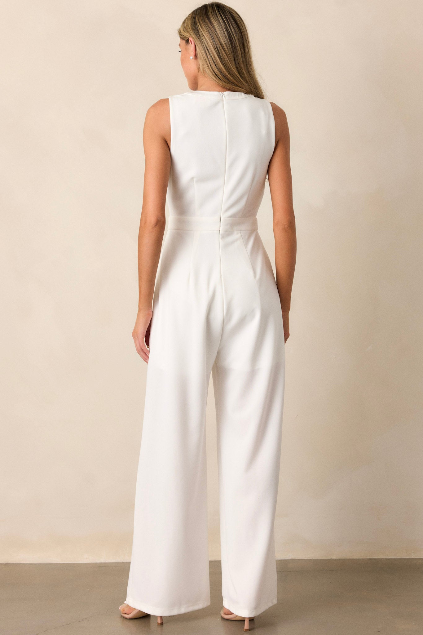 Experience ultimate comfort and style in our Luminous Bliss White Sleeveless Jumpsuit! Featuring a sleek design and sleeveless cut, this jumpsuit will have you feeling effortlessly chic. Its soft and luminous fabric will keep you cool and comfortable all day. Rock this jumpsuit in any season for an effortlessly stylish look! This white jumpsuit features a round neckline, a discrete back zipper, three ornate bows embellished with faux ivory pearls and rhinestones, a chest cutout, a thick waistband, subtle pleats, functional hip pockets, and a wide leg design.