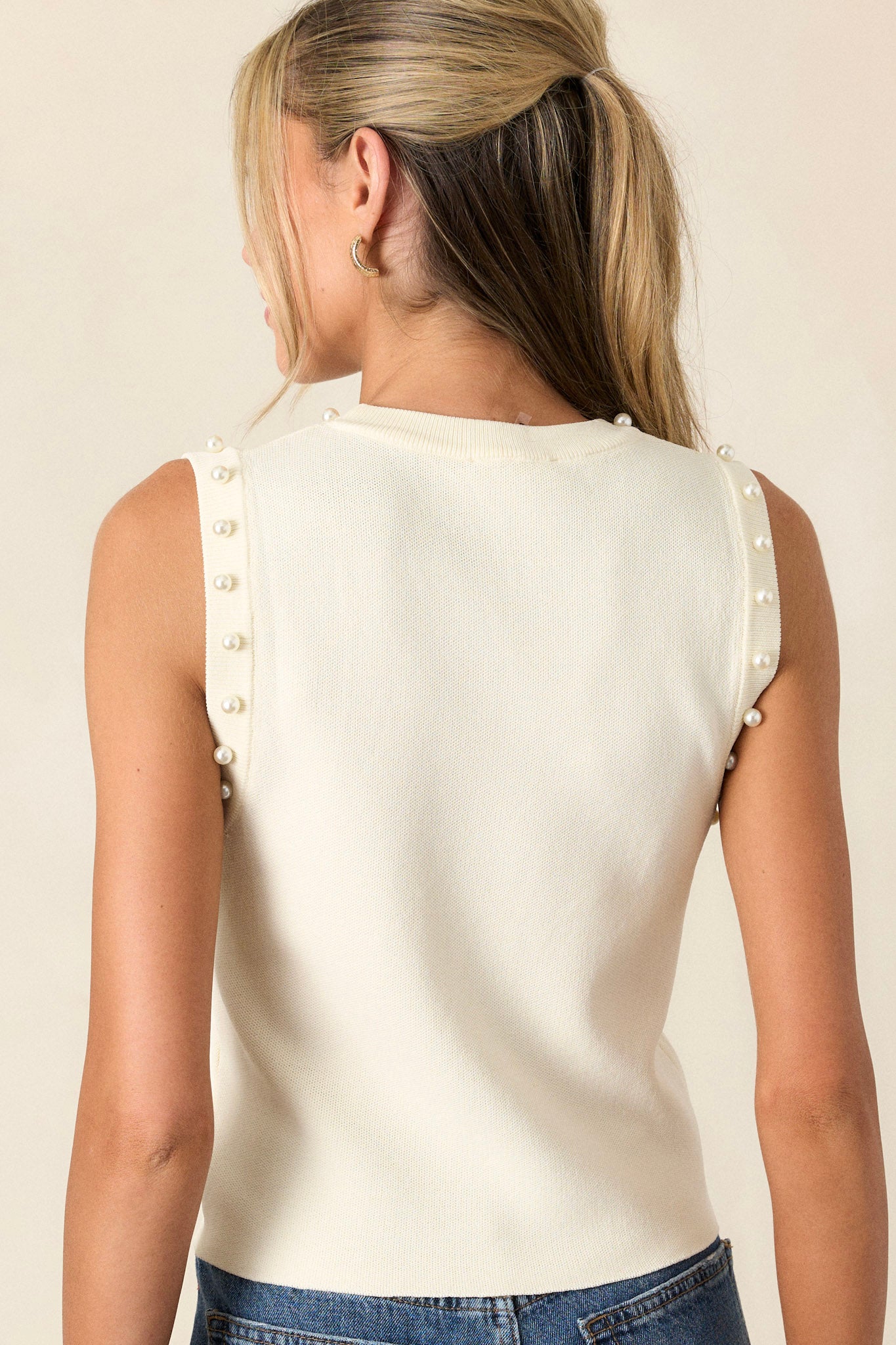 Add some pizzazz to your wardrobe with the Luminous Glow Ivory Pearl Tank Top! This playful tank features shimmering pearl accents that will make you stand out from the crowd. Perfect for layering or wearing on its own, this tank will give your outfit a touch of fun and shine. This ivory tank top features a pearl embellished scoop neckline, a soft material, pearl embellished sleeves, and a slightly cropped hemline.