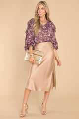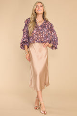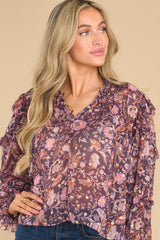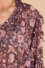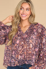 Be date-ready for whatever occasion comes your way with this multi-hued dark purple floral print top. Its lightweight fabric and airy fit will make you wanna stay all night! Great for a romantic dinner or a cozy night in! This sheer top features a self-tie detail at the neckline, functional buttons, long sleeves with elastic cuffs, and a flowy silhouette. Model is wearing a small. • 100% Polyester • Hand Wash Only • Unlined • Imported