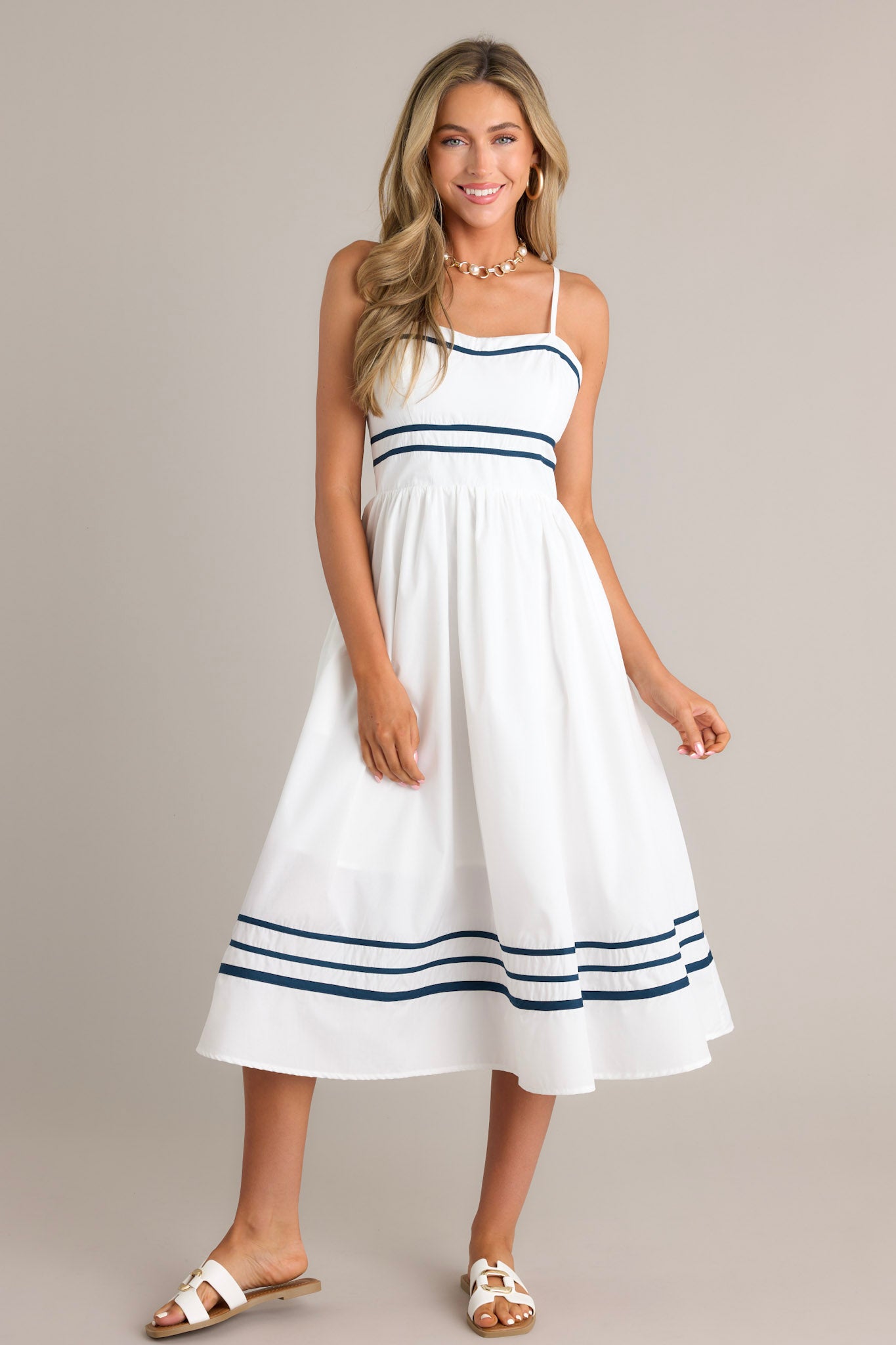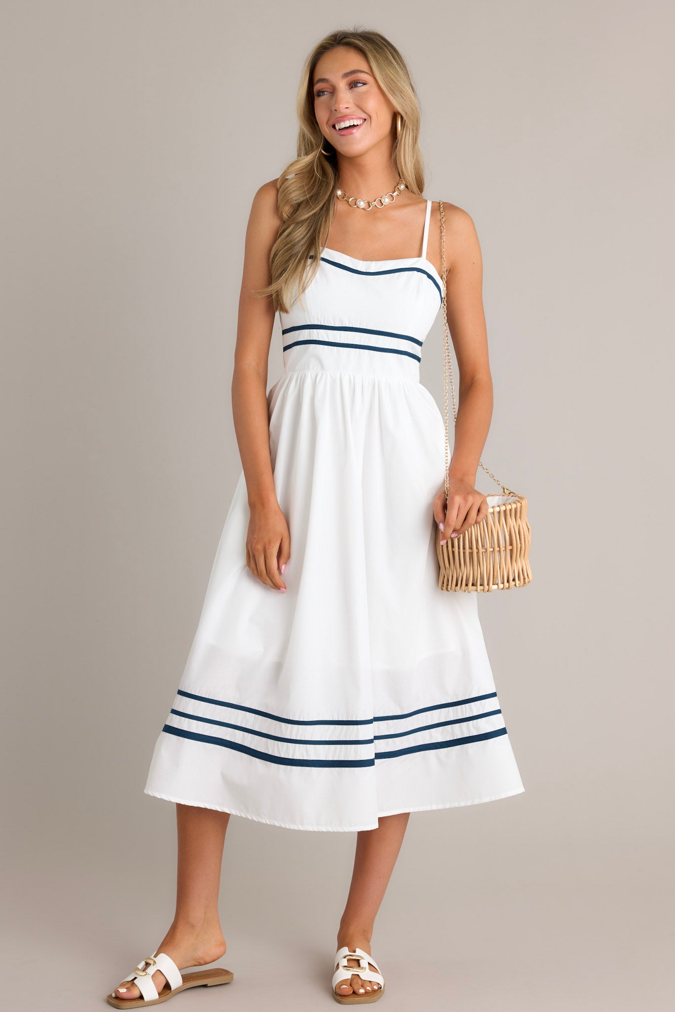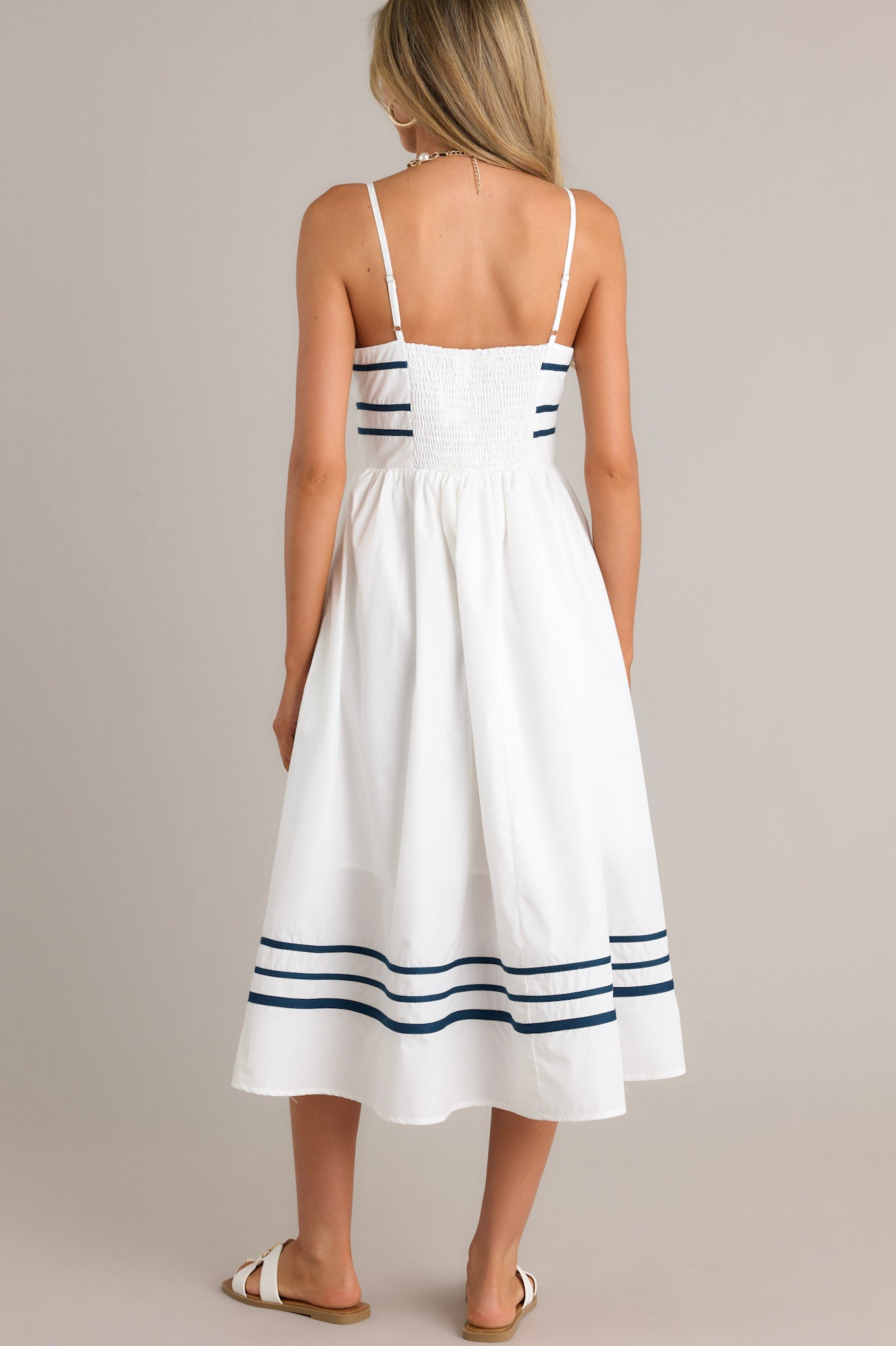 Set sail in style with our Maritime Majesty Midi Dress. Made from a luxurious ivory fabric, this dress is perfect for any occasion. With a midi length, it's both elegant and versatile. So whether you're hitting the beach or attending a yacht party, this dress has got you covered. Bon voyage! This ivory midi dress features a slight sweetheart neckline, navy trim, thin adjustable straps, a smocked back insert, an navy striped waist, functional hip pockets, and a navy striped hemline.