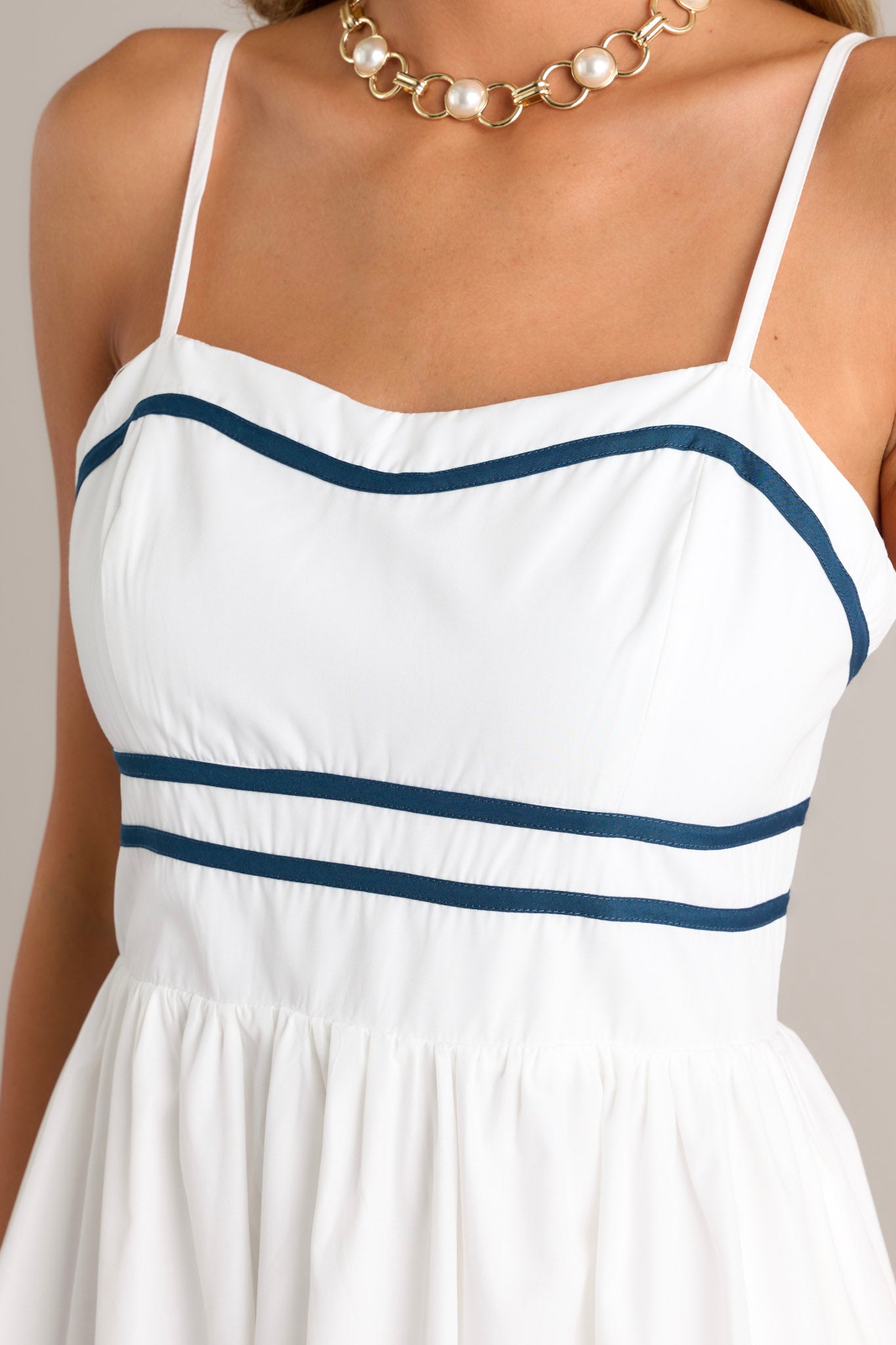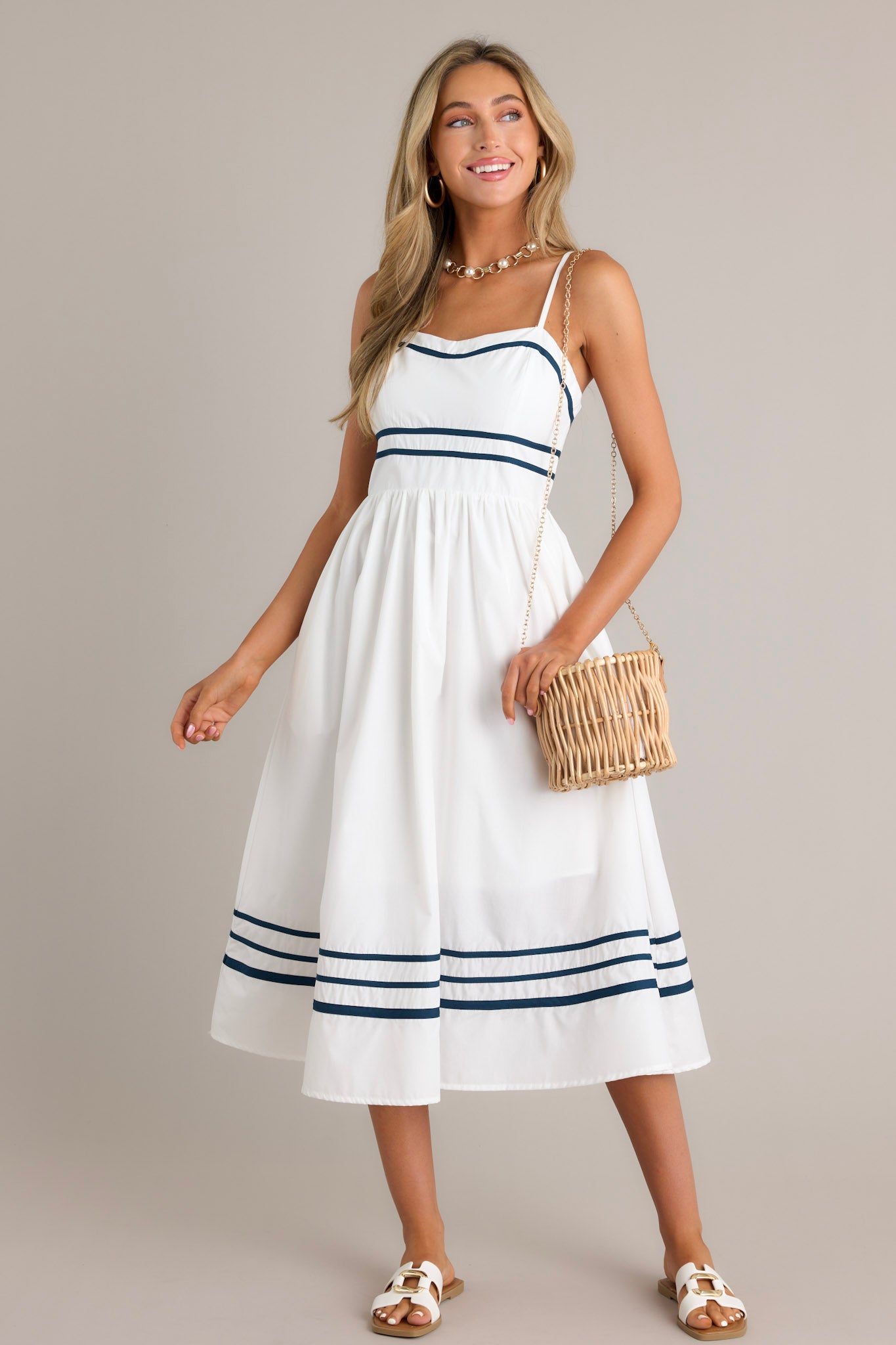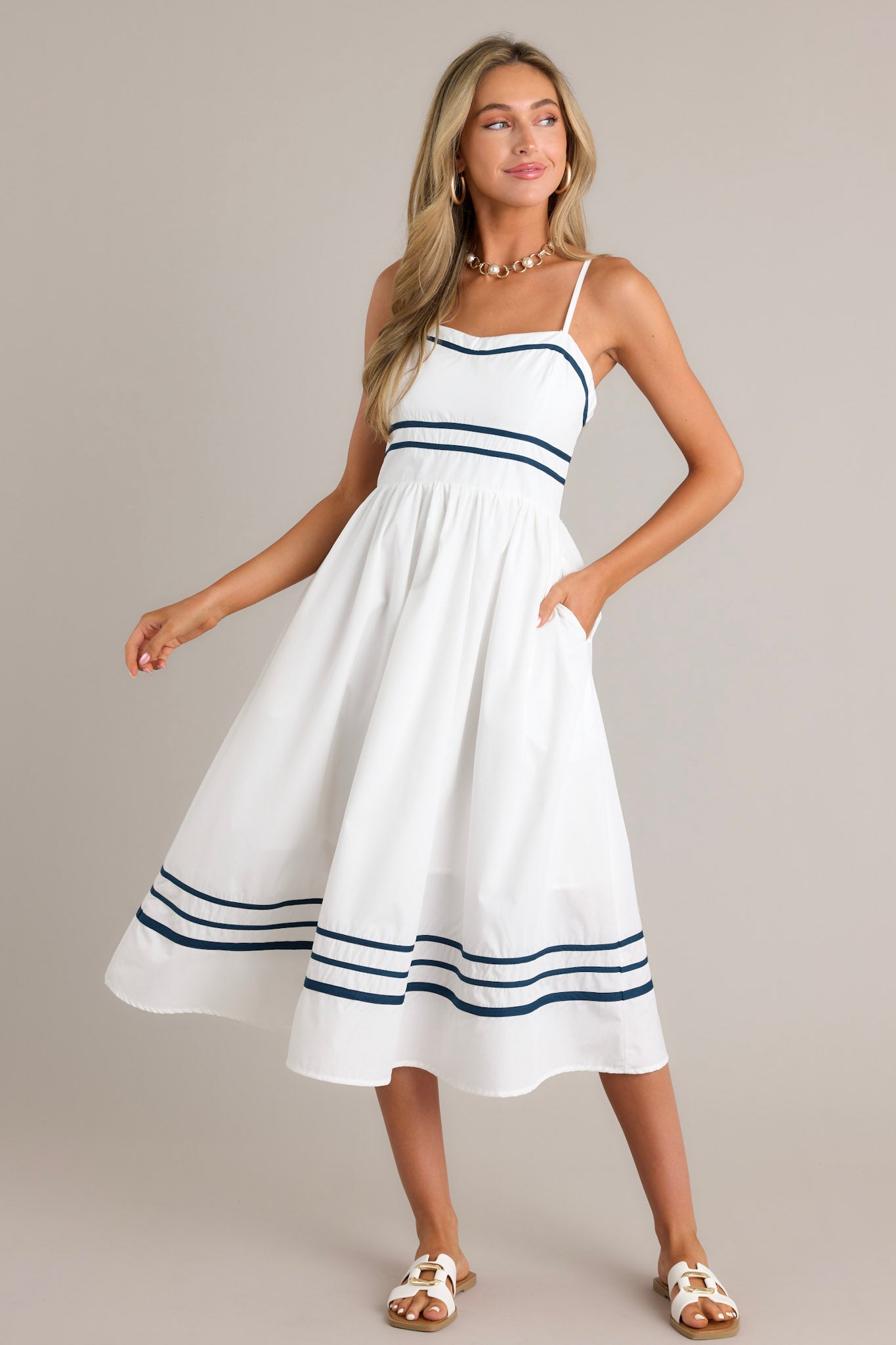 Set sail in style with our Maritime Majesty Midi Dress. Made from a luxurious ivory fabric, this dress is perfect for any occasion. With a midi length, it's both elegant and versatile. So whether you're hitting the beach or attending a yacht party, this dress has got you covered. Bon voyage! This ivory midi dress features a slight sweetheart neckline, navy trim, thin adjustable straps, a smocked back insert, an navy striped waist, functional hip pockets, and a navy striped hemline.
