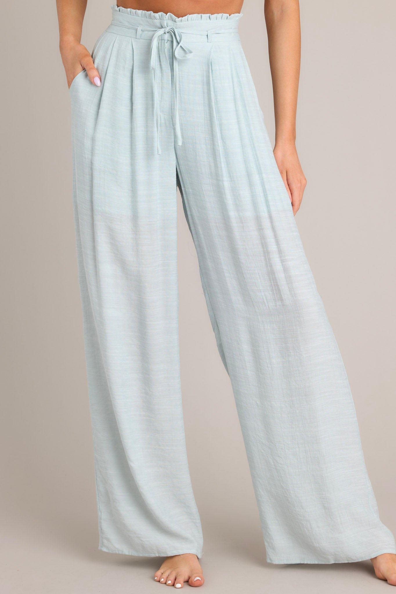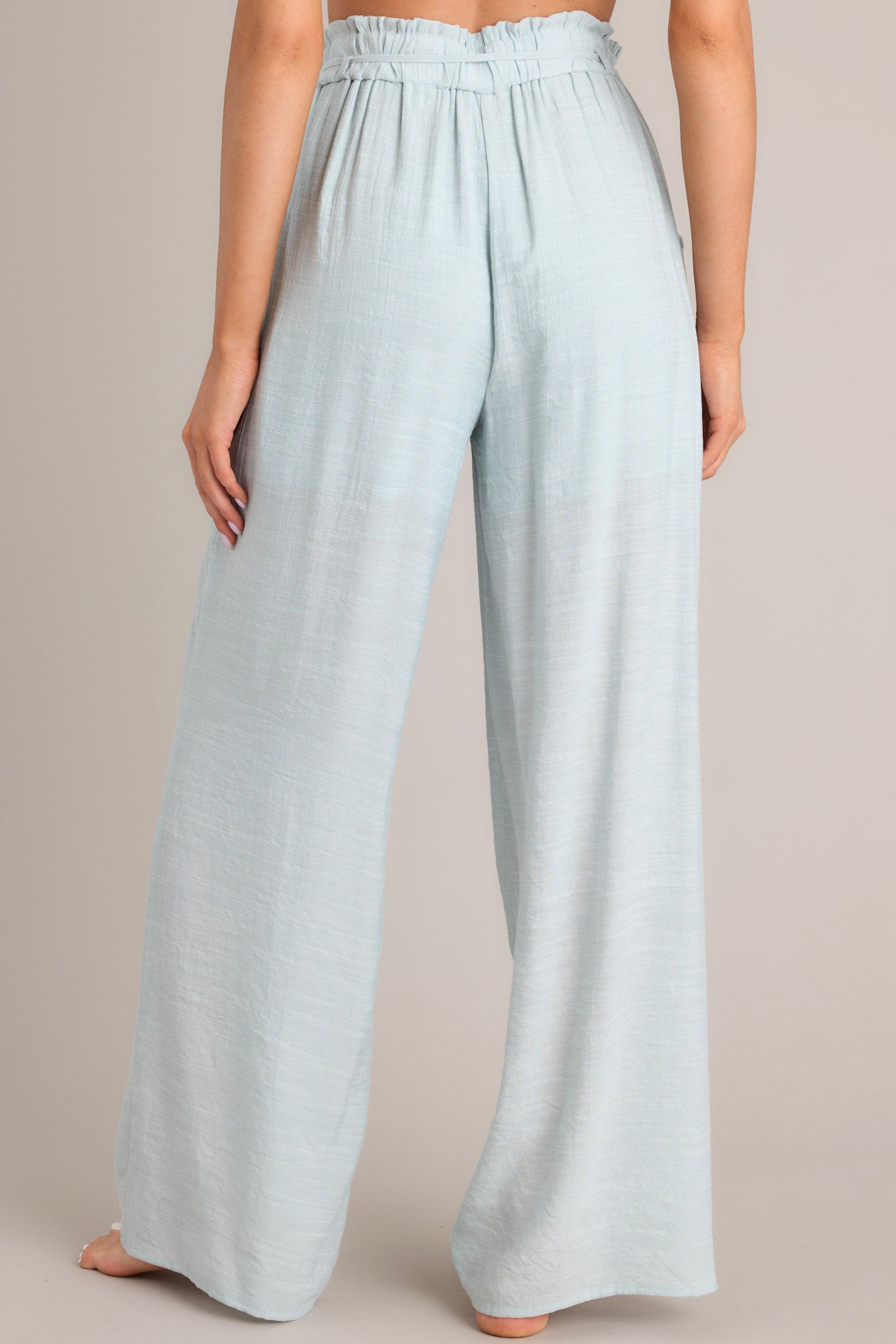 Introducing our Meadow Glow Seafoam Wide Leg Pants! These pants will light up your wardrobe with their playful color and comfortable fit. Perfect for a casual day out or a fun night in, these pants will have you feeling confident and stylish. These pants feature a high waisted design, a self-tie closure that doubles as a belt, belt loops, functional hip pockets, a lightweight fabric, and a wide leg.